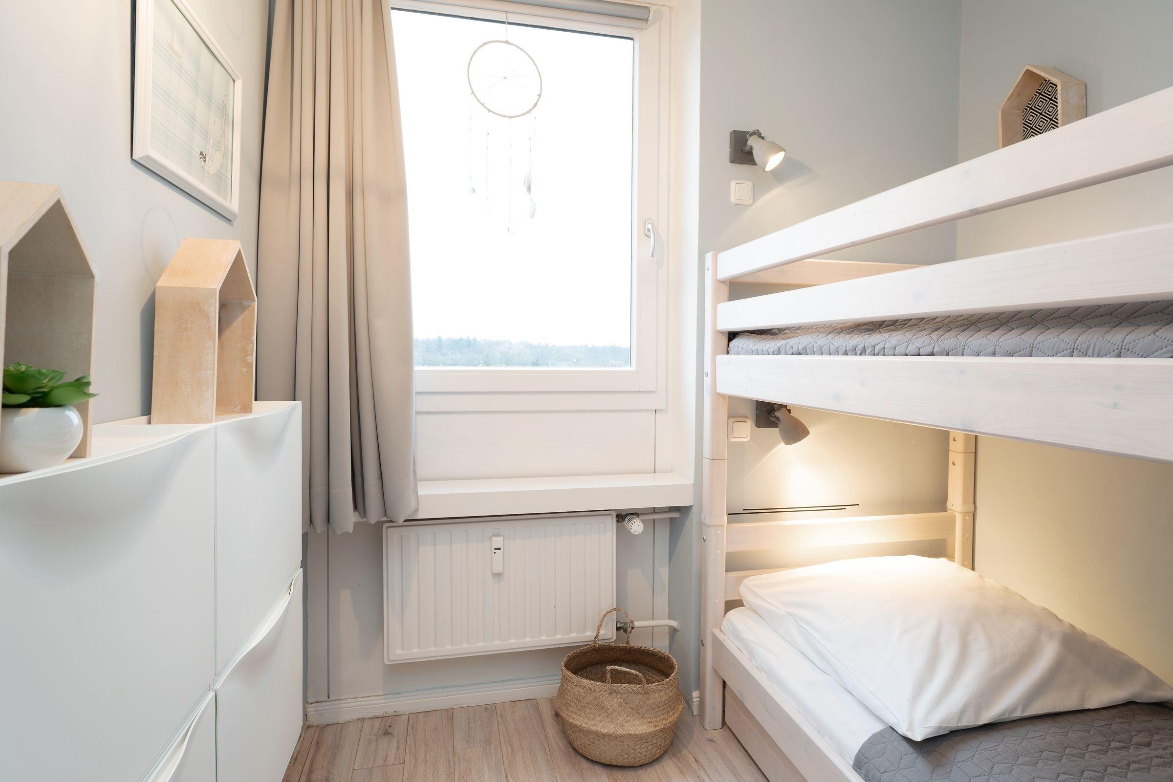 Schlafzimmer 2: 1 Etagenbett (2x 90x200 cm), Kleiderschrank, Verdunkelung (Rollos)