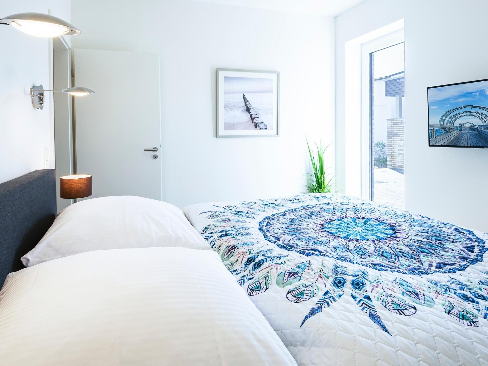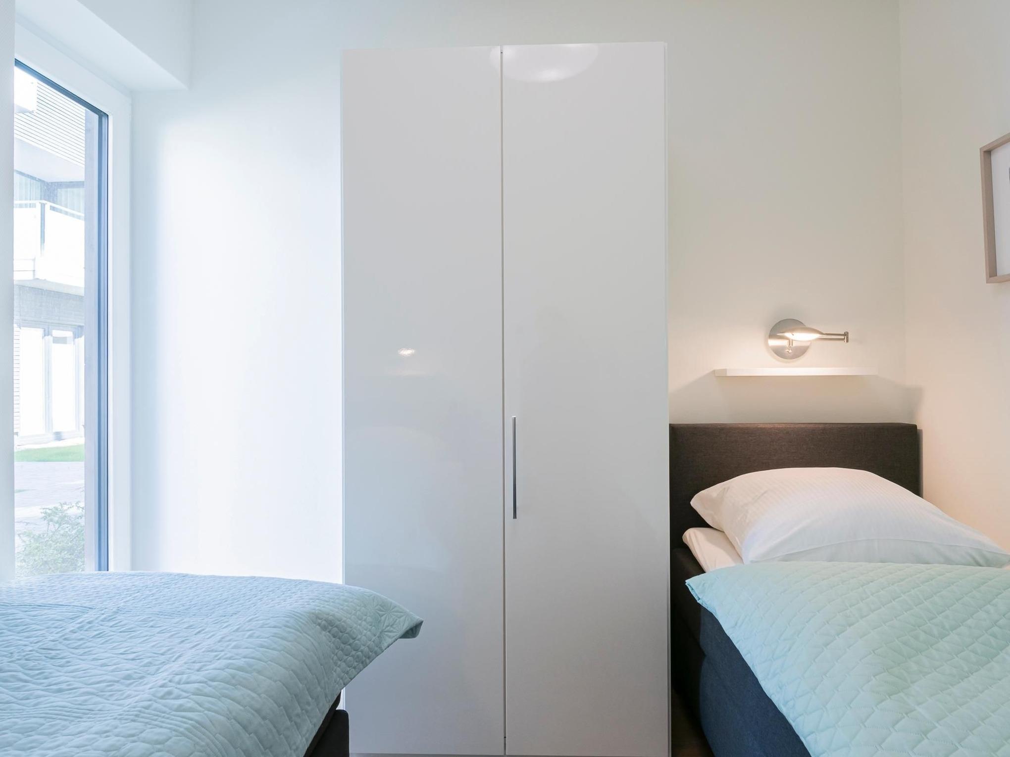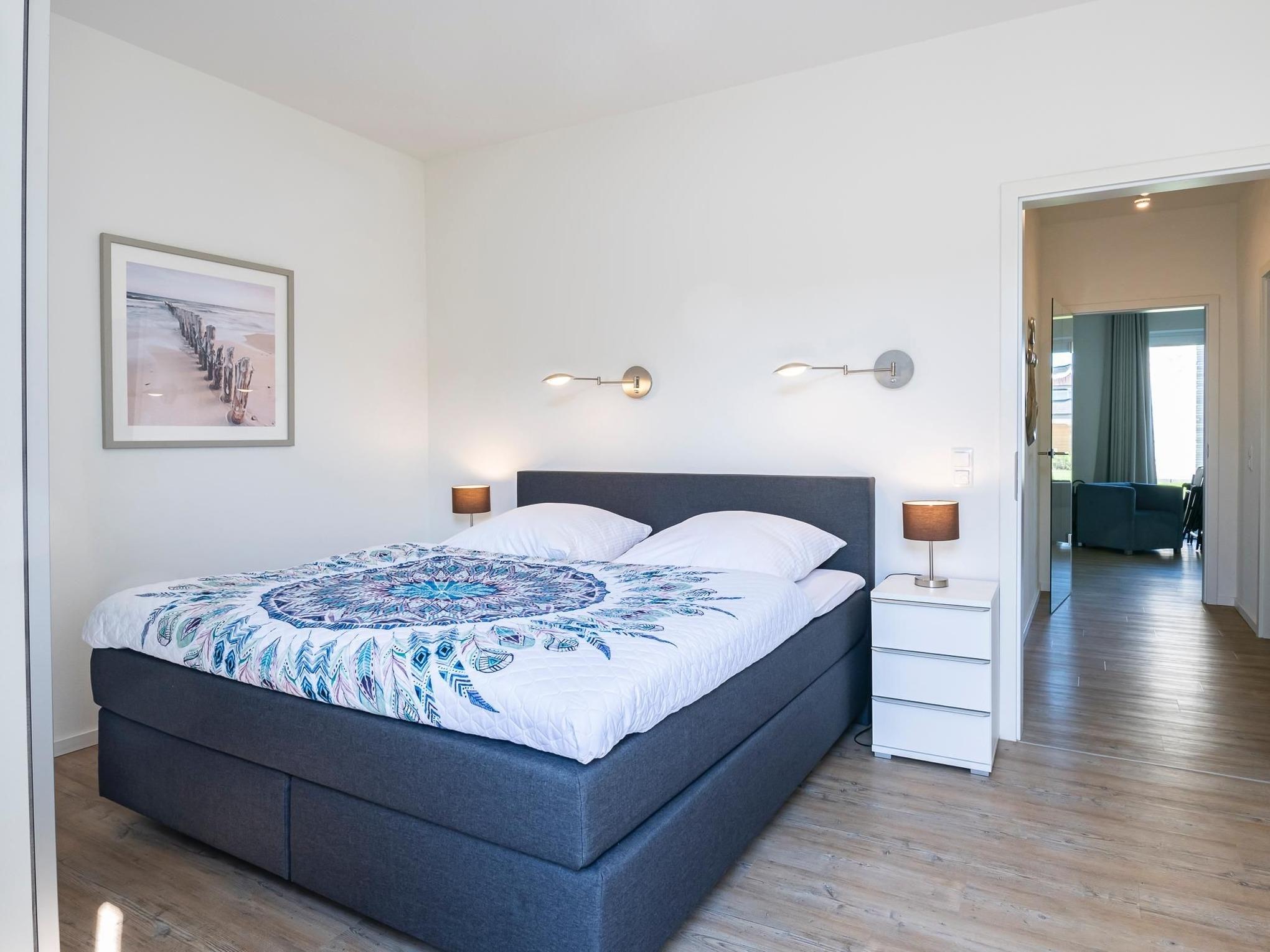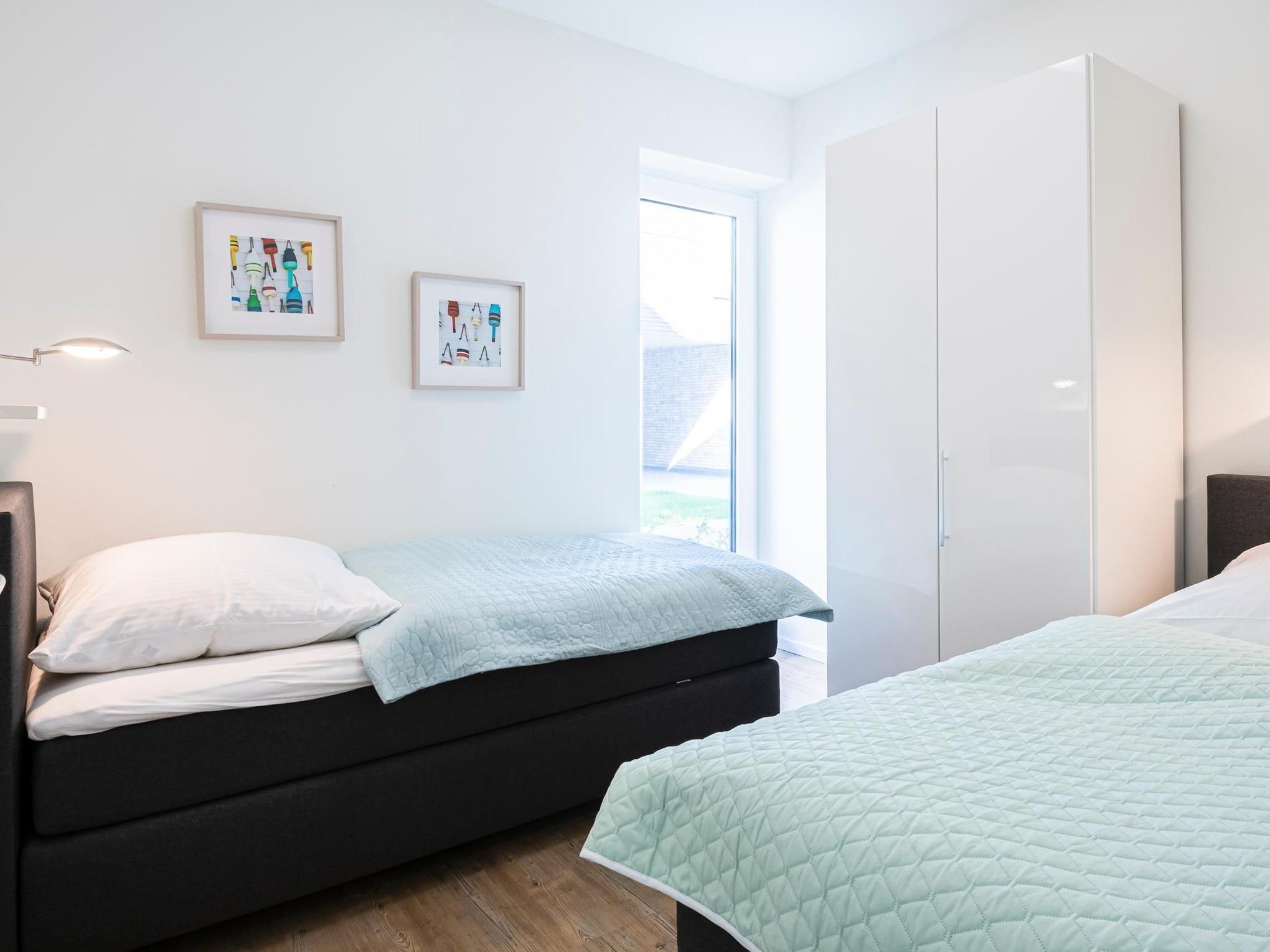 Ein Schlafzimmer verfügt über ein bequemes Boxspringbett (ca. 180x200 cm) und zusätzliches TV-Gerät, das zweite Schlafzimmer ist mit 2 Einzelbetten (90x200 cm) ausgestattet. Für die Kleinen stehen ein Kinderreisebett sowie eine Kinderhochstuhl kostenfrei zur Verfügung.