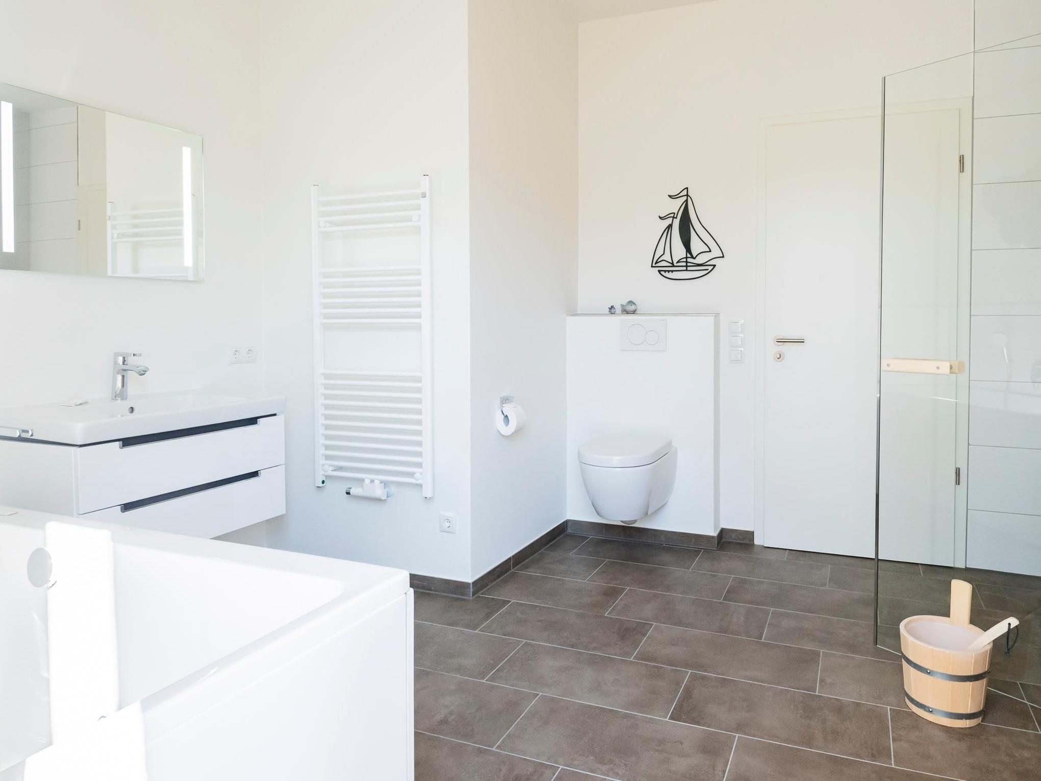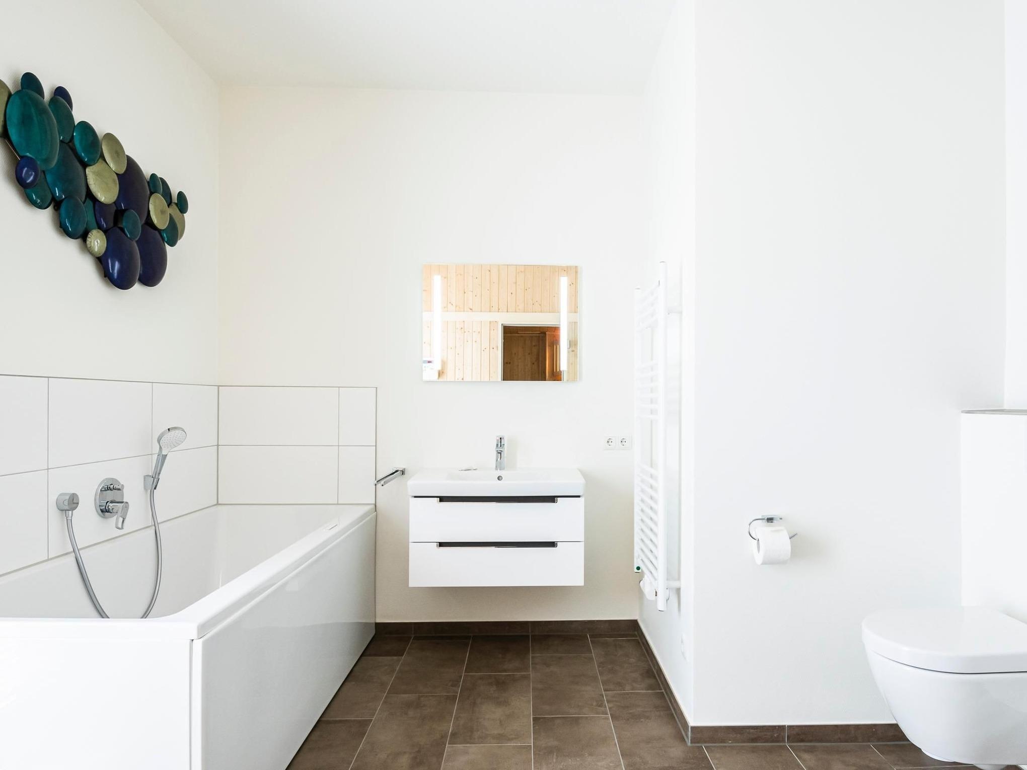 Das großzügige Bad mit Whirlwanne, bodengleicher Dusche und Sauna bietet auch für kältere Tage Wärme und Entspannung. Ein Gäste-WC rundet das Angebot ab.