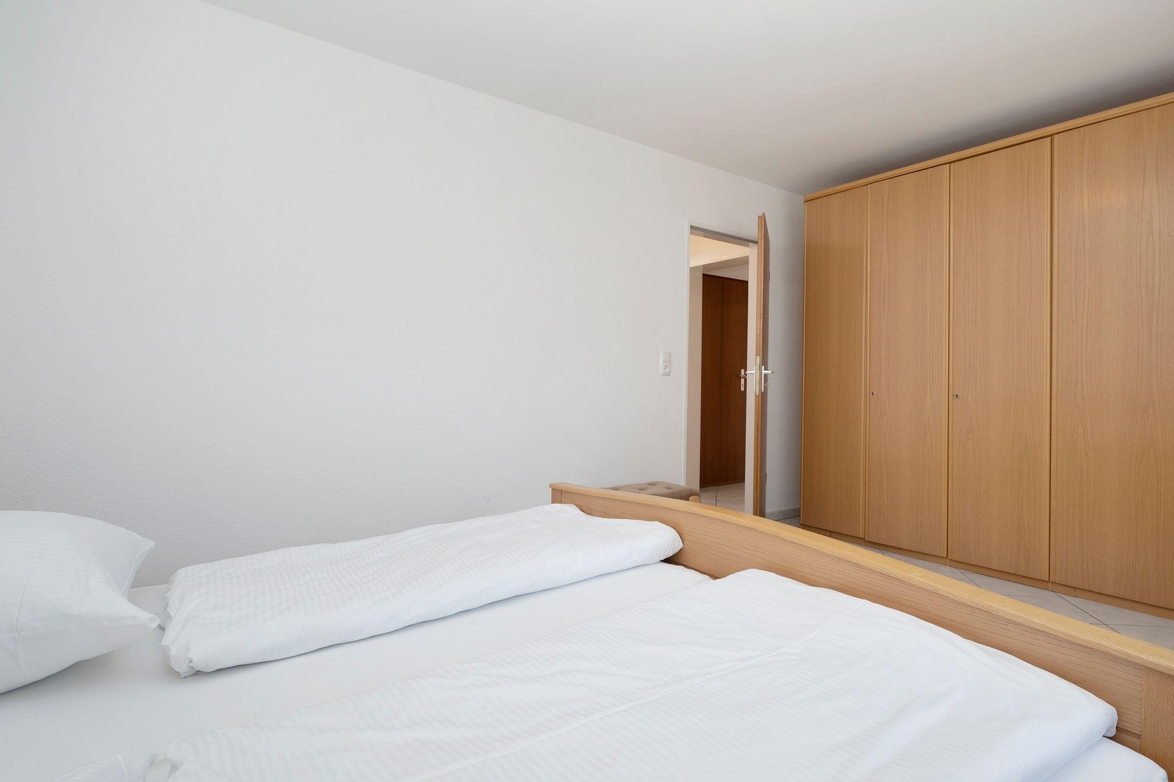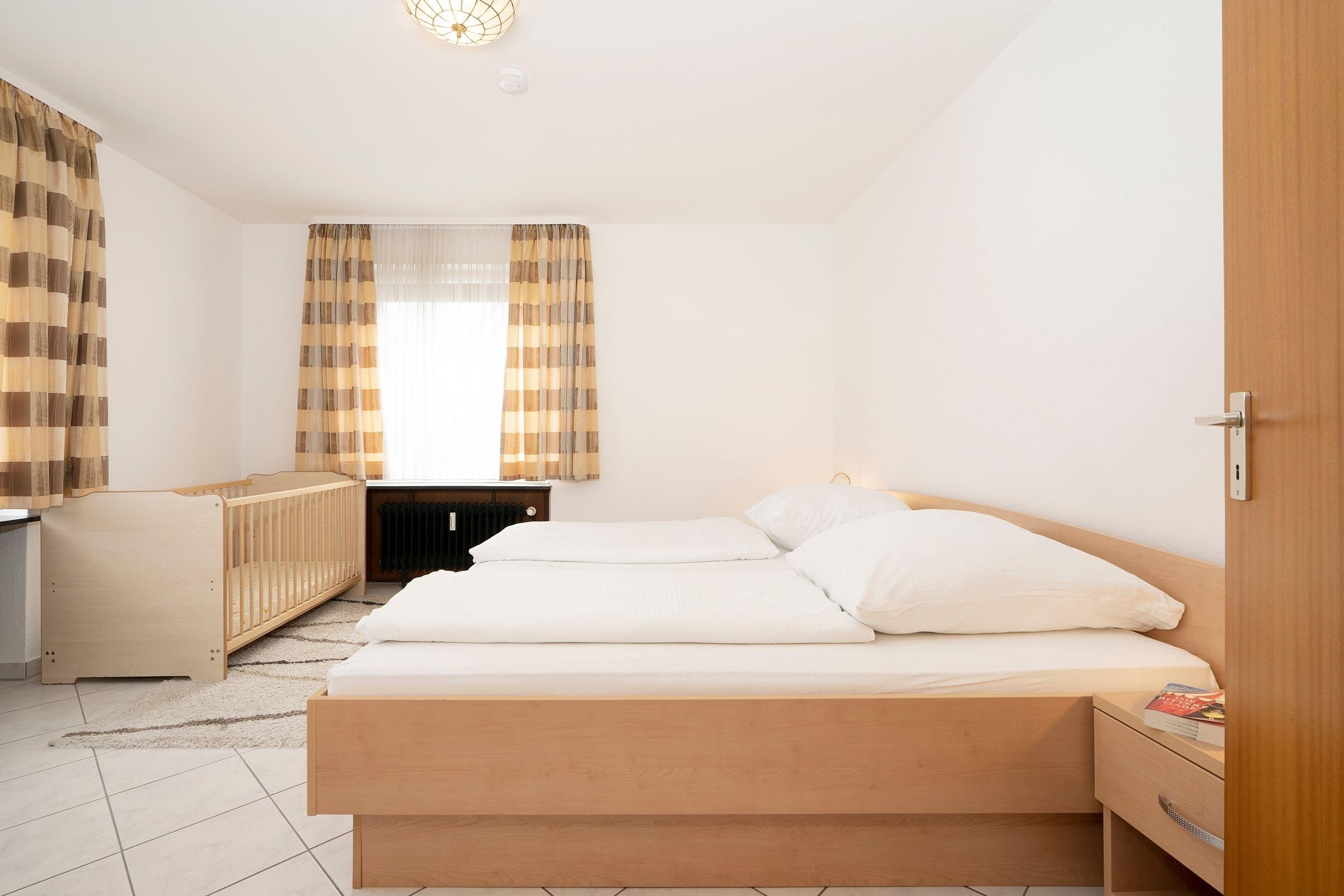 Schlafzimmer 2: 1 Doppelbett (2x 100x200cm), verstellbares Lattenrost, Kleiderschrank, Gitterkinderbettchen (70x140 cm)