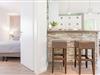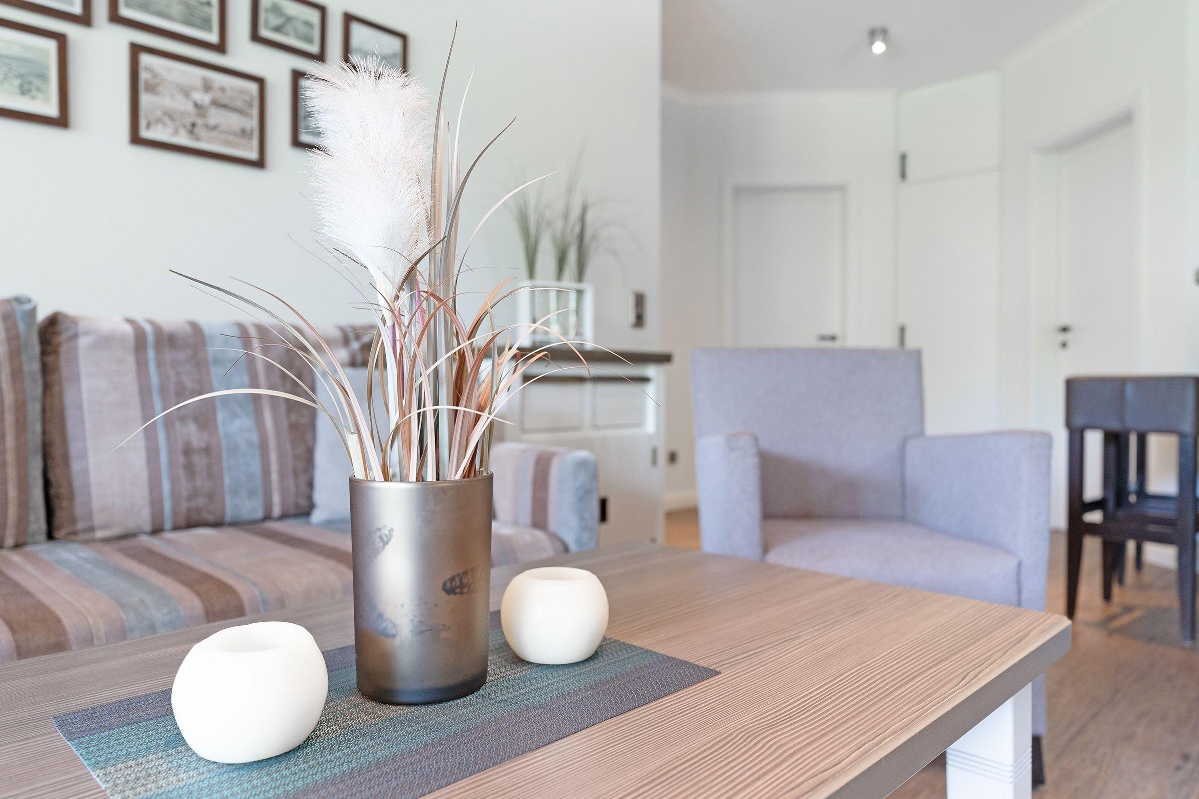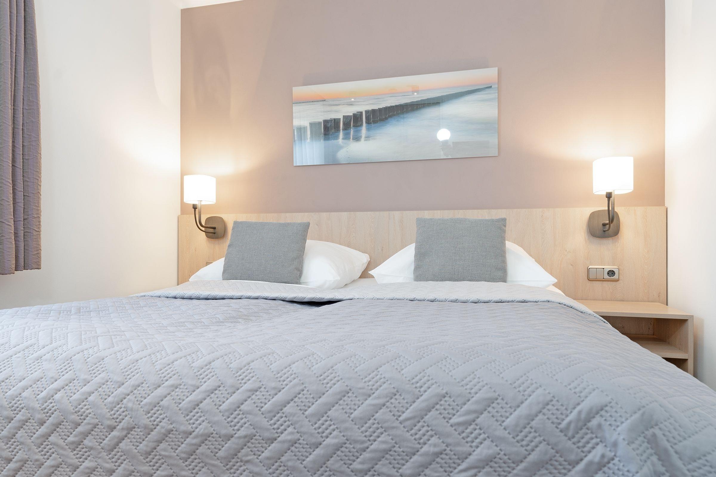 Sie suchen das Besondere am Ostseestrand? Dann werden Sie sich in dieser zauberhaften Ferienunterkunft Deichblick garantiert wohlfühlen. Sie befindet sich im Wohnpark Kaiserhof – der Strand ist nur rund 65 Meter entfernt. Der helle Wohnbereich punktet mit seiner schicken, farblich perfekt abgestimmten Einrichtung. Die schicke Polstergarnitur lädt zum gemütlichen Verweilen vor dem TV-Gerät ein. Für die Nacht lässt sich das Sofa bei Bedarf in ein bequemes Doppelbett (ca. 160x212 cm) verwandeln. Vom Wohnbereich aus können Sie die großzügige, überdachte Terrasse (12 m²) betreten, die Richtung See zeigt und einen traumhaften Blick ins Grüne gewährt. Hier sitzen Sie nicht nur bei Sonnenschein gut geschützt. Das wird bestimmt Ihr neuer Lieblingsplatz. Zurück im Wohnbereich: Die moderne Küche mit Geschirrspüler und Nespresso-Maschine ist offen gestaltet und wird mit ihrer guten Ausstattung jeden Hobby-Koch zum Lächeln bringen. Ein Tresen sorgt als Raumteiler für ein angenehmes Wohngefühl. An den Fenstern steht Ihnen eine kleine Essecke zur Verfügung. Das Schlafzimmer verfügt über ein Boxspringbett (2x 90x200 cm), einen Einbauschrank sowie über ein zusätzliches TV-Gerät. Das komfortable, barrierearme Duschbad mit Fenster, ebenerdiger Dusche, Handtuchwärmer und Schminkspiegel verspricht einen wundervollen Start in den neuen Tag.