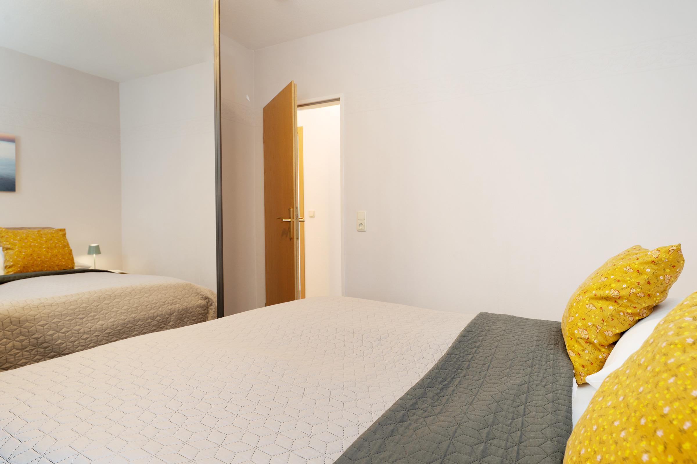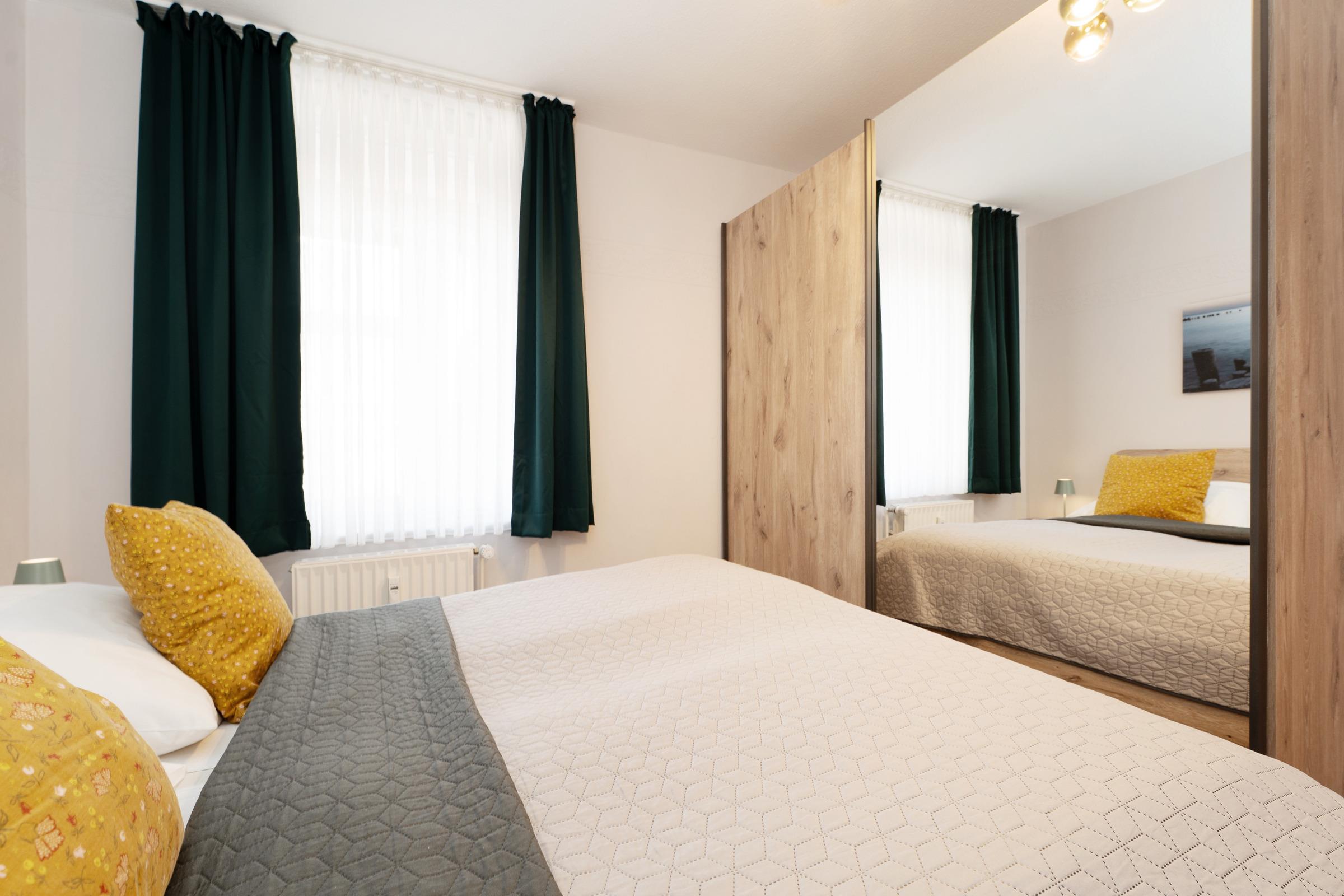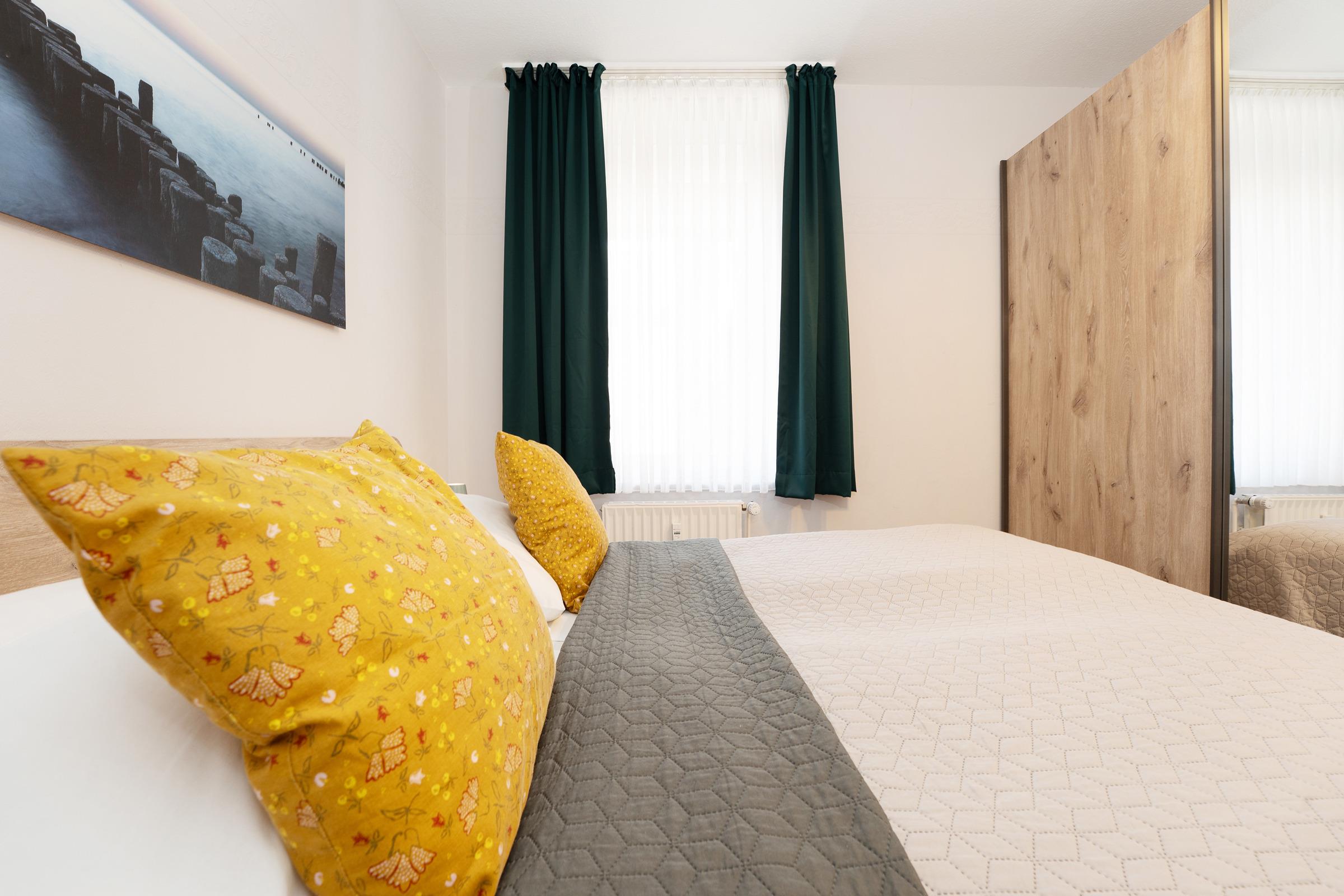Schlafzimmer: 1 Doppelbett (2x 90x200 cm), Kleiderschrank, Verdunkelung (Innenrollo, Vorhang), kein Platz für ein Kinderbett