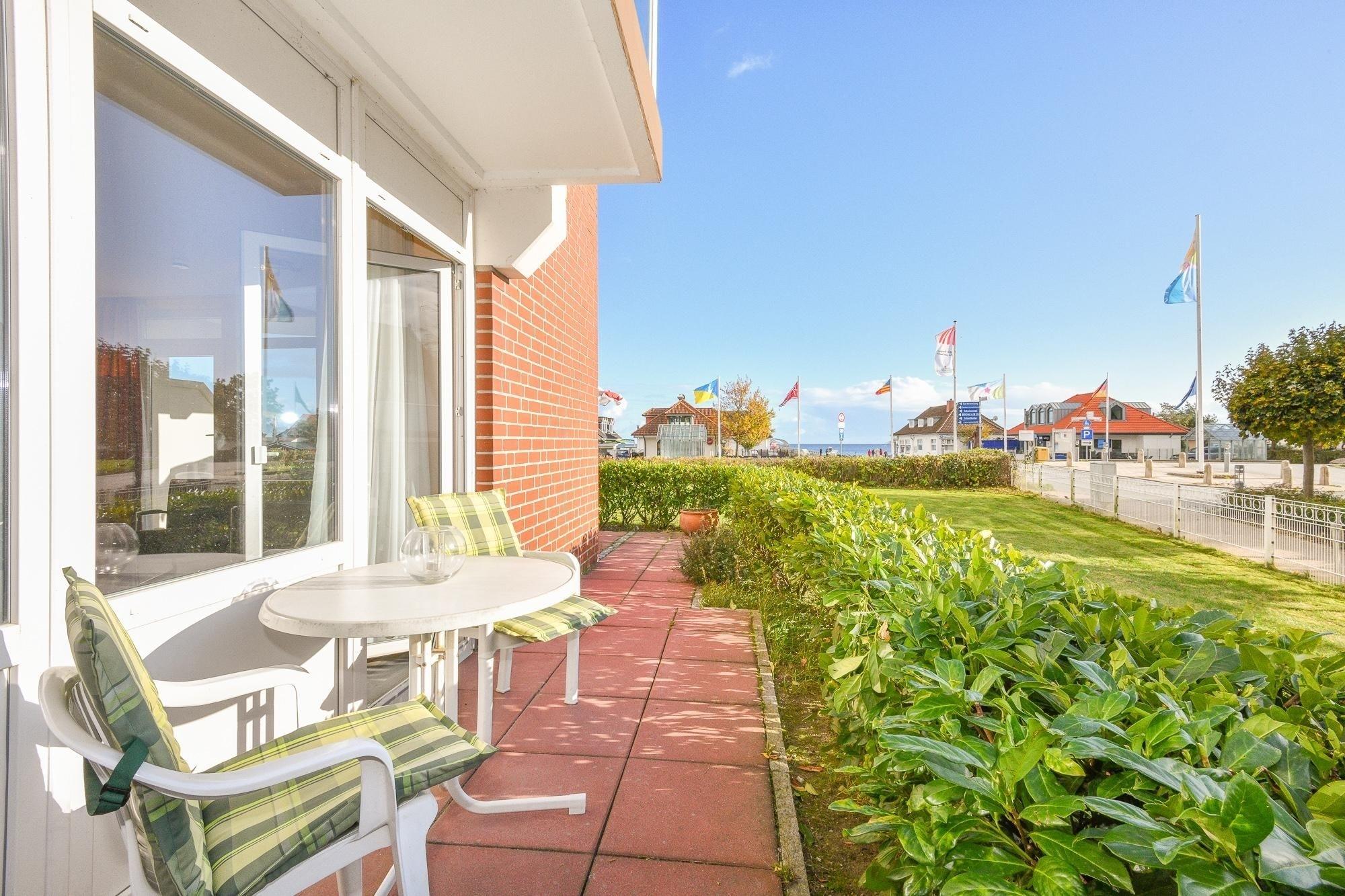 Moderne 2-Zimmer-Ferienwohnung mit Terrasse und Seeblick in Kellenhusen, nur 200 m vom Strand entfernt.