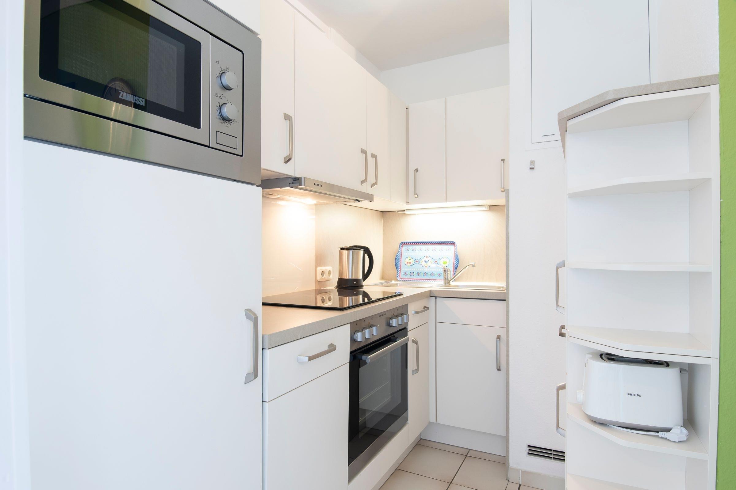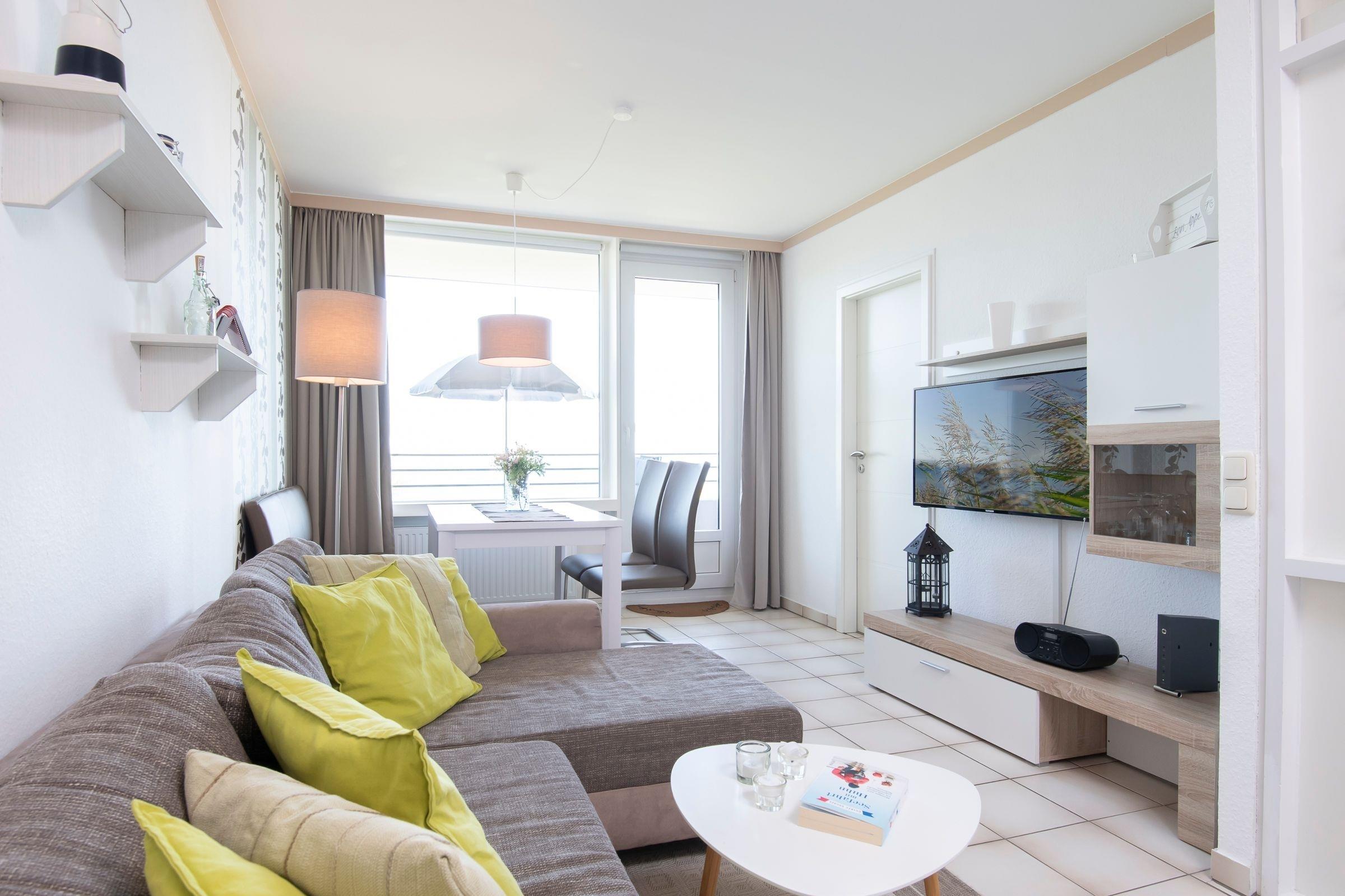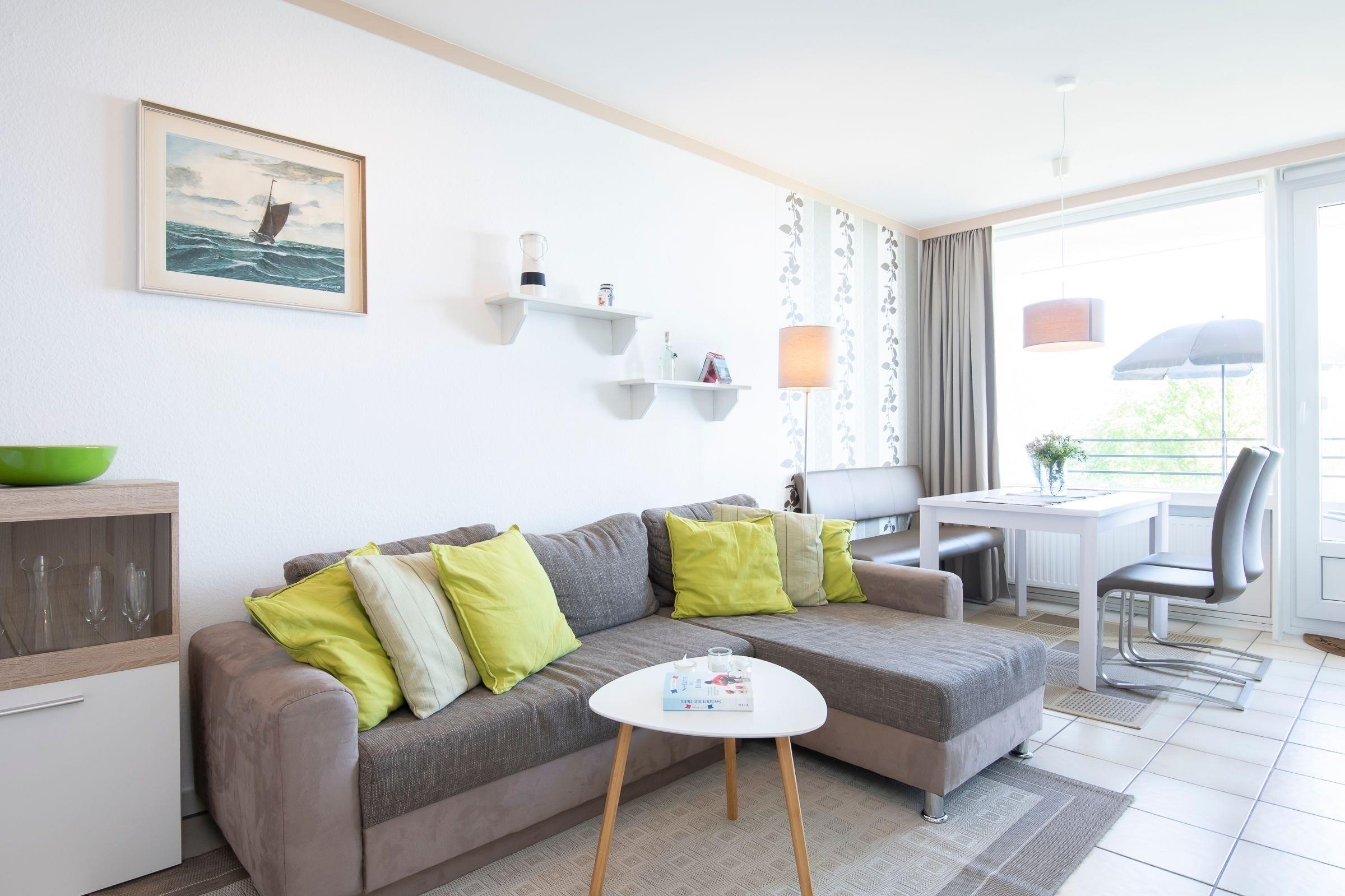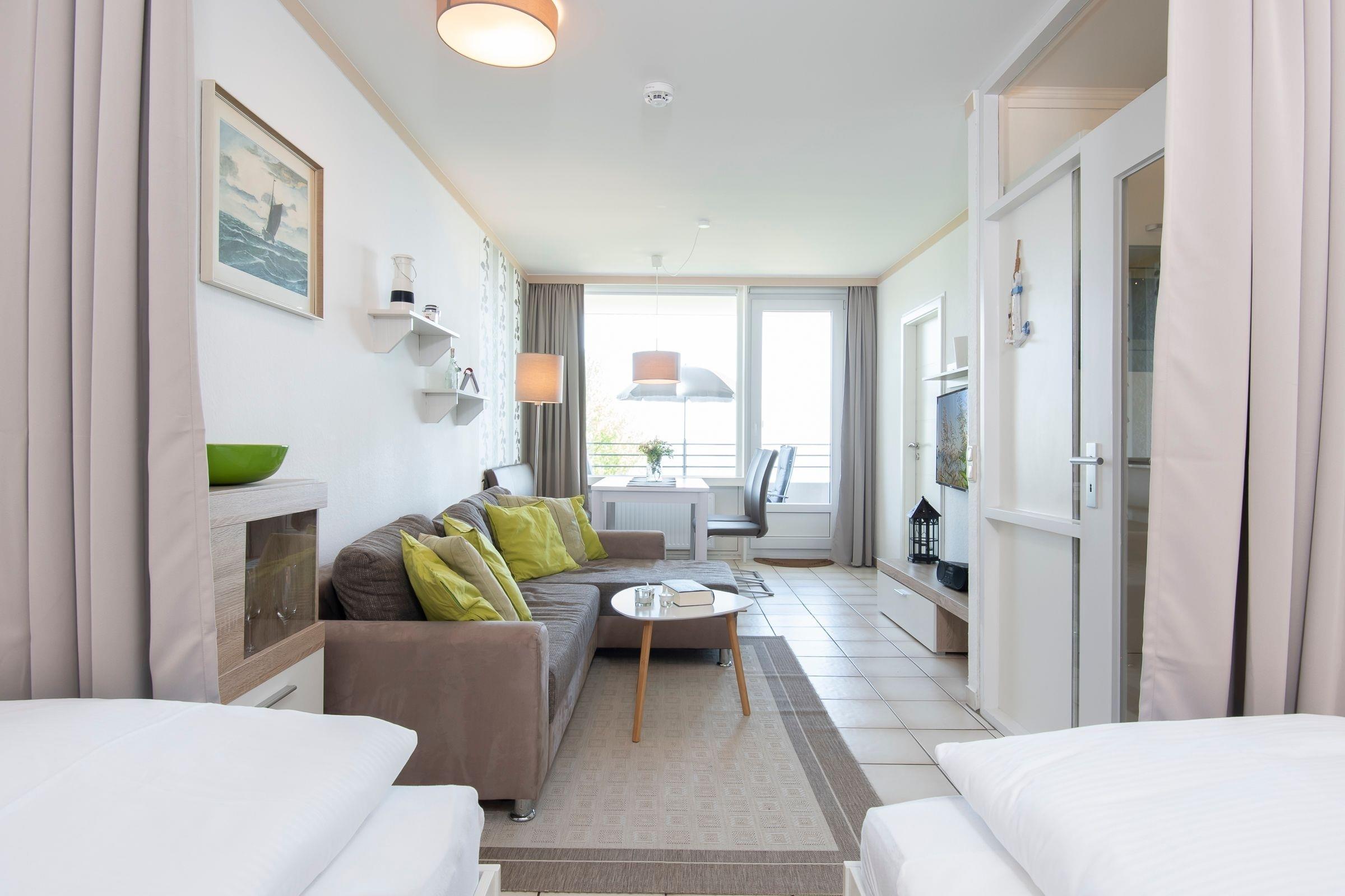 Lust auf Ostseeblick? Dann sind Sie hier genau richtig! Der helle, moderne Wohn-/Schlafbereich bildet den Mittelpunkt dieser schönen Ferienwohnung. Verbringen Sie entspannte Stunden vor dem Flachbild-TV auf dem gemütlichen Ecksofa oder genießen Sie ein leckeres Essen am Esstisch mit Blick auf das Meer. Durch Vorhänge abgegrenzt finden Sie 2 Einzelbetten (2x 90x200 cm), die zum Schlafen und Träumen einladen. Bei Bedarf kann ein Urlaubsgast in ein Einzelbett (90x200 cm) in das separate Schlafzimmer ausweichen. Hier steht auch ein Kleiderschrank für Ihre Urlaubsgarderobe. In der separaten, gut ausgestatteten Küche mit Geschirrspüler finden Sie alles, um sich im Urlaub selbst zu verwöhnen. Ein gepflegtes Duschbad (exkl. Waschmaschine) komplettiert die Ausstattung dieser niedlichen Ferienwohnung.
