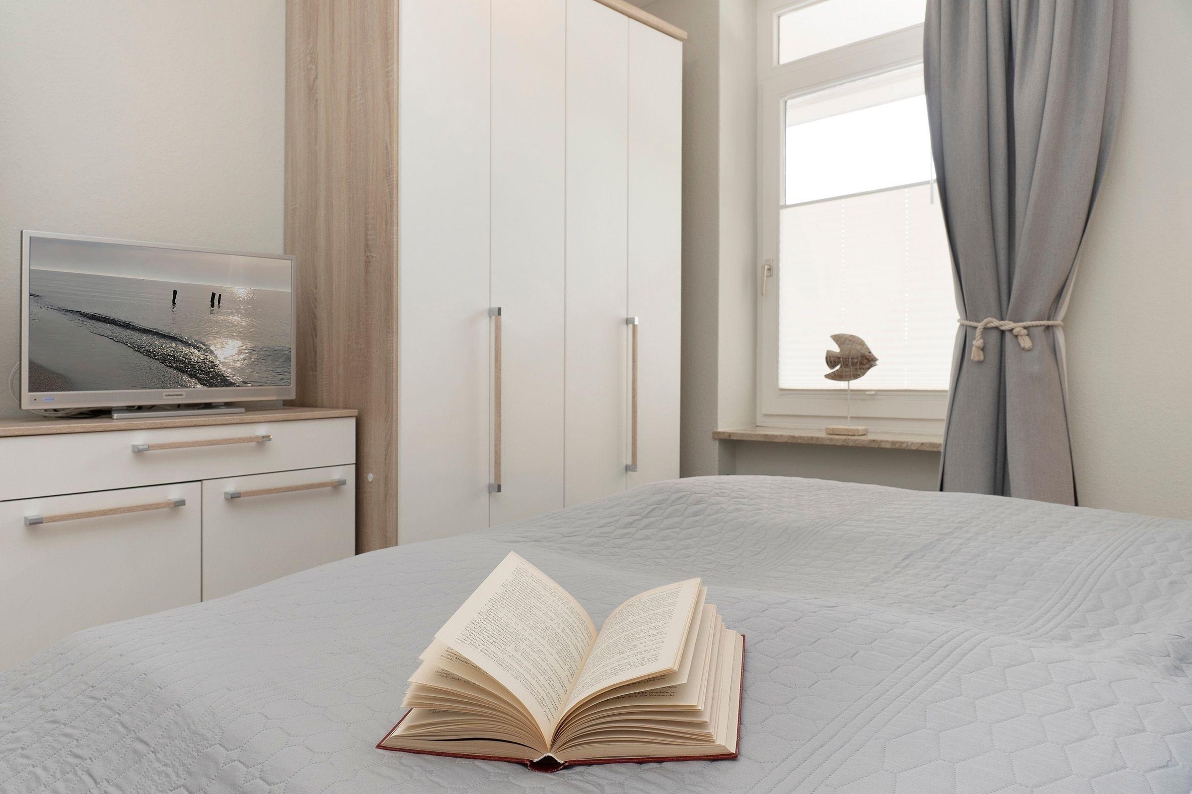 Schlafzimmer: 1 Doppelbett (2x 90x200 cm), TV, Kleiderschrank, Verdunkelung (Vorhang)