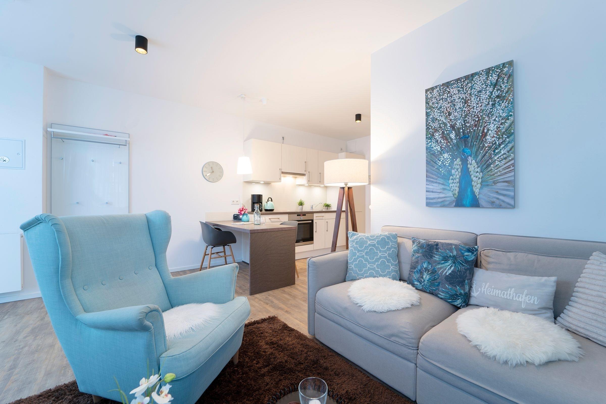 Ankommen und wohlfühlen: Die kleine, feine Ferienwohnung begrüßt Sie mit einer gemütlichen Sofa-Ecke zum Entspannen, Träumen oder auch zum Fernsehschauen. Verbringen Sie hier gemütliche Stunden zu zweit. Von hier aus können Sie auch auf die möblierte Terrasse treten und den Abend bei einem Glas Wein ausklingen lassen. Die gut ausgestattete Küche ist offen gestaltet und bietet Ihnen zum Beispiel auch eine Spülmaschine. An einem kleinen Tresen können Sie direkt Platz nehmen und Ihre Speisen genießen. Wunderbar schlafen werden Sie sicher im Schlafzimmer im Boxspringbett (180x200 cm). Auch hier befindet sich ein TV-Gerät. Das großzügige Duschbad verfügt über eine Fußbodenheizung und einen Handtuchwärmer. Eine Waschmaschine steht hier für Sie bereit.