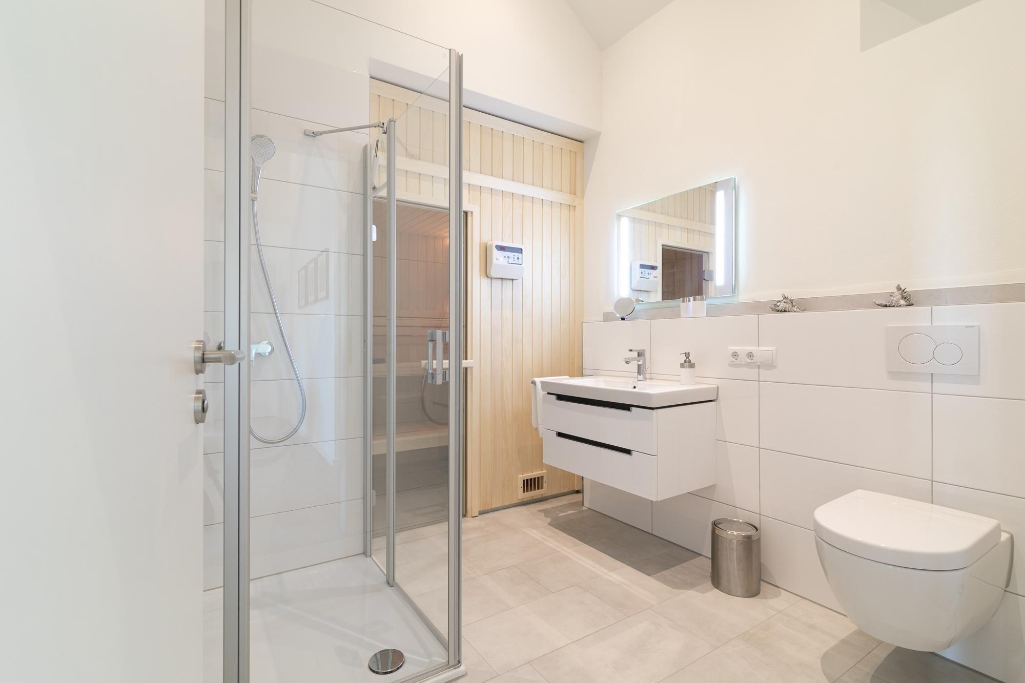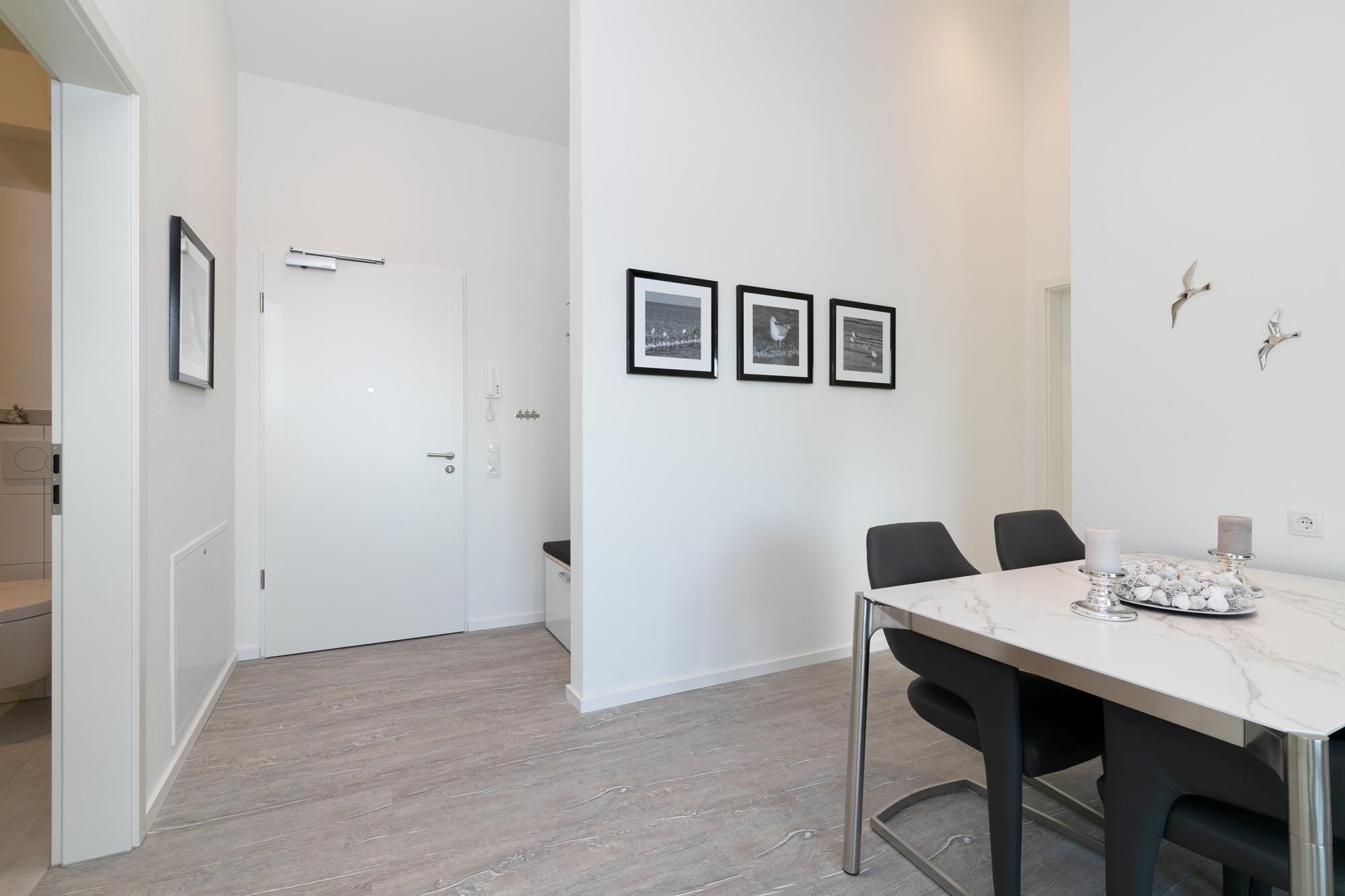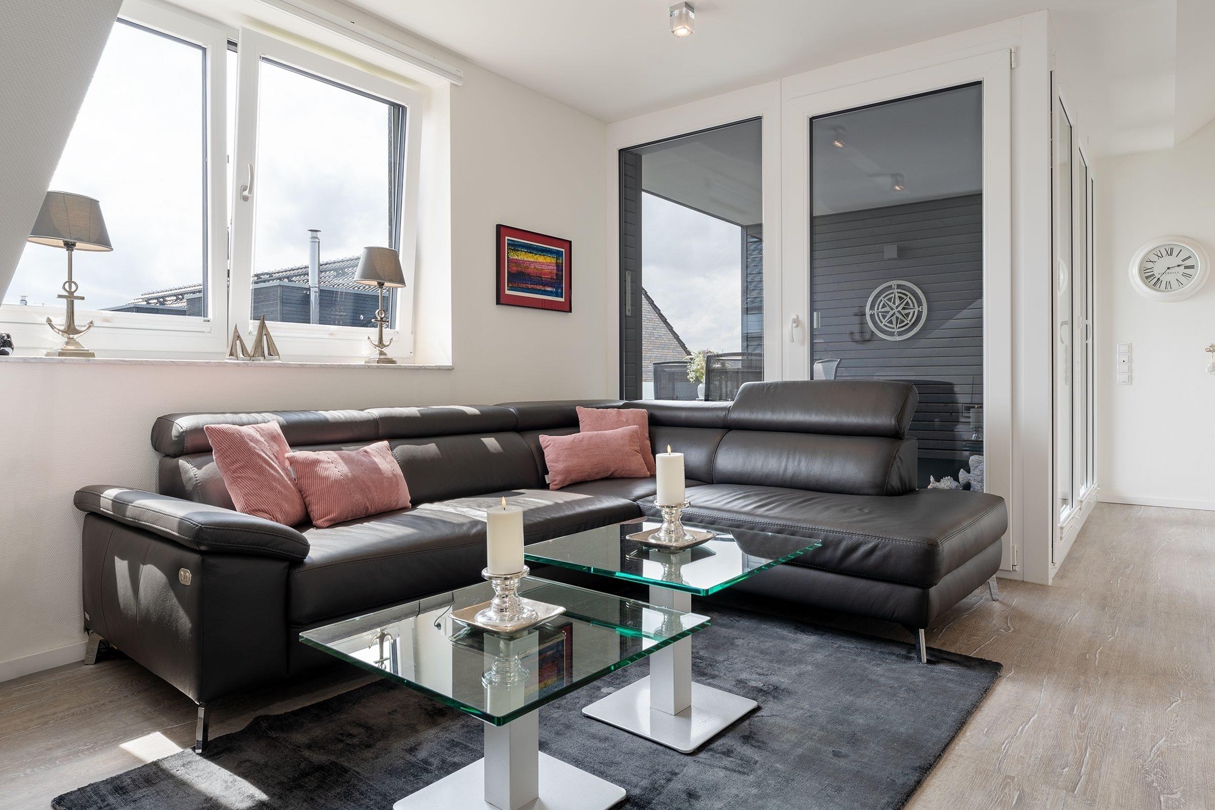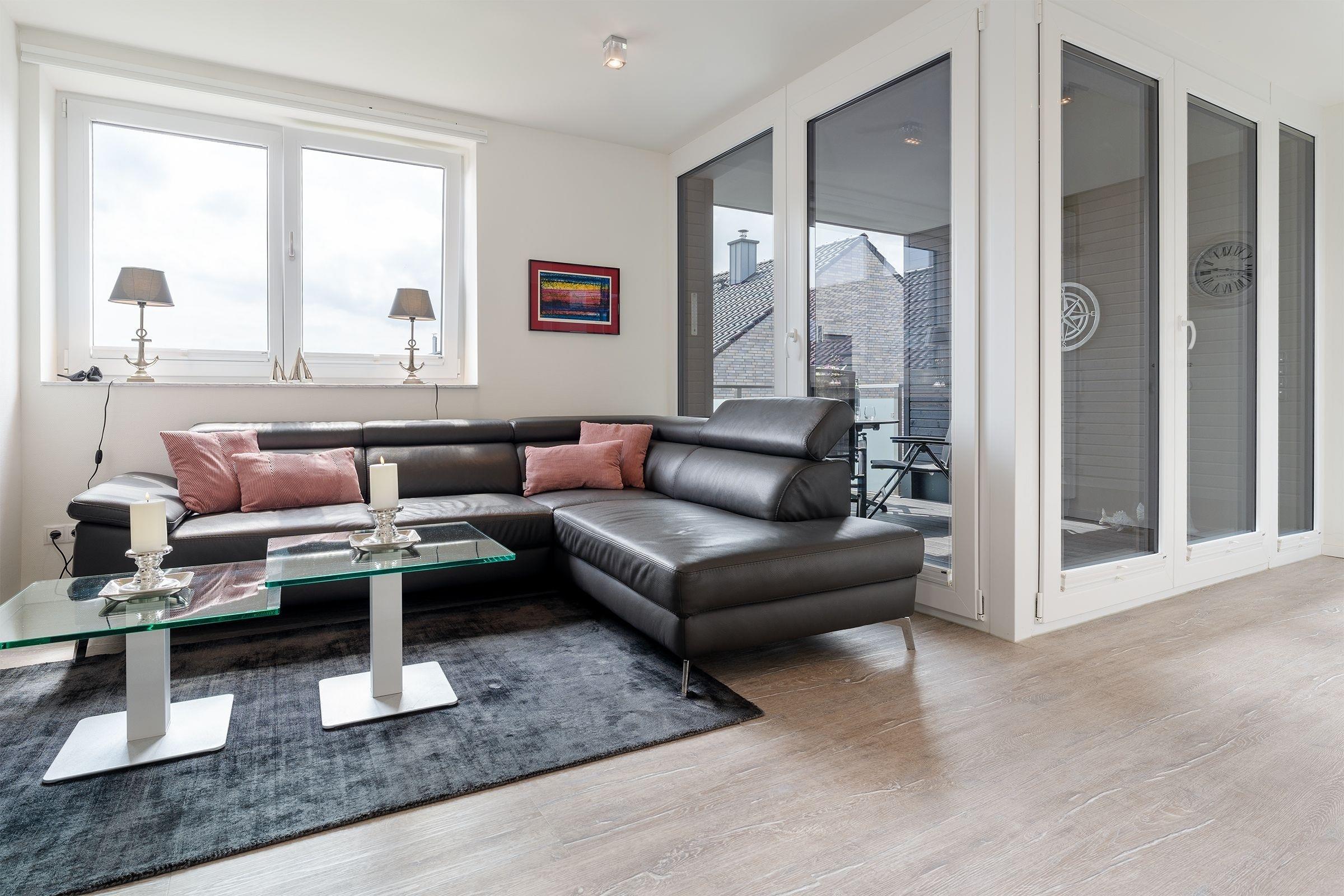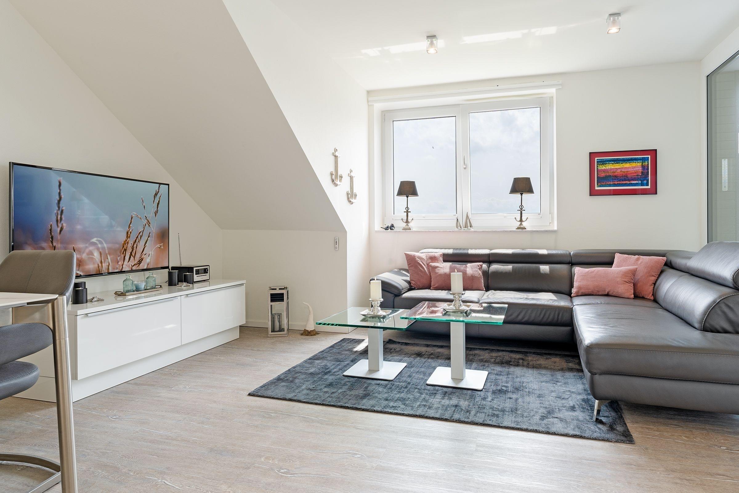 Elegant, maritim und großzügig – genießen Sie Ihren Urlaub in dieser exklusiven Wohnung mit Wohlfühlgarantie. Die Sofa-Landschaft im lichtdurchfluteten Wohn-/Essbereich lädt zu gemütlichen TV-Stunden ein. Einen weiteren Lieblingsplatz bietet die Wohnung mit dem weitestgehend überdachten Balkon. Geschützt und kuschelig können Sie hier wunderbar entspannen, Ihre Ausflugspläne schmieden oder schlemmen. Die zum Wohnbereich offene Küche hat einen Geschirrspüler – und auch insgesamt lässt die gute Ausstattung die Herzen von Hobby-Köchen sicher höher schlagen. Die schöne Essecke bietet Ihnen eine weitere Gelegenheit zum netten Verweilen. Zur Nacht hin stehen Ihnen im Schlafzimmer ein Boxspringbett (180x200 cm) sowie ein weiteres TV-Gerät zur Verfügung. Hier werden Sie himmlisch träumen. Das moderne Duschbad verfügt über eine Sauna, die vor allem an kühlen Tagen für Wärme und Entspannung sorgt. Ein bequemes Plus ist der Personenaufzug im Hause.
