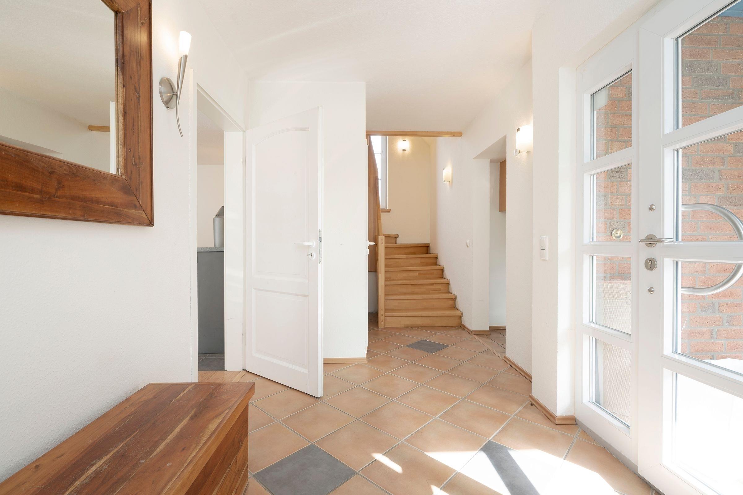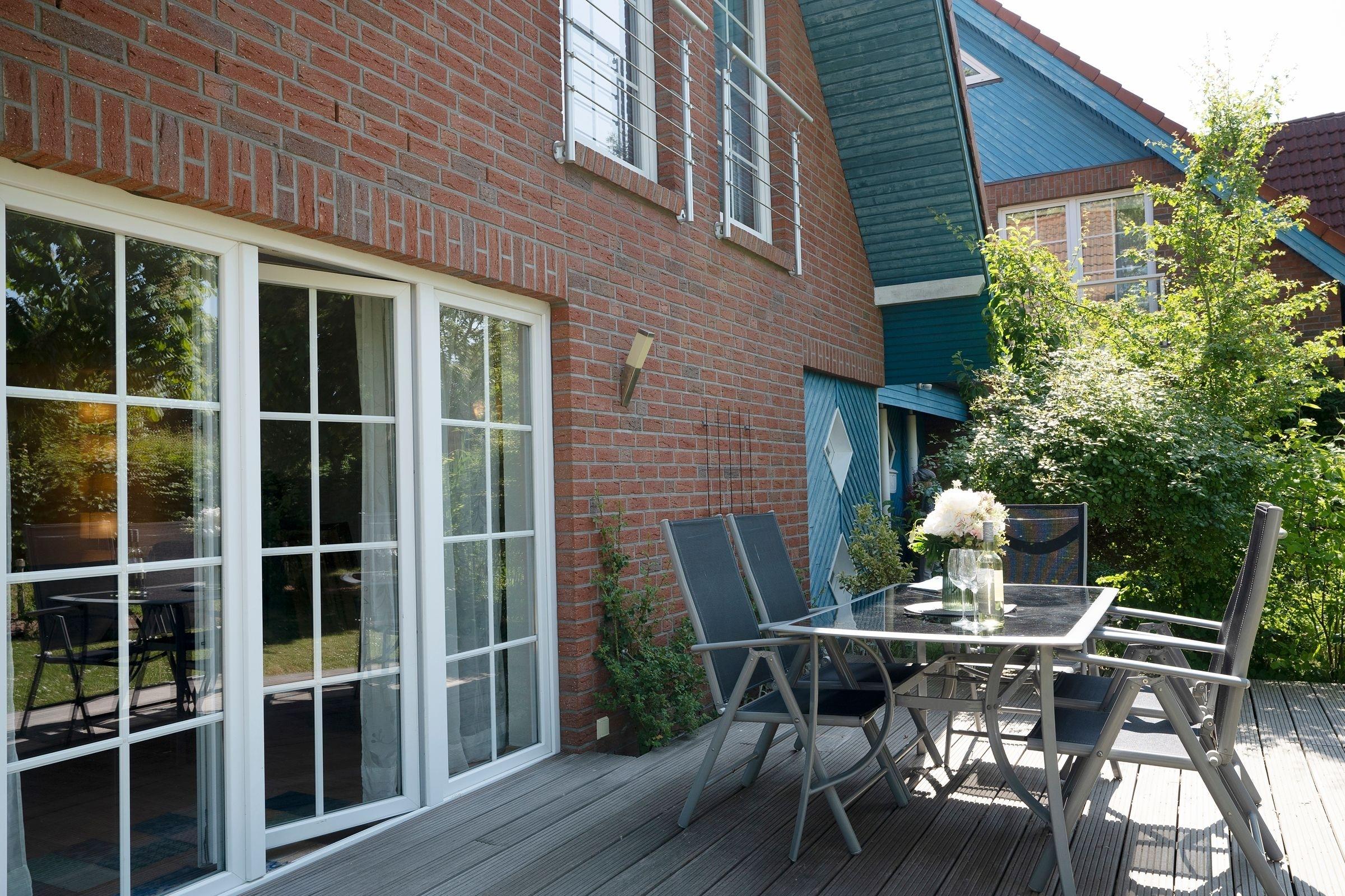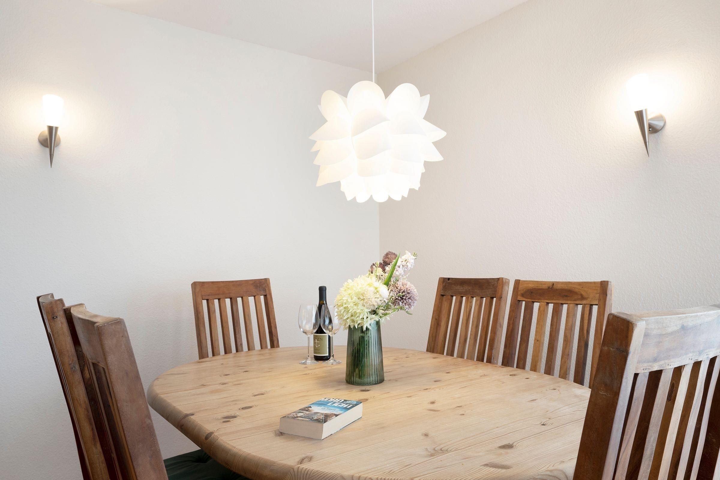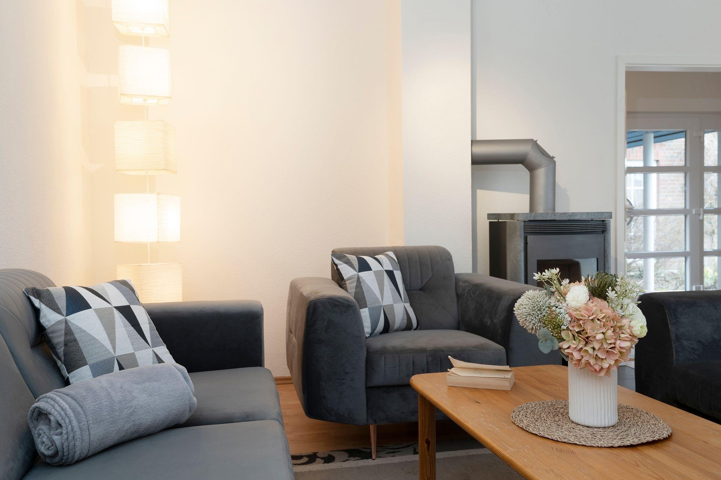 Über den hellen Flur gelangen Sie in den großen Wohn- und Essbereich. Auf der komfortablen Sitzgarnitur ist genügend Platz für alle, um einen gemeinsamen Abend vor dem Kamin oder dem Fernseher zu verbringen. Vom Esstisch aus haben Sie einen fantastischen Blick in den Garten. Auf dem Flur gibt es ein kleines Gäste-WC. Auf der rechten Seite befindet sich die gut ausgestattete Küche mit einem weiteren Esstisch. Im Obergeschoss finden Sie zwei Schlafzimmer mit je einem Doppelbett (je 2x 90x200 cm) sowie ein Schlafraum mit einem Einzelbett (90x200 cm). Das moderne Badezimmer mit Fenster und bodengleicher Dusche ist ein echtes Highlight.