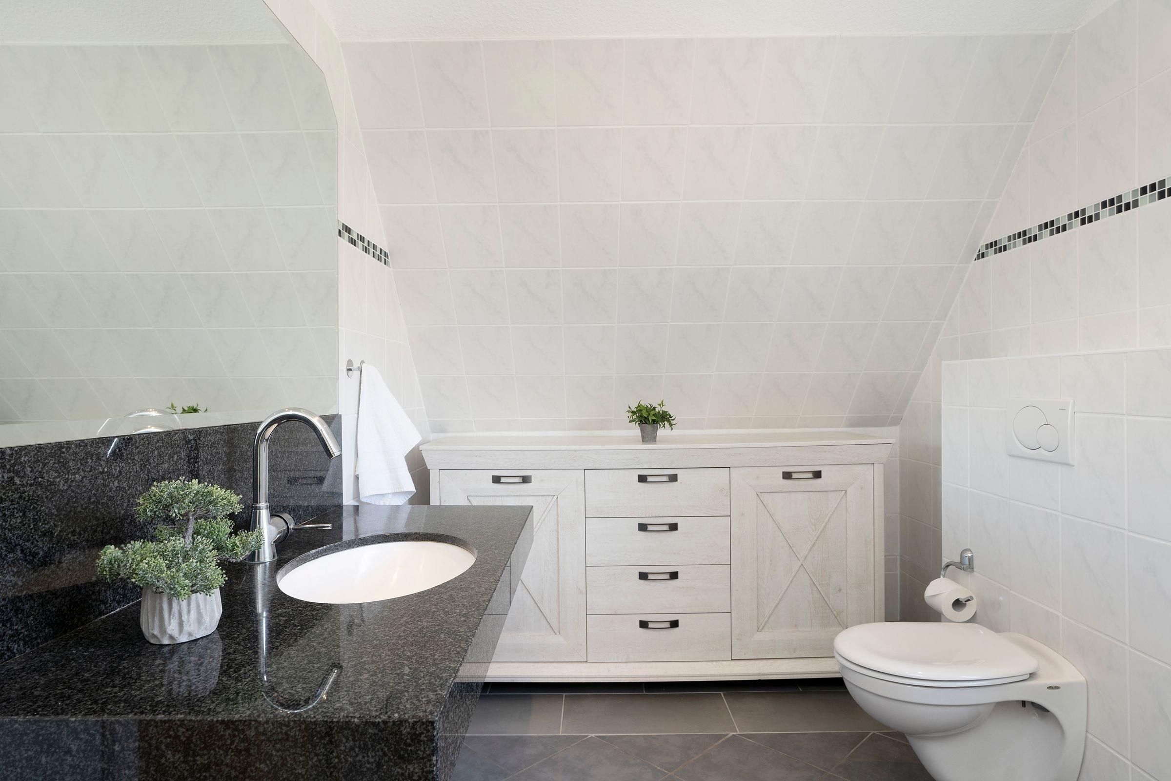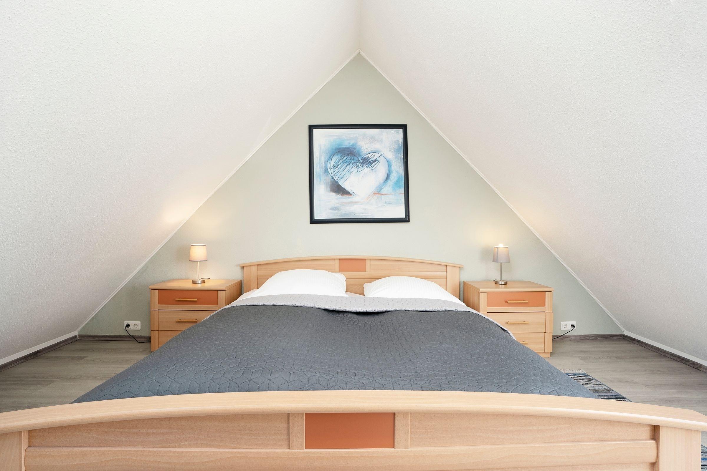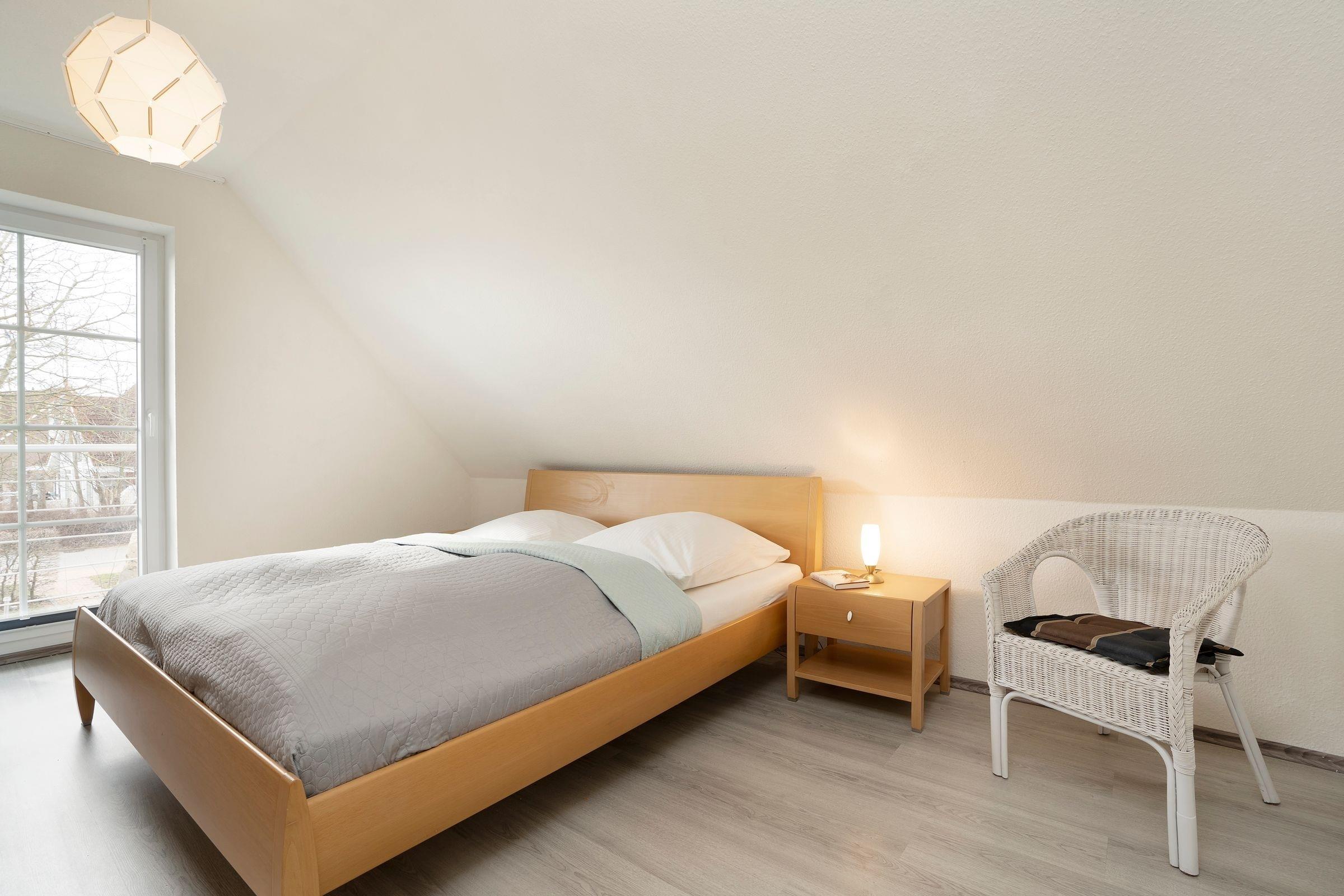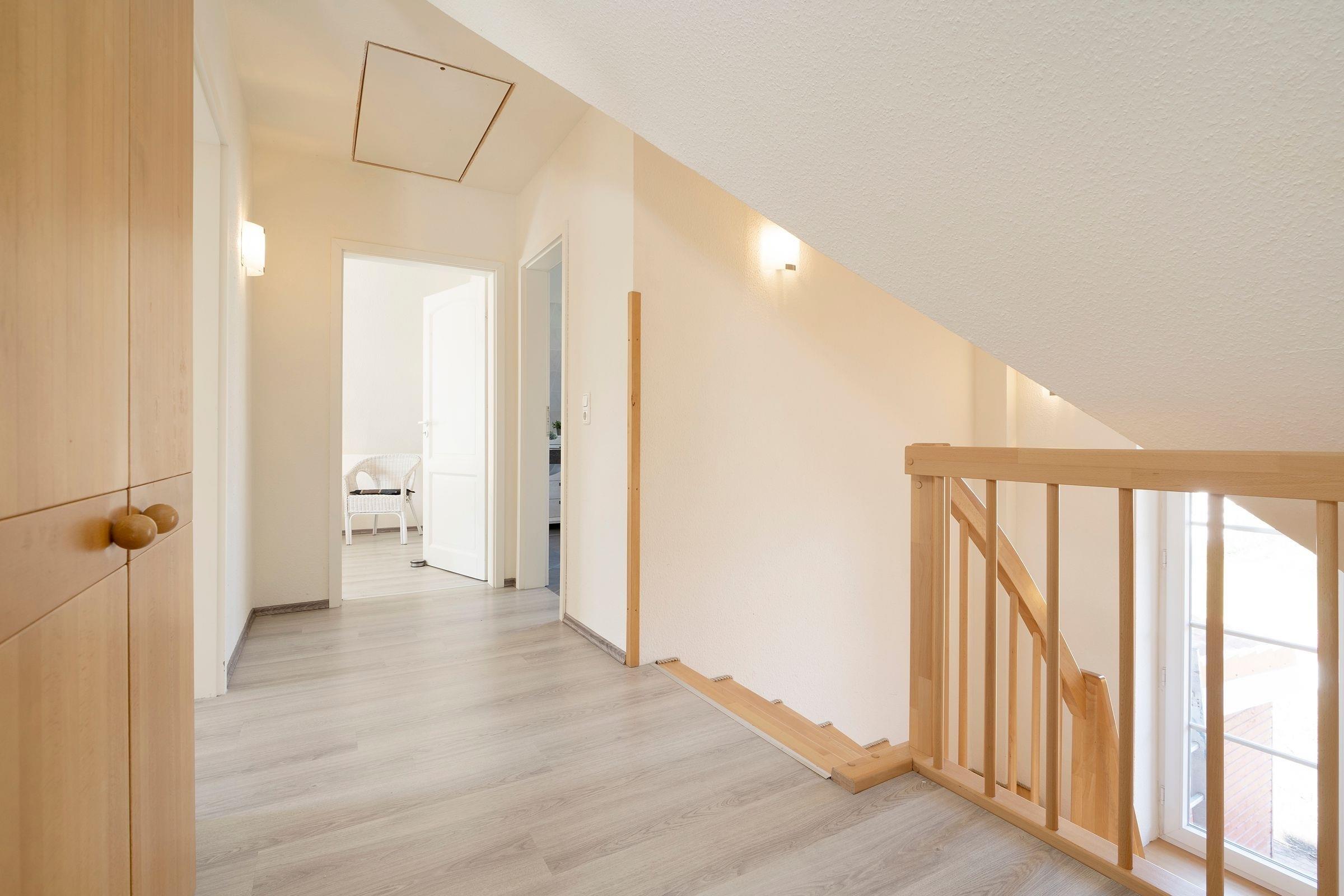 Über den hellen Flur gelangen Sie in den großen Wohn- und Essbereich. Auf der komfortablen Sitzgarnitur ist genügend Platz für alle, um einen gemeinsamen Abend vor dem Kamin oder dem Fernseher zu verbringen. Vom Esstisch aus haben Sie einen fantastischen Blick in den Garten. Auf dem Flur gibt es ein kleines Gäste-WC. Auf der rechten Seite befindet sich die gut ausgestattete Küche mit einem weiteren Esstisch. Im Obergeschoss finden Sie zwei Schlafzimmer mit je einem Doppelbett (je 2x 90x200 cm) sowie ein Schlafraum mit einem Einzelbett (90x200 cm). Das moderne Badezimmer mit Fenster und bodengleicher Dusche ist ein echtes Highlight.