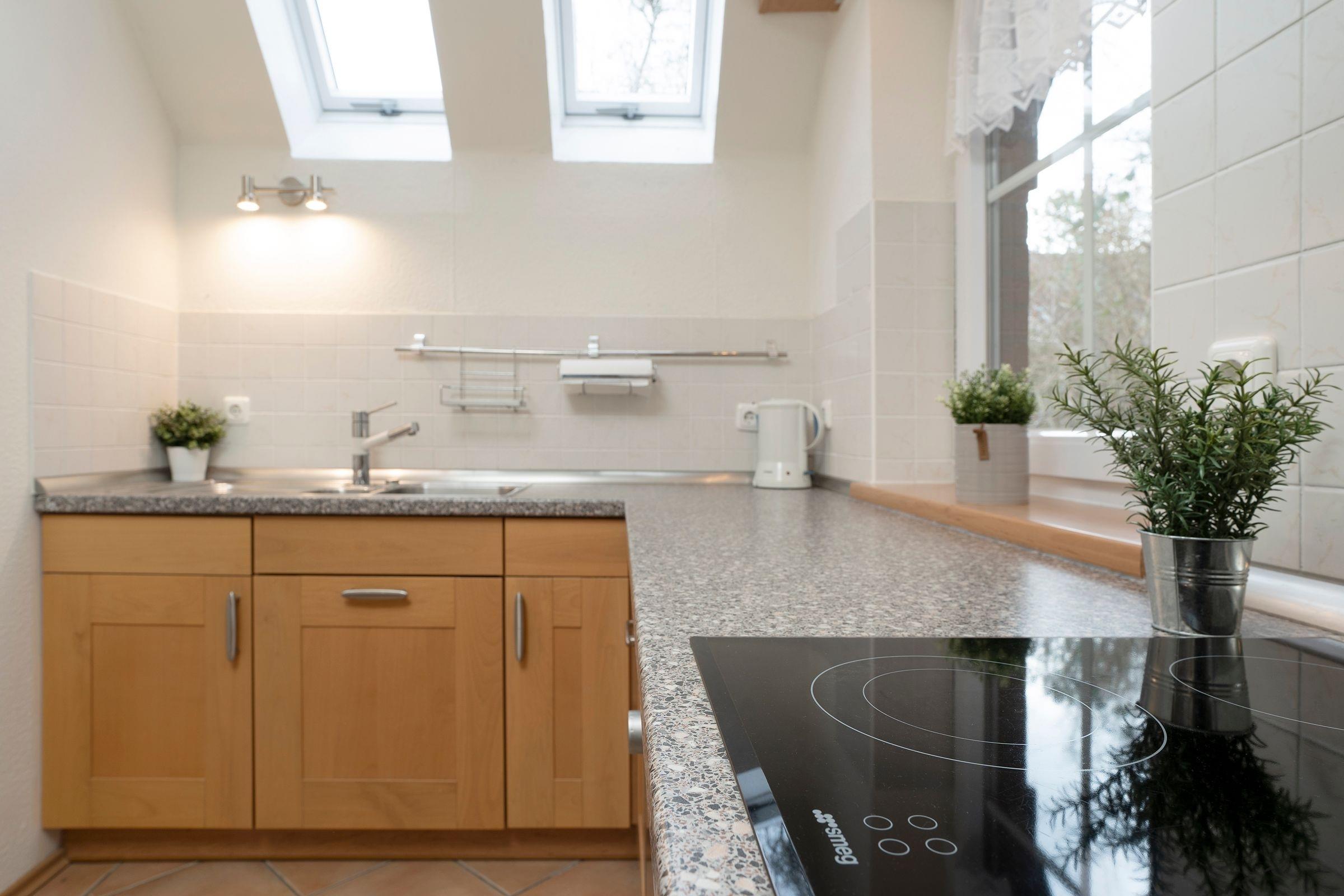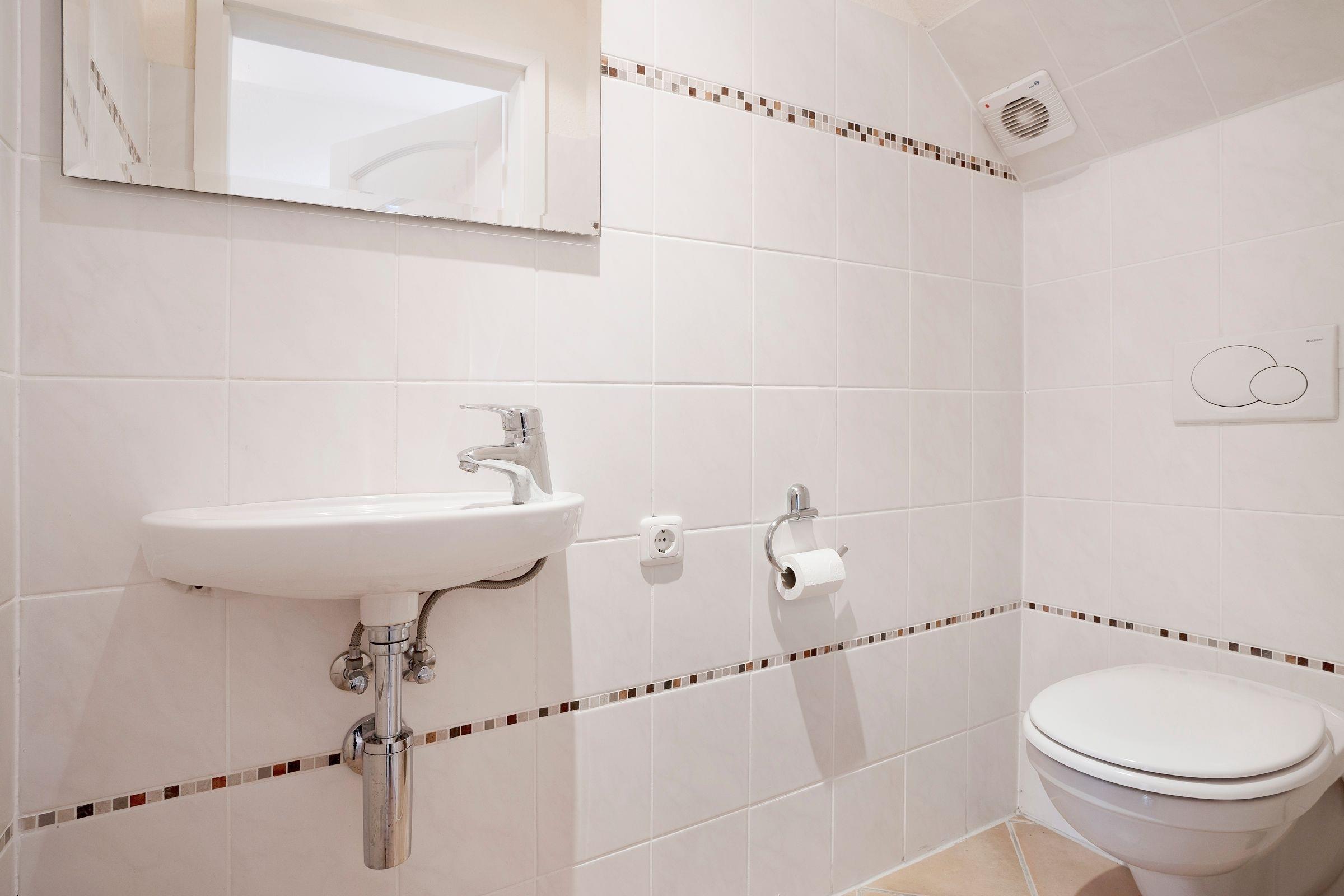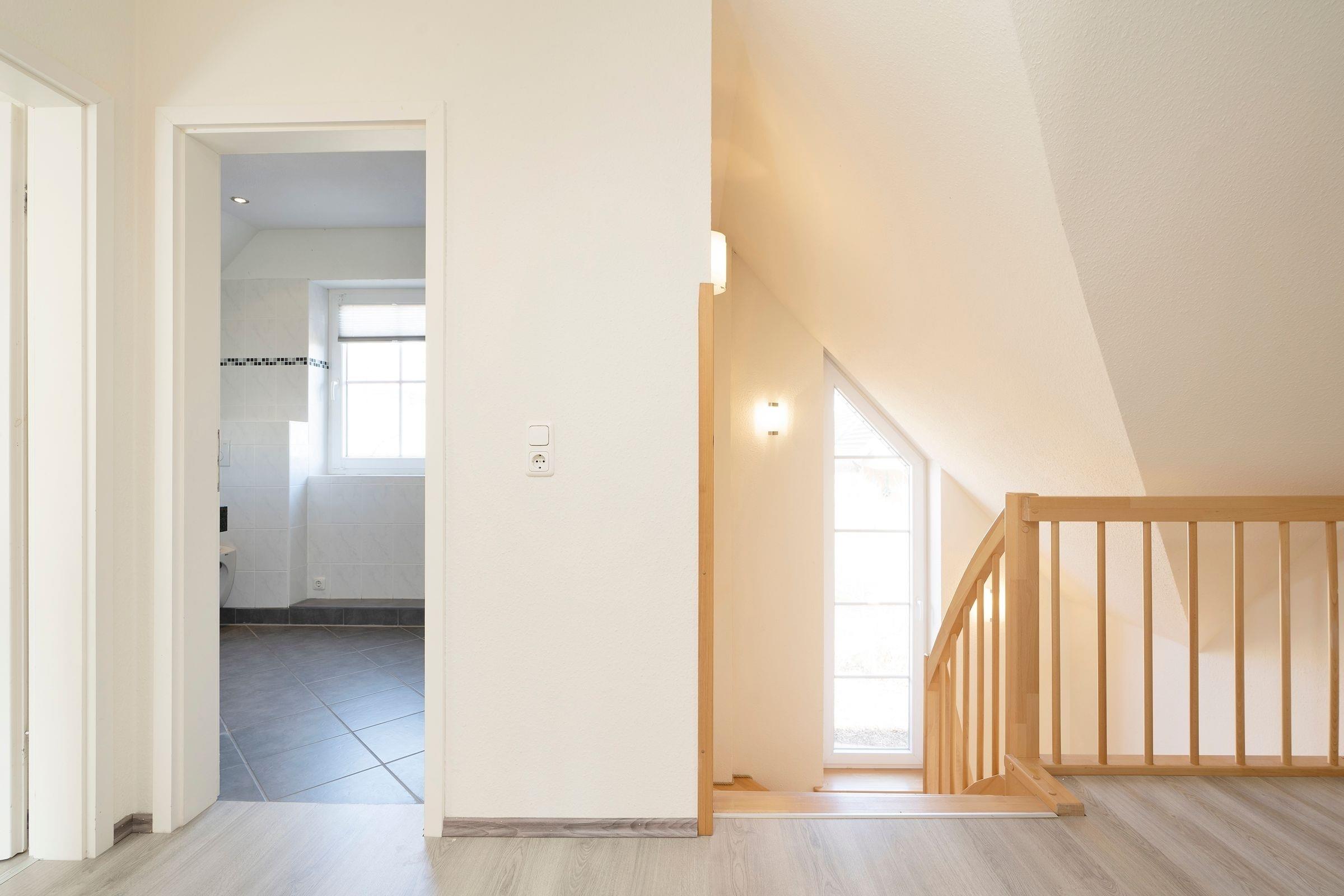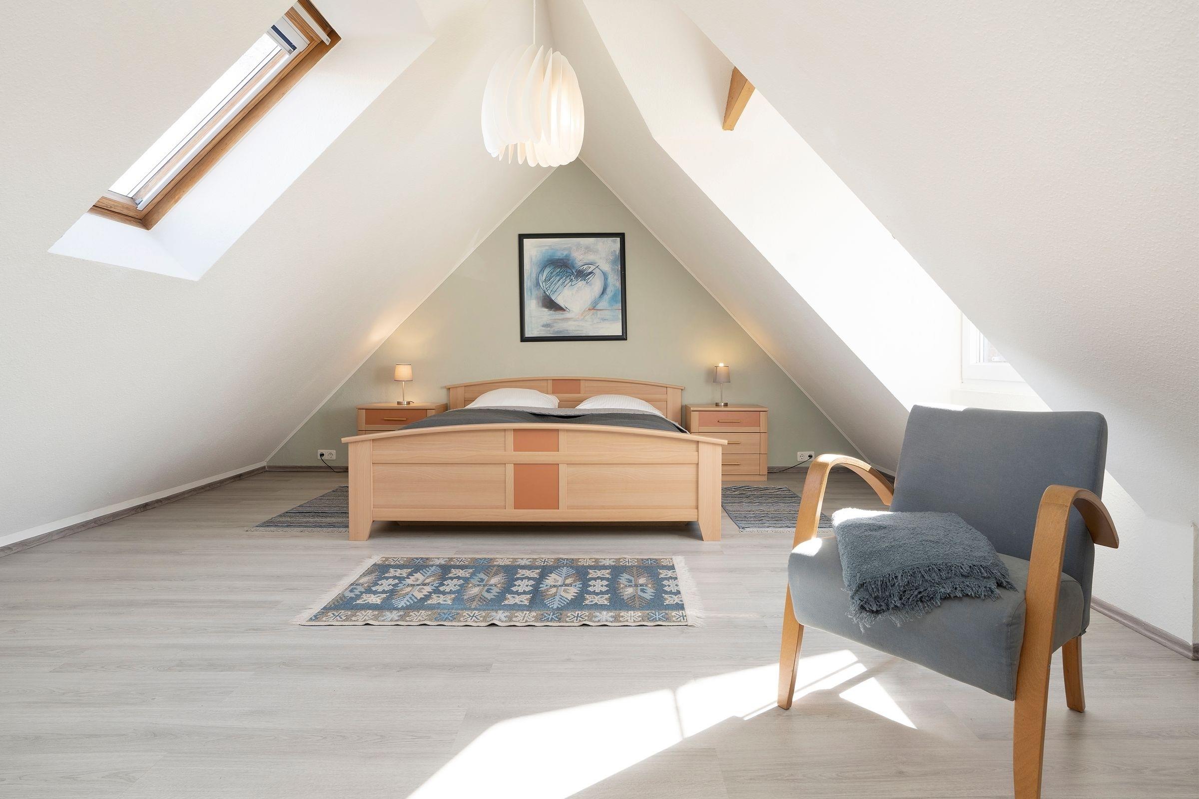 Über den hellen Flur gelangen Sie in den großen Wohn- und Essbereich. Auf der komfortablen Sitzgarnitur ist genügend Platz für alle, um einen gemeinsamen Abend vor dem Kamin oder dem Fernseher zu verbringen. Vom Esstisch aus haben Sie einen fantastischen Blick in den Garten. Auf dem Flur gibt es ein kleines Gäste-WC. Auf der rechten Seite befindet sich die gut ausgestattete Küche mit einem weiteren Esstisch. Im Obergeschoss finden Sie zwei Schlafzimmer mit je einem Doppelbett (je 2x 90x200 cm) sowie ein Schlafraum mit einem Einzelbett (90x200 cm). Das moderne Badezimmer mit Fenster und bodengleicher Dusche ist ein echtes Highlight.