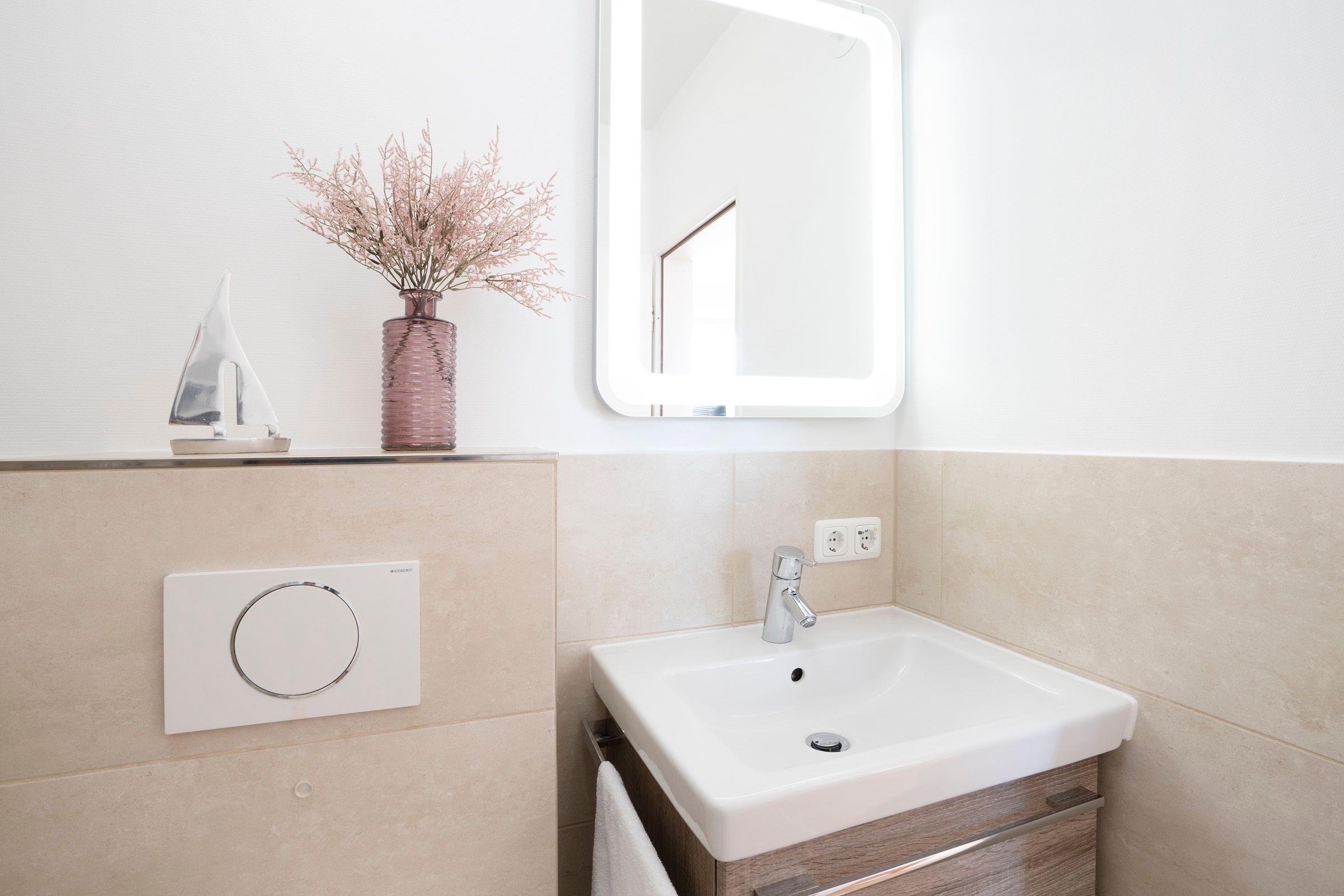 Klein und fein – ein schöner Ort zum Wohlfühlen. Die charmante Dachgeschosswohnung befindet sich im Apartmenthaus Im Sonnenwinkel und bietet auf kleinem Raum alles, was es für einen wunderbaren Urlaub braucht. Ein kuscheliges Sofa im Wohn-/Ess-Bereich empfängt Sie und verspricht Ihnen gemütliche Abende vor dem TV-Gerät. Bei schönem Wetter lockt natürlich der möblierte Balkon, der nach Süden ausgerichtet ist. Aber auch wenn die Sonne einmal nicht so lacht, sitzen Sie hier gut geschützt und können Ihre freie Zeit wunderbar genießen und entspannen. Das wird bestimmt Ihr neuer Lieblingsplatz. Wie wäre es hier mit einem guten Buch? Zurück im Wohnbereich präsentiert sich eine gut ausgestattete Küche – und in einer freundlichen Nische befindet sich eine kleine Ess-Ecke. Durch die Dachschrägen wirkt der Raum wunderbar gemütlich. Für die Nachtruhe geht es ins Schlafzimmer mit schicker Foto-Tapete. In dem Einzelbett (90x200 cm) werden Sie sicher gut nächtigen. In dem modernen Duschbad gleich um die Ecke können Sie perfekt in den Tag starten. Praktisch: Eine Waschmaschine und ein Trockner stehen Ihnen im Haus kostenfrei zur Verfügung.