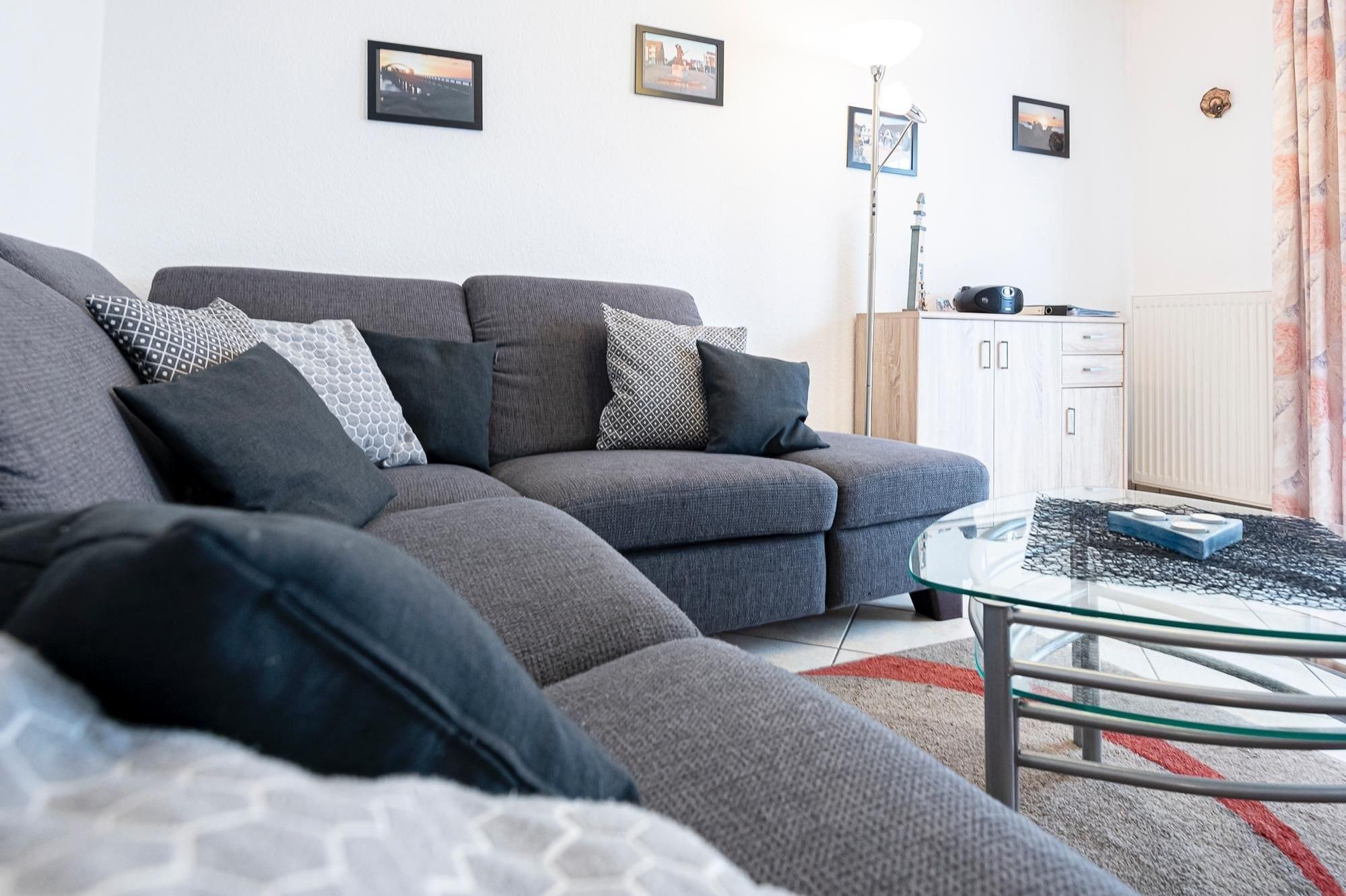 Der Wohn-/Schlafbereich ist mit hochwertiger Schlafcouch (Liegefläche ca. 120x200 cm, zwei Matratzen) möbliert, für Unterhaltung sorgen CD-Player, Radio, ein kostenfreier WLAN-Anschluss und TV. Die integrierte Küche ist mit Annehmlichkeiten wie 4-Platten-Ceranherd, Backofen, Kühlschrank mit Gefrierfach und Mikrowelle ausgestattet, die Spülmaschine erledigt den Abwasch. Eins der separaten Schlafzimmer ist mit bequemem Doppelbett (2x90x200cm) und Kleiderschrank ausgestattet, hier ist bei Bedarf auch Platz für ein Kinderreisebettchen. Das andere separate Schlafzimmer bietet mit zwei getrennt stehenden Einzelbetten (2x80x200cm) ebenfalls zwei Schlafplätze, auch hier nimmt der Kleiderschrank problemlos Ihre Urlaubsgarderobe auf. Verdunklungsmöglichkeiten bestehen im Wohn-/Schlafraum mit Vorhängen, in den Schlafzimmer mit Außenjalousien. Das tageslichthelle Badezimmer ist mit Dusche, Waschbecken und WC ausgestattet, des Weiteren steht zusätzlich ein Gäste-WC zur Verfügung.