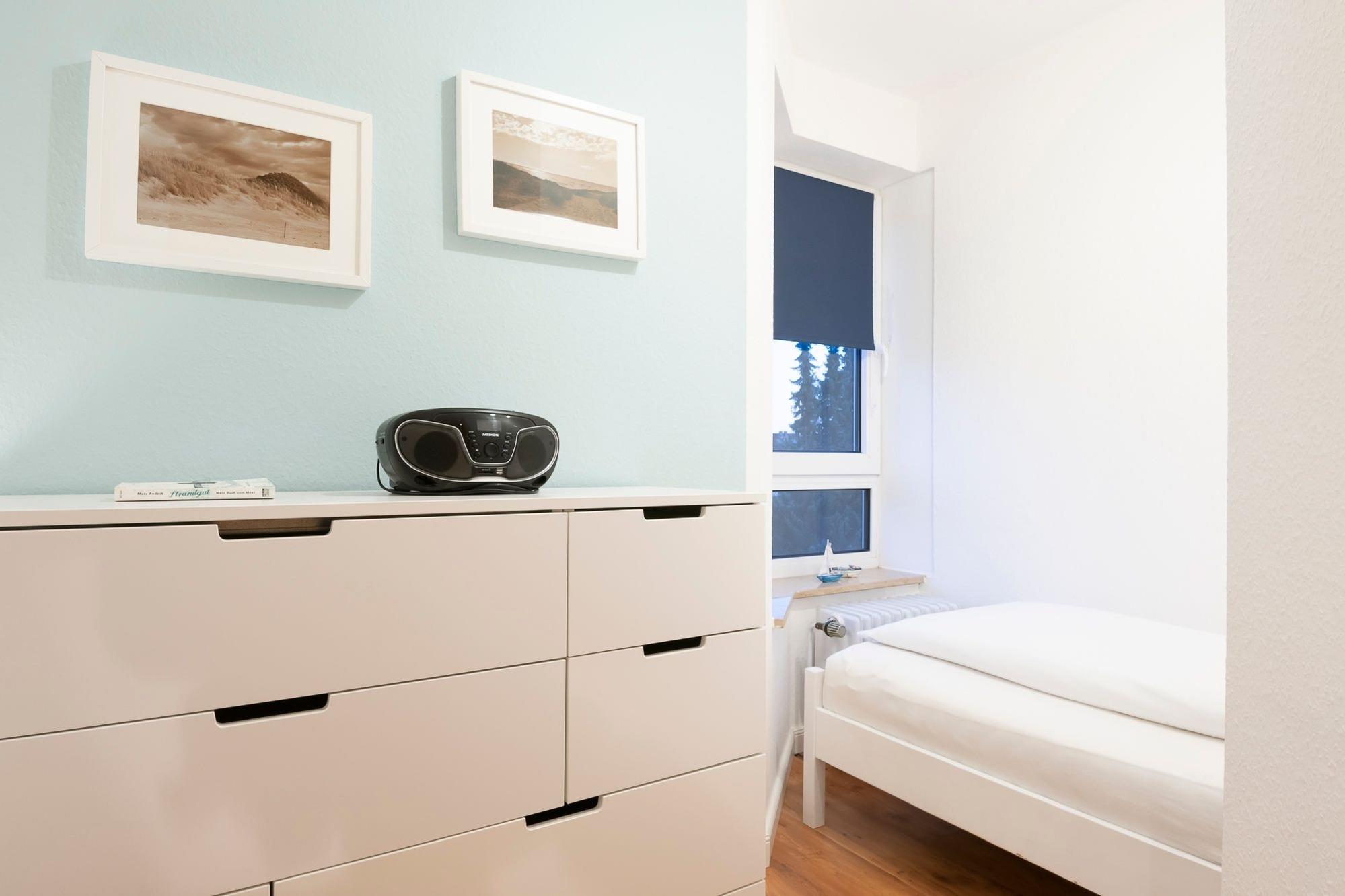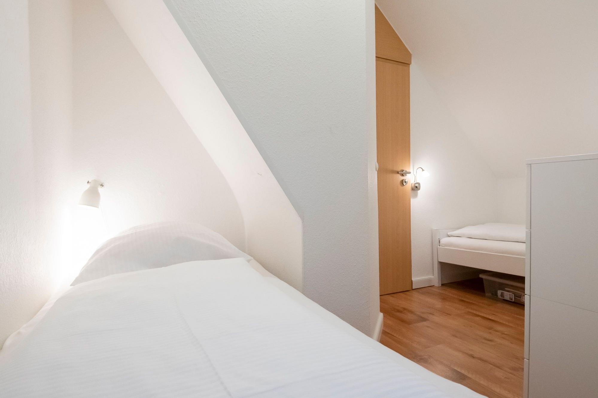 Schlafzimmer 1: 2 Einzelbetten (je 90x200 cm), Verdunklung vorhanden.