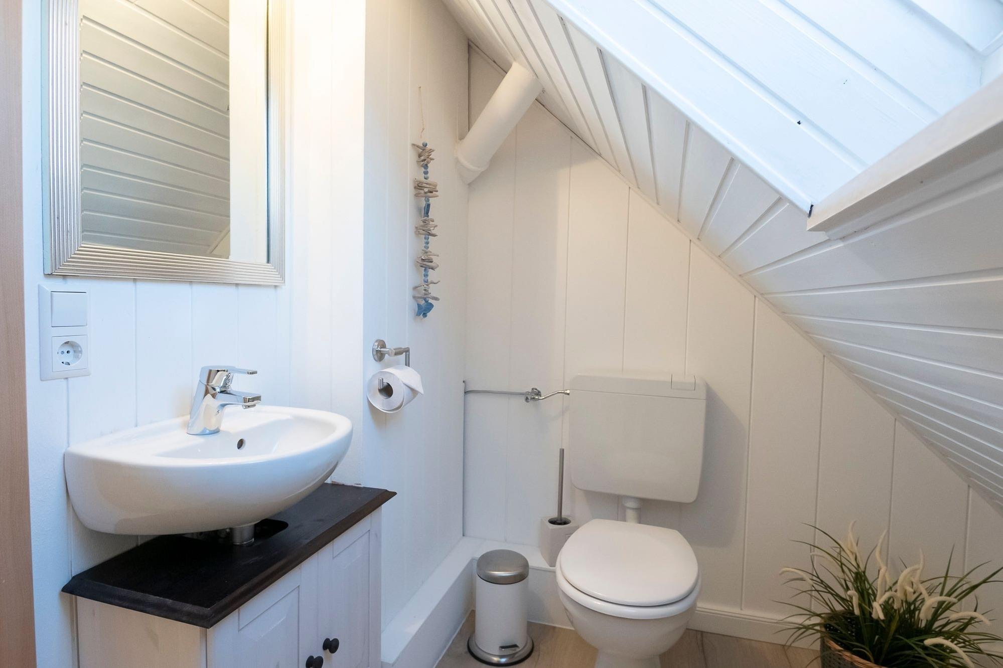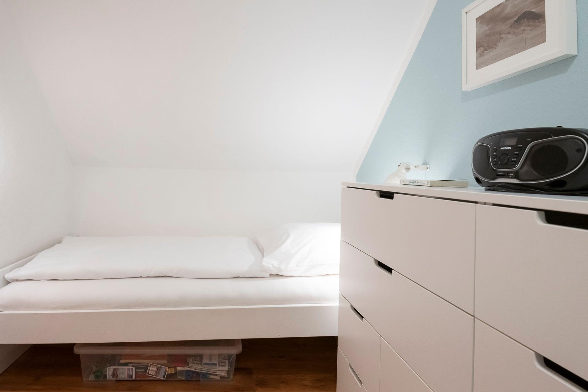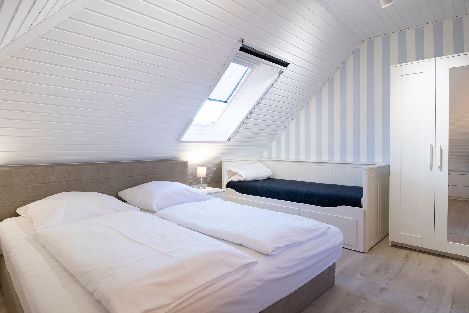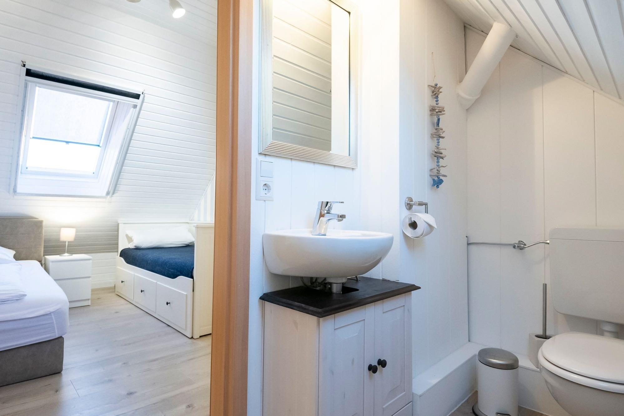 Über den hellen Eingangsbereich erreichen Sie den offen gestalteten Wohn-Essbereich mit gemütlichem Ecksofa und Flat-TV, der zum Abschalten nach einem ereignisreichen Urlaubstag einlädt. In der gut ausgestatteten Küche lässt sich der fangfrische Fisch zu leckeren Urlaubsgerichten zaubern. Genießen Sie die Ruhe auf dem Balkon mit Abendsonne und Blick ins Grüne, während Ihnen die warme Ostseeluft um die Nase weht. Über eine kleine Treppe gelangen Sie direkt unter das Dach. Im Hauptschlafzimmer für 3 Personen mit komfortablen Boxspringbett (180x200cm) und kuscheligem Einzelbett (80x200cm) ist für reichlich Schlaf gesorgt. Stauraum für Ihre Urlaubsbekleidung finden Sie im Kleiderschrank sowie den 2 Kommoden. Auf der Ebene des Wohnbereiches finden zwei weitere kleine Gäste Ihre Nachtruhe in einem Schlafzimmer mit zwei Einzelbetten (je 90x200cm). Das Badezimmer mit Dusche und beheizbarem Handtuchhalter verspricht einen erfrischenden Start in den Tag. Als kleine Besonderheit verfügt diese Ferienoase über ein praktisches Gäste-WC.