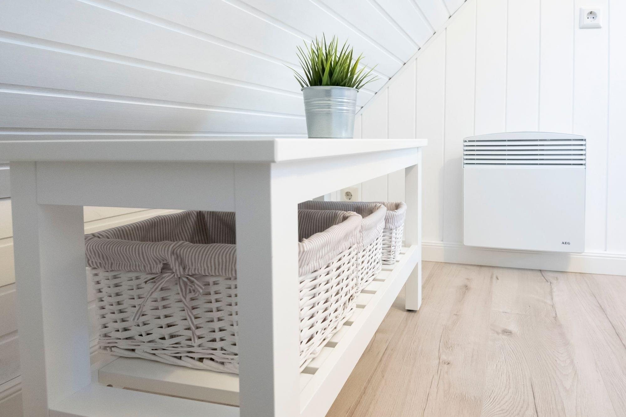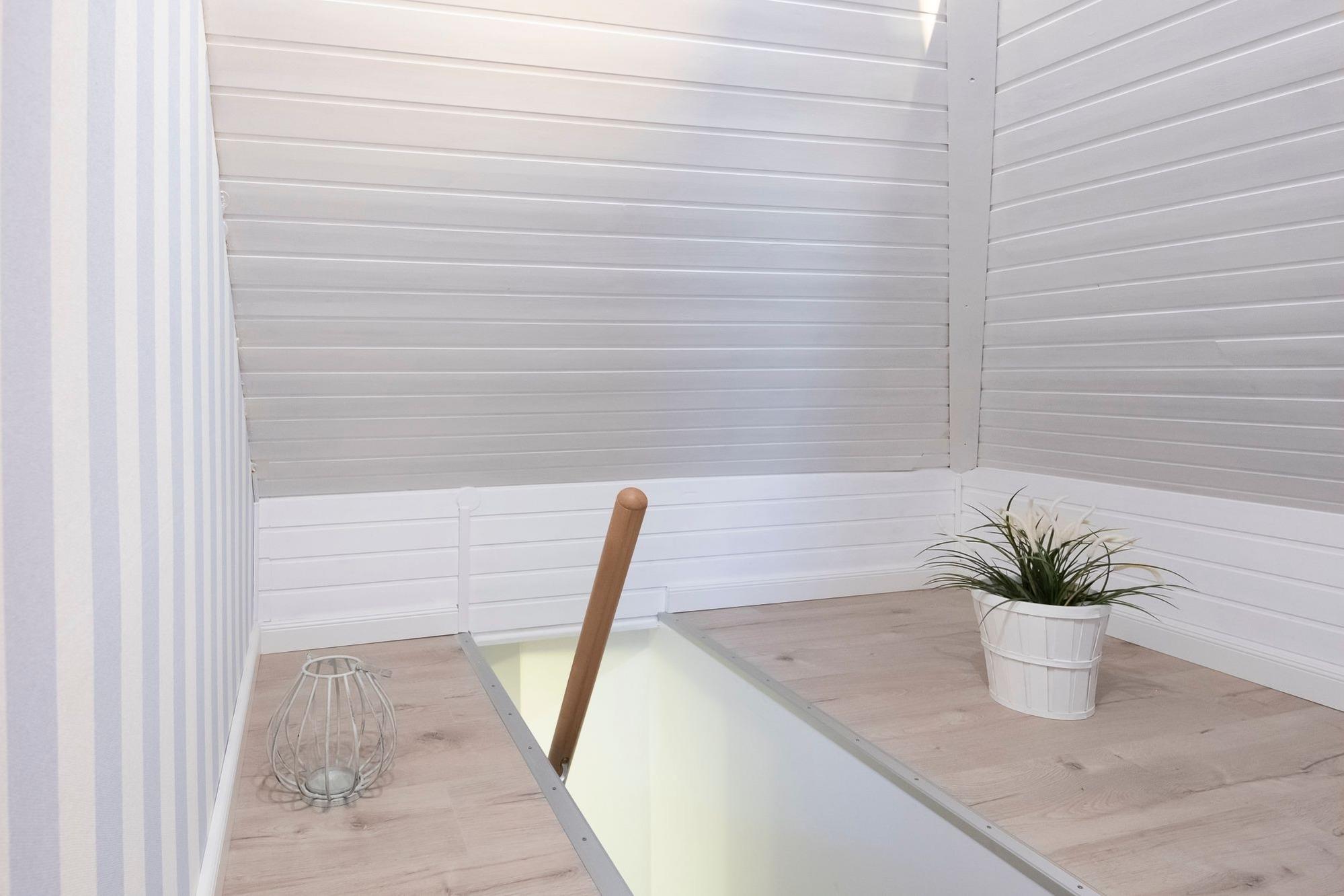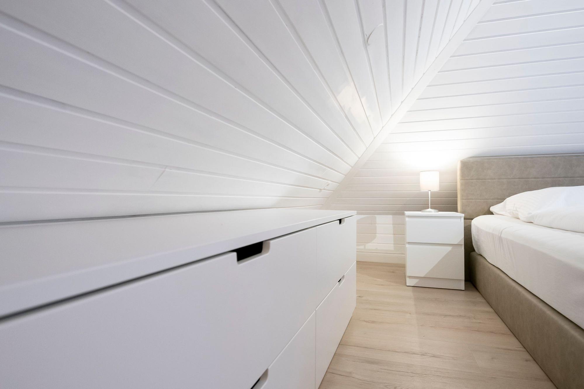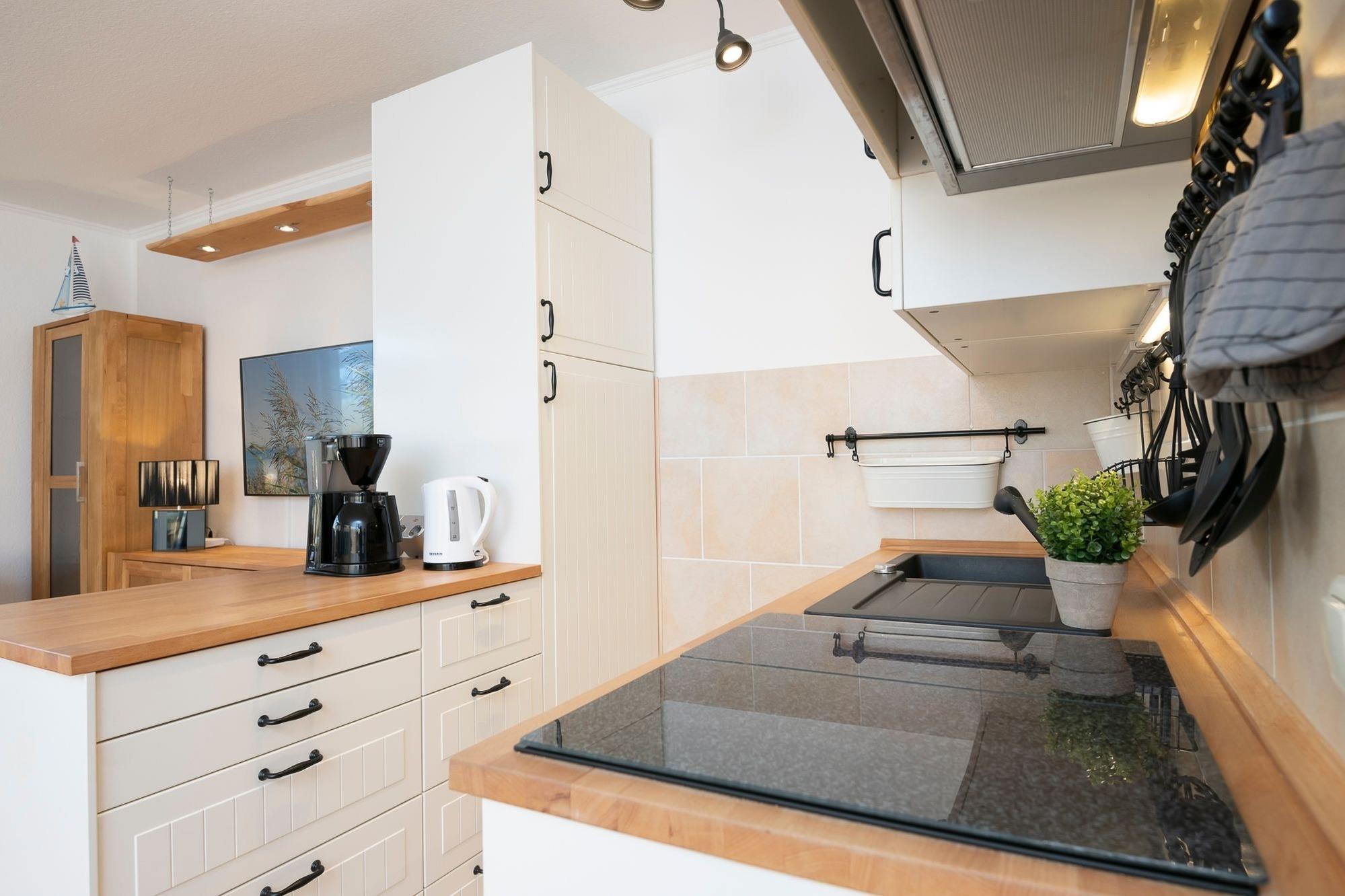 Über den hellen Eingangsbereich erreichen Sie den offen gestalteten Wohn-Essbereich mit gemütlichem Ecksofa und Flat-TV, der zum Abschalten nach einem ereignisreichen Urlaubstag einlädt. In der gut ausgestatteten Küche lässt sich der fangfrische Fisch zu leckeren Urlaubsgerichten zaubern. Genießen Sie die Ruhe auf dem Balkon mit Abendsonne und Blick ins Grüne, während Ihnen die warme Ostseeluft um die Nase weht. Über eine kleine Treppe gelangen Sie direkt unter das Dach. Im Hauptschlafzimmer für 3 Personen mit komfortablen Boxspringbett (180x200cm) und kuscheligem Einzelbett (80x200cm) ist für reichlich Schlaf gesorgt. Stauraum für Ihre Urlaubsbekleidung finden Sie im Kleiderschrank sowie den 2 Kommoden. Auf der Ebene des Wohnbereiches finden zwei weitere kleine Gäste Ihre Nachtruhe in einem Schlafzimmer mit zwei Einzelbetten (je 90x200cm). Das Badezimmer mit Dusche und beheizbarem Handtuchhalter verspricht einen erfrischenden Start in den Tag. Als kleine Besonderheit verfügt diese Ferienoase über ein praktisches Gäste-WC.