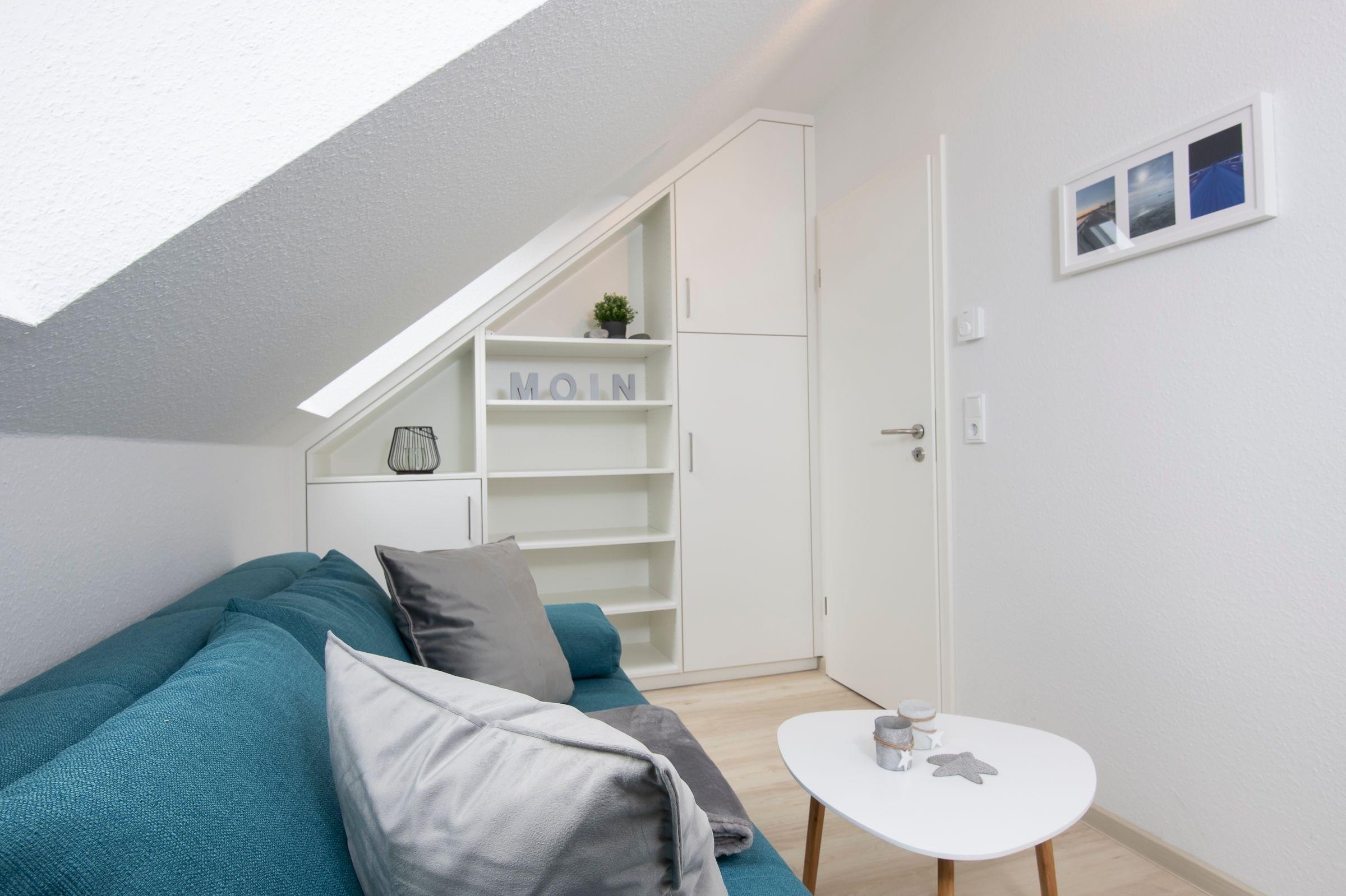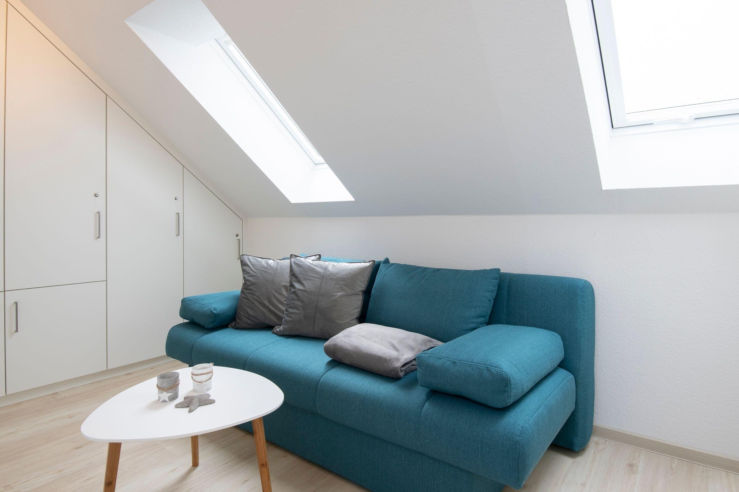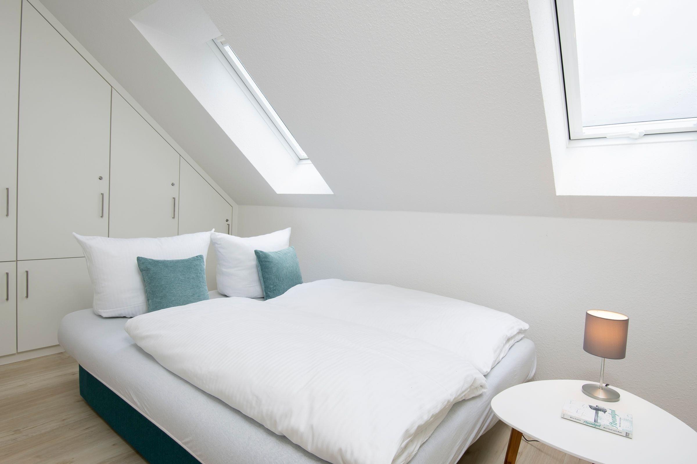 Komfortabel schlafen können Sie im Boxspringbett (2 x 180x200 cm) in Schlafzimmer 1. Ihre Urlaubsgarderobe verstauen Sie im begehbaren Kleiderschrank. Schlafzimmer 2 ist das Reich für jüngere Urlaubsgäste und lädt mit einem Schlafsofa (160x200 cm) ebenfalls zum Träumen ein. Auch dieses Zimmer punktet mit eigenem Kleiderschrank. Über eine Raumspartreppe gelangen Sie auf den Spitzboden ins dritte, äußerst gemütliche Schlafzimmer, wo ein großzügiges Doppelbett (2 x 180x200 cm) und ein Kleiderschrank auf Sie wartet. In den 2 hellen Badezimmern mit einer bodengleichen Dusche und einer mit Duschwanne sowie Fußbodenheizung kommt Wellness-Feeling auf.