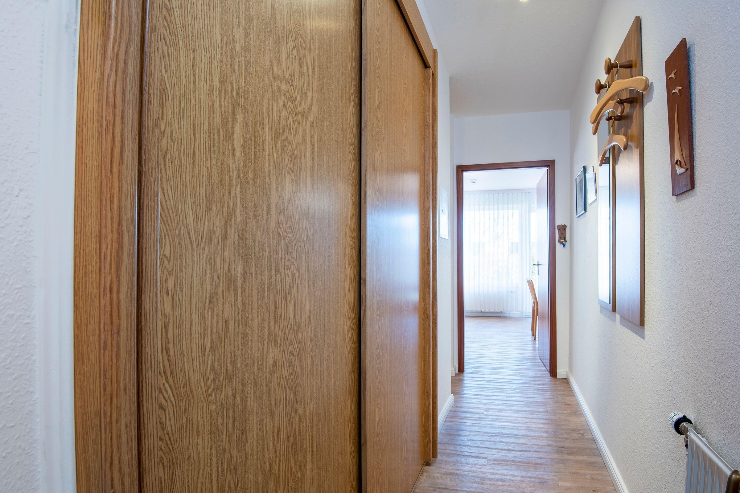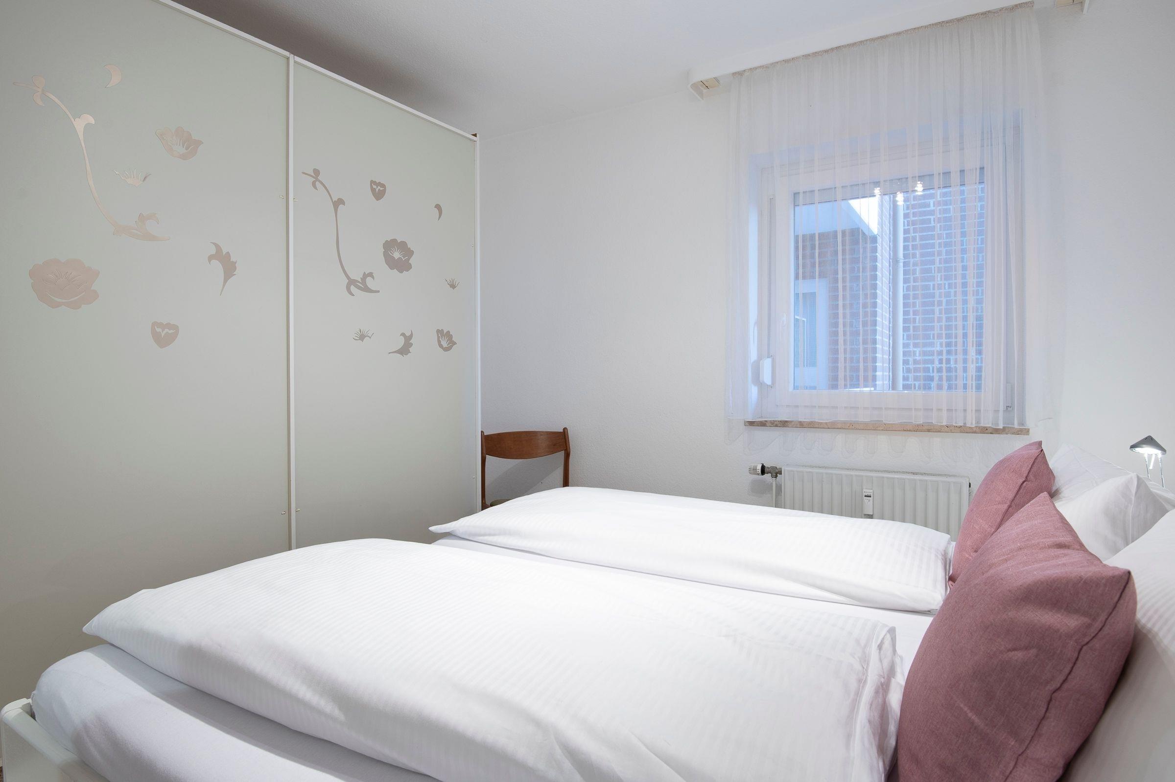 Schlafzimmer: Doppelbett (2x 100x200cm), Verdunkelungsmöglichkeit Rollo, Kleiderschrank im Flur