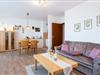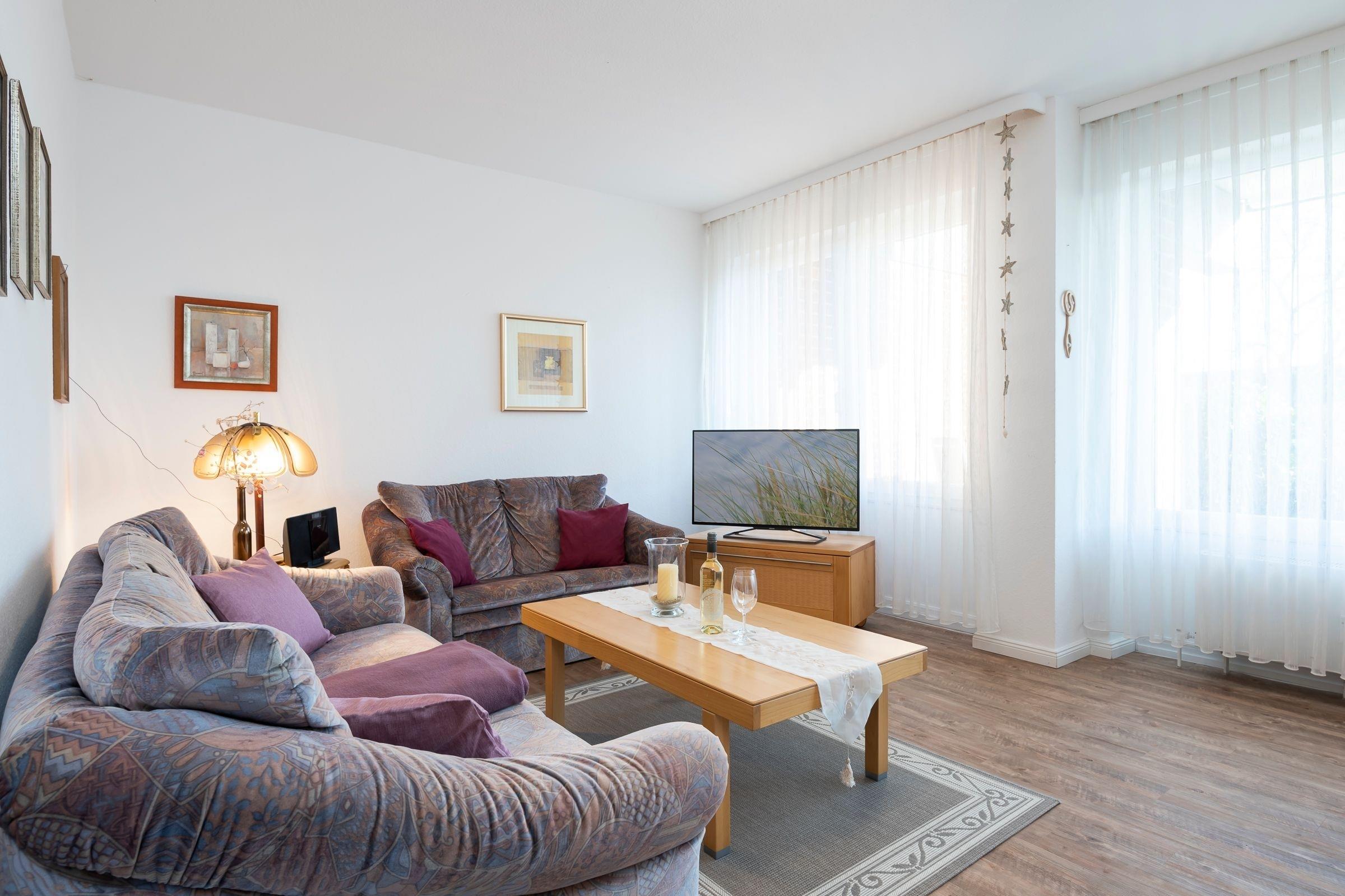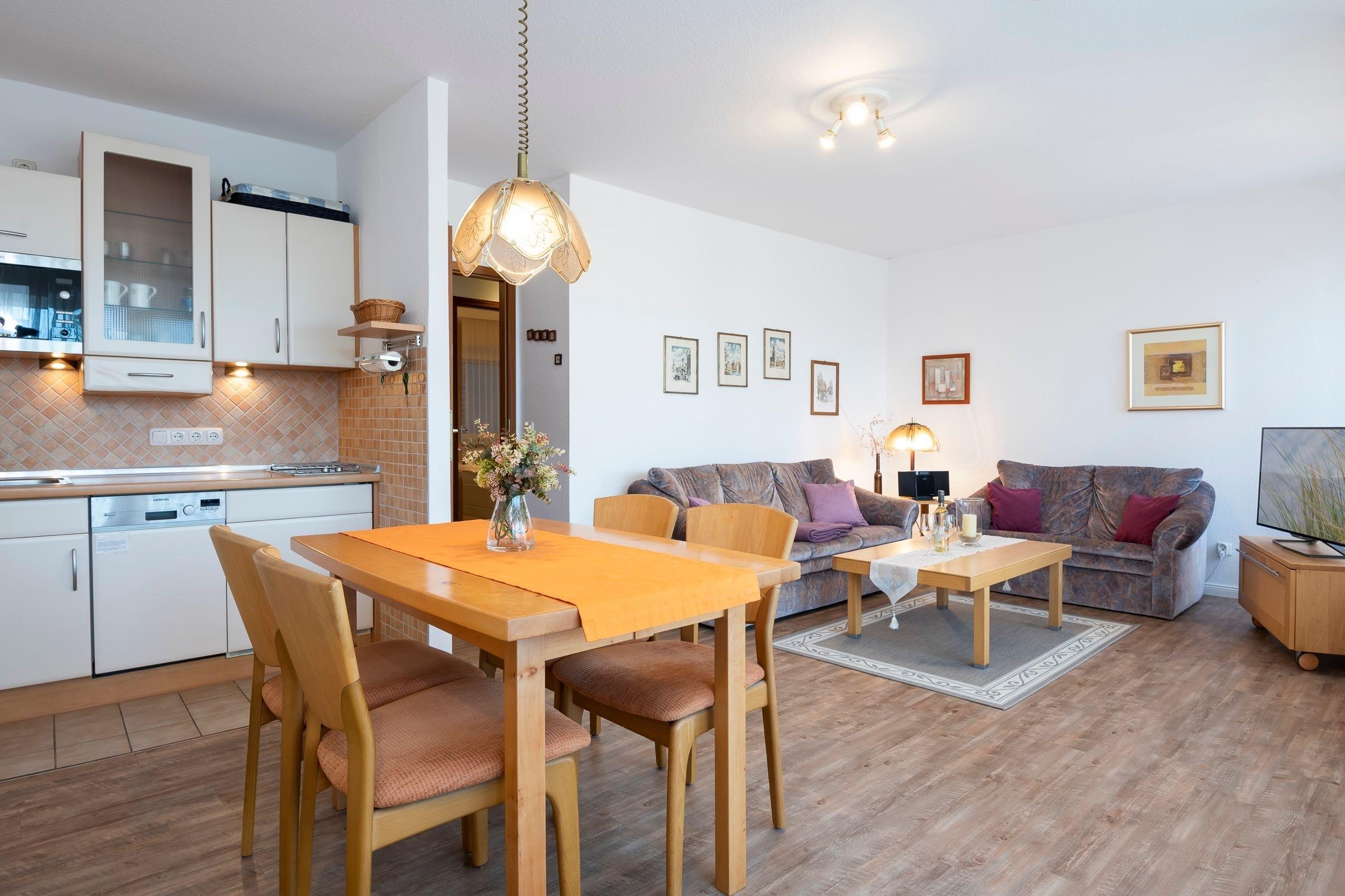 Der gemütliche Wohnbereich mit zwei Sofas, einem Flachbildfernseher sowie einem Esstisch und angrenzender, offener Küchenzeile bildet das Herzstück dieser Wohnung. Die Küche ist u. a. mit einem 2-Platten-Herd, einem Kühlschrank und einem Geschirrspüler gut ausgestattet. Das separate Schlafzimmer mit Fenster erwartet Sie mit einem komfortablen Doppelbett (2x 100x200 cm) und einem Kleiderschrank. Weiteren Stauraum bietet Ihnen der Einbauschrank im Flur. Das innenliegende Badezimmer erwartet Sie mit einem WC, einer Eckdusche sowie einem Spiegelschrank. Erholen Sie sich auf der großen, möblierten Terrasse und genießen Sie die Sonnenstrahlen. Der WLAN-Anschluss ist inklusive.