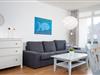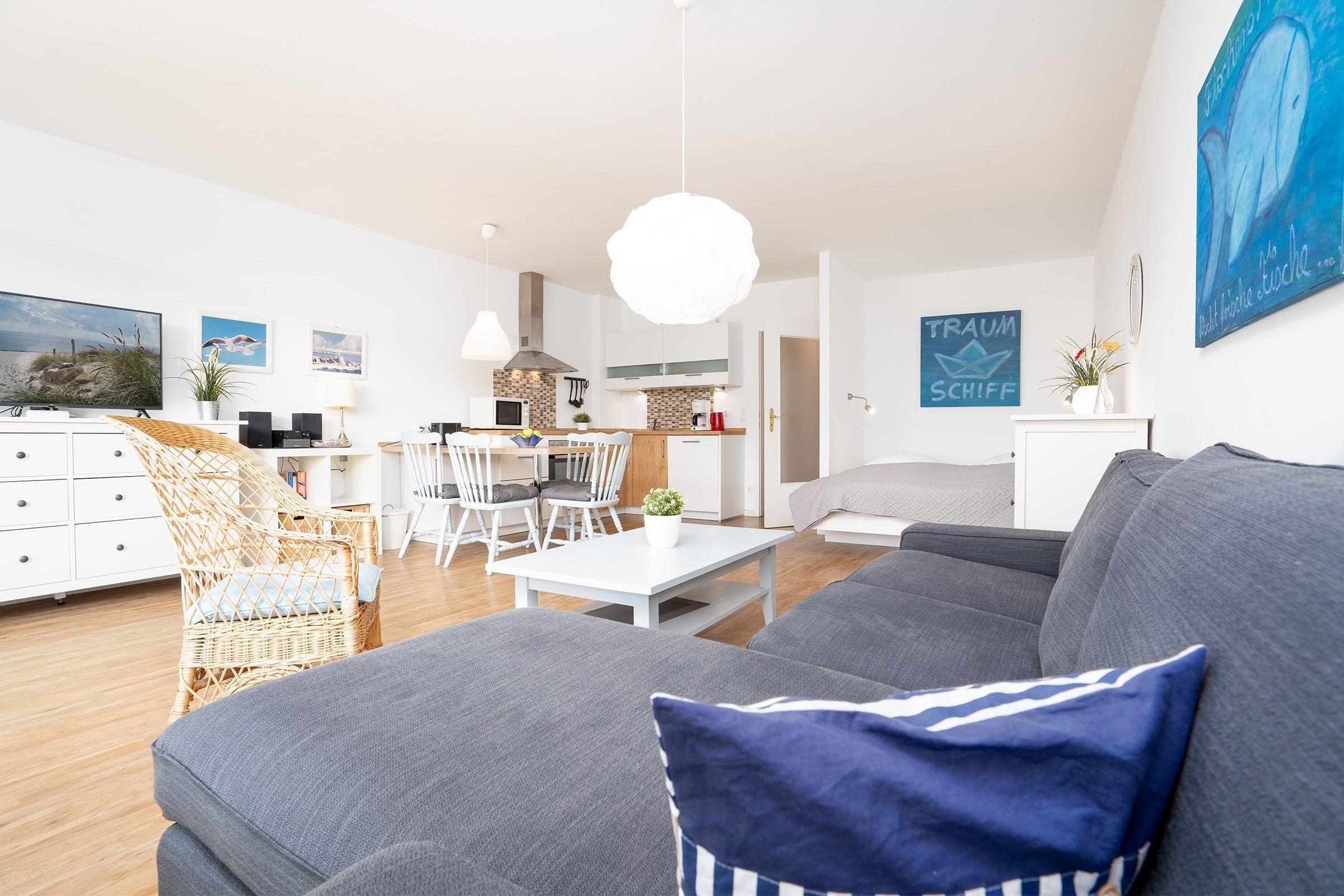 Der helle und geräumige Wohn-/Schlafbereich mit gemütlicher Couch und Flachbild-TV bildet das Zentrum dieser charmanten Ferienwohnung. Treten Sie von hier auch hinaus auf Ihren eigenen möblierten Balkon und freuen sich über die frische Ostseeluft. In der zum Wohnbereich offenen Küche können Sie sich Ihre Mahlzeiten zubereiten und am angrenzenden Esstisch gemeinsam einnehmen. Zur Nacht können Sie es sich im großen Doppelbett (2 x 100x200 cm) bequem machen. Ein weiteres Schlafzimmer verfügt über 2 Einzelbetten (je 90x190cm) und das moderne Duschbad sorgt für einen gelungenen Start in den Tag.