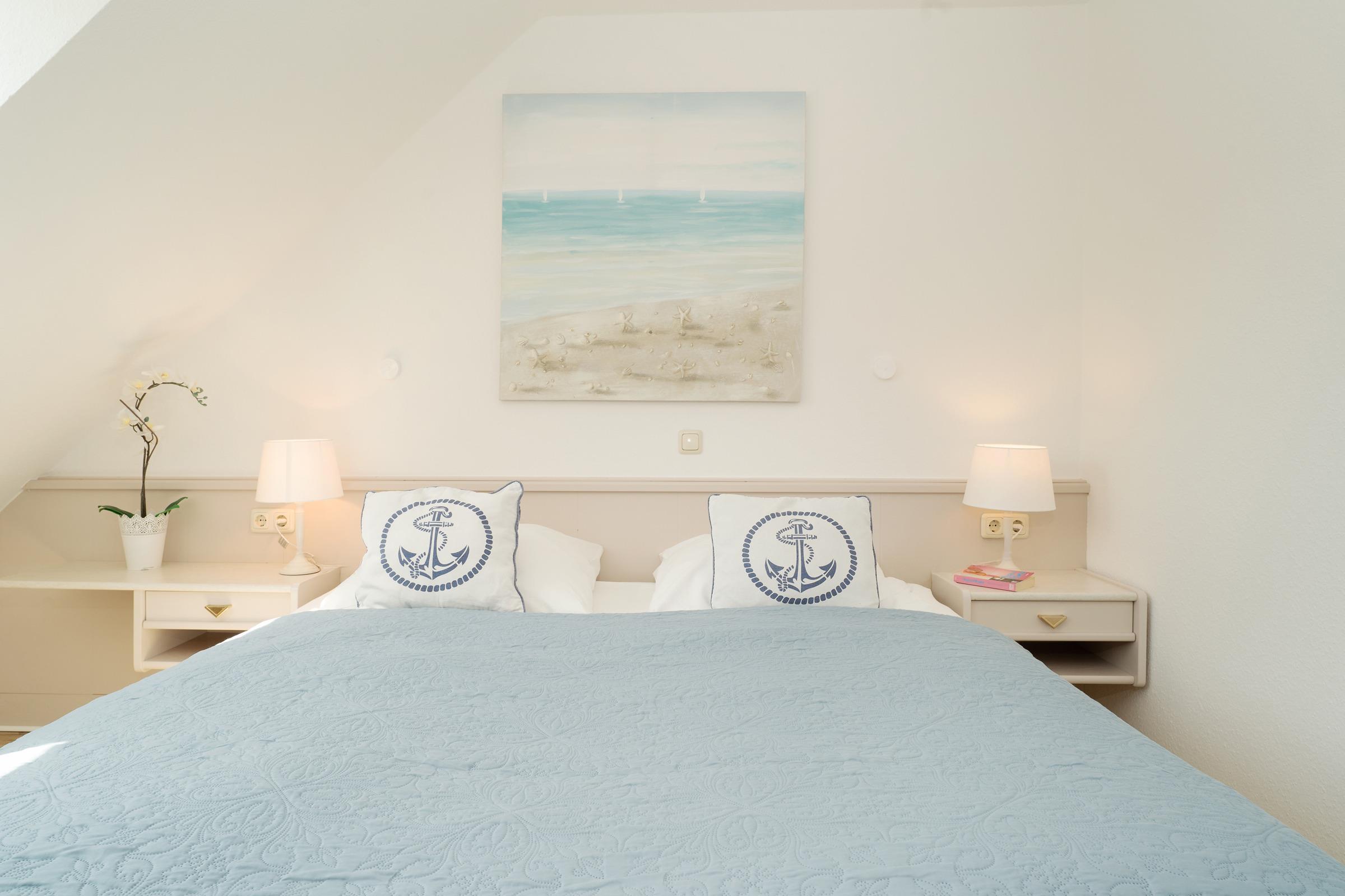 Schlafzimmer 1 (OG): 1 Doppelbett (180 x 200 cm), Kleiderschrank, kleines Sofa für Kleinkind (ohne Rausfallschutz), Platz für Babybett, Verdunkelung: Jalousie und Rollos