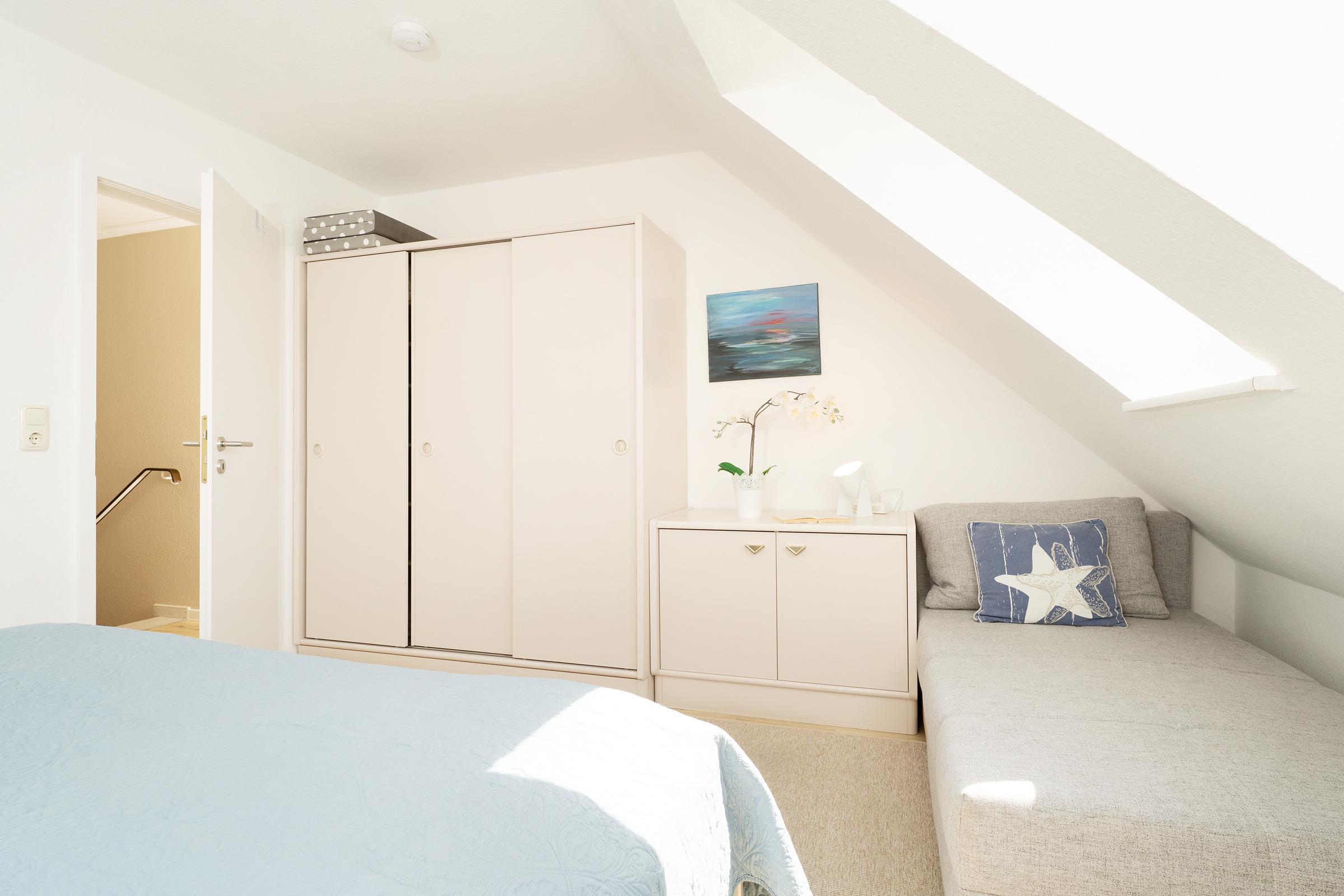 Schlafzimmer 2 (OG): 2 Einzelbetten (2x 990x200 cm), Kleiderschrank, kein Platz für Babybett, Verdunkelung: Jalousie und Rollos