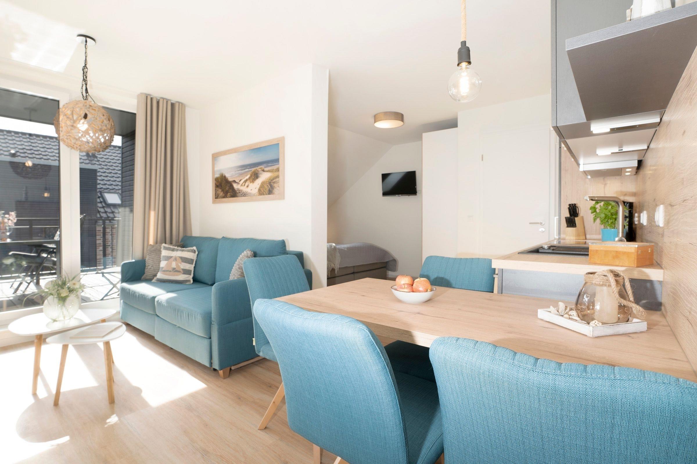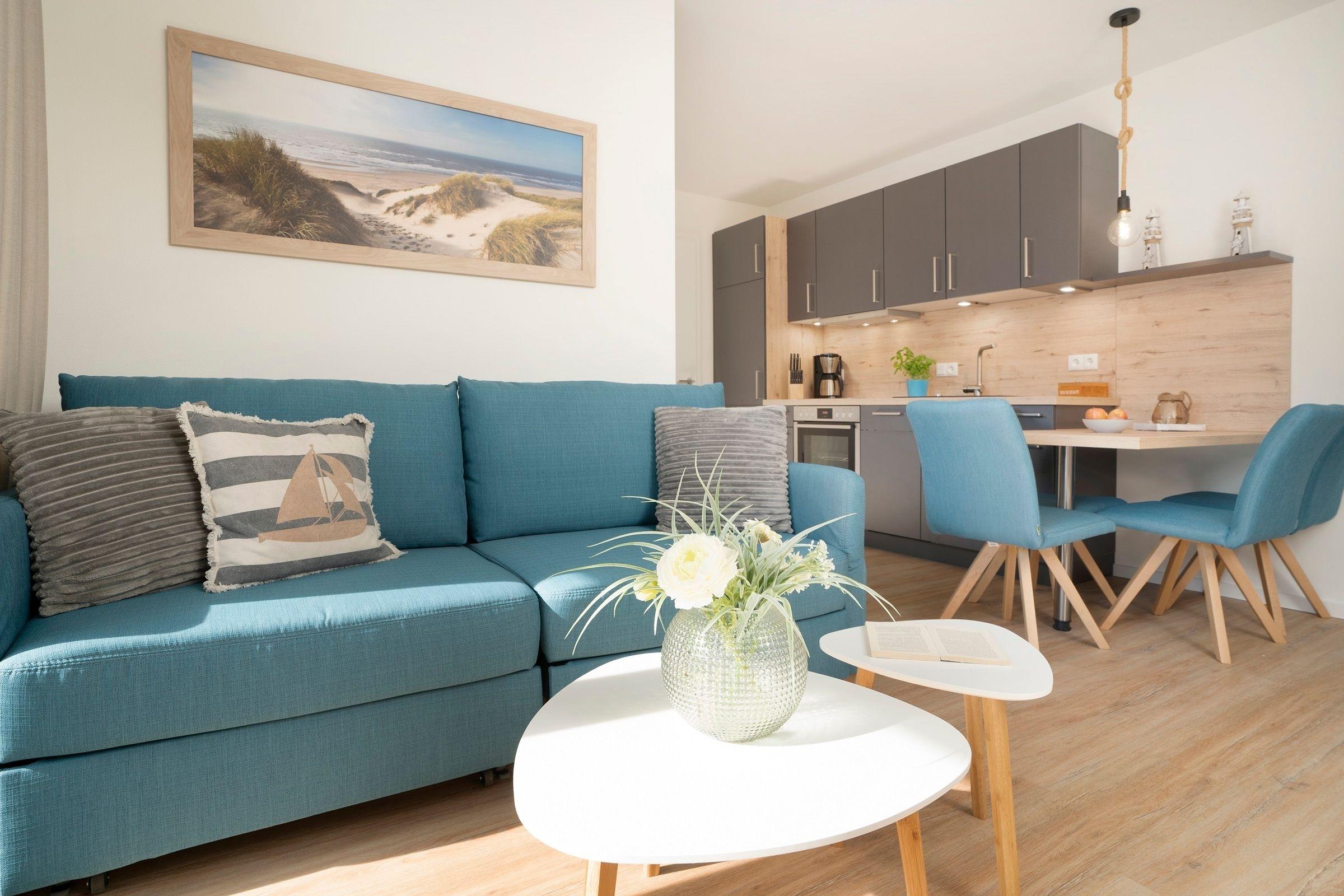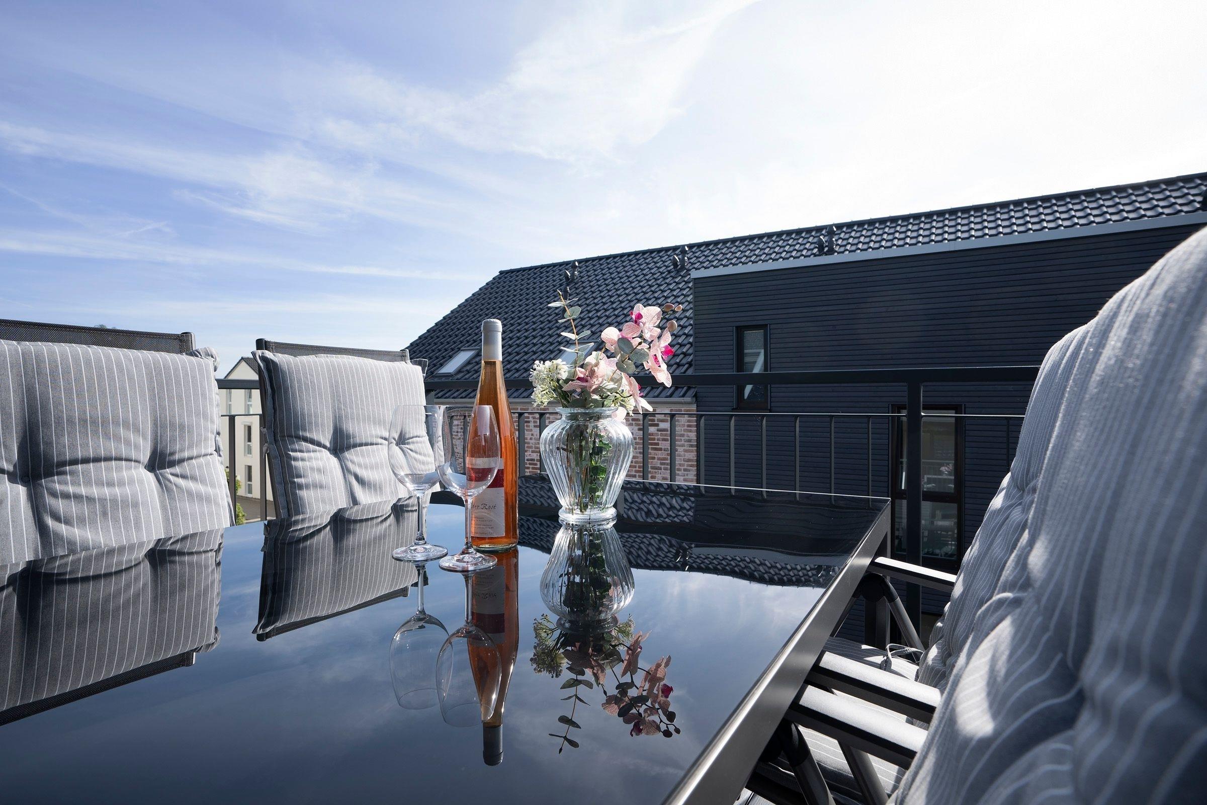 Es erwartet Sie ein moderner Wohn- und Essbereich mit ausreichend Platz für alle Gäste sowie einer praktischen Schlafcouch (180x200 cm), die bei Bedarf in einen weiteren Schlafplatz verwandelt werden kann. Das Zubereiten der Mahlzeiten wird Ihnen in der offenen, gut ausgestatteten Küche sicherlich Freude bereiten. Die Wohnung ist stilvoll und praktisch aufgeteilt, der gemütliche Schlafbereich mit dem komfortablen Doppel-Boxspringbett (2x 90x200 cm) ist vom Wohnbereich optisch abgetrennt worden. Genießen Sie die Sonnenstunden auf der möblierten Dachterrasse und lassen Sie hier einfach die Seele baumeln. Das großzügige Duschbad mit eigener Sauna verspricht Wellness-Feeling und sorgt für Wärme und Entspannung, besonders in der kühlen Jahreshälfte.