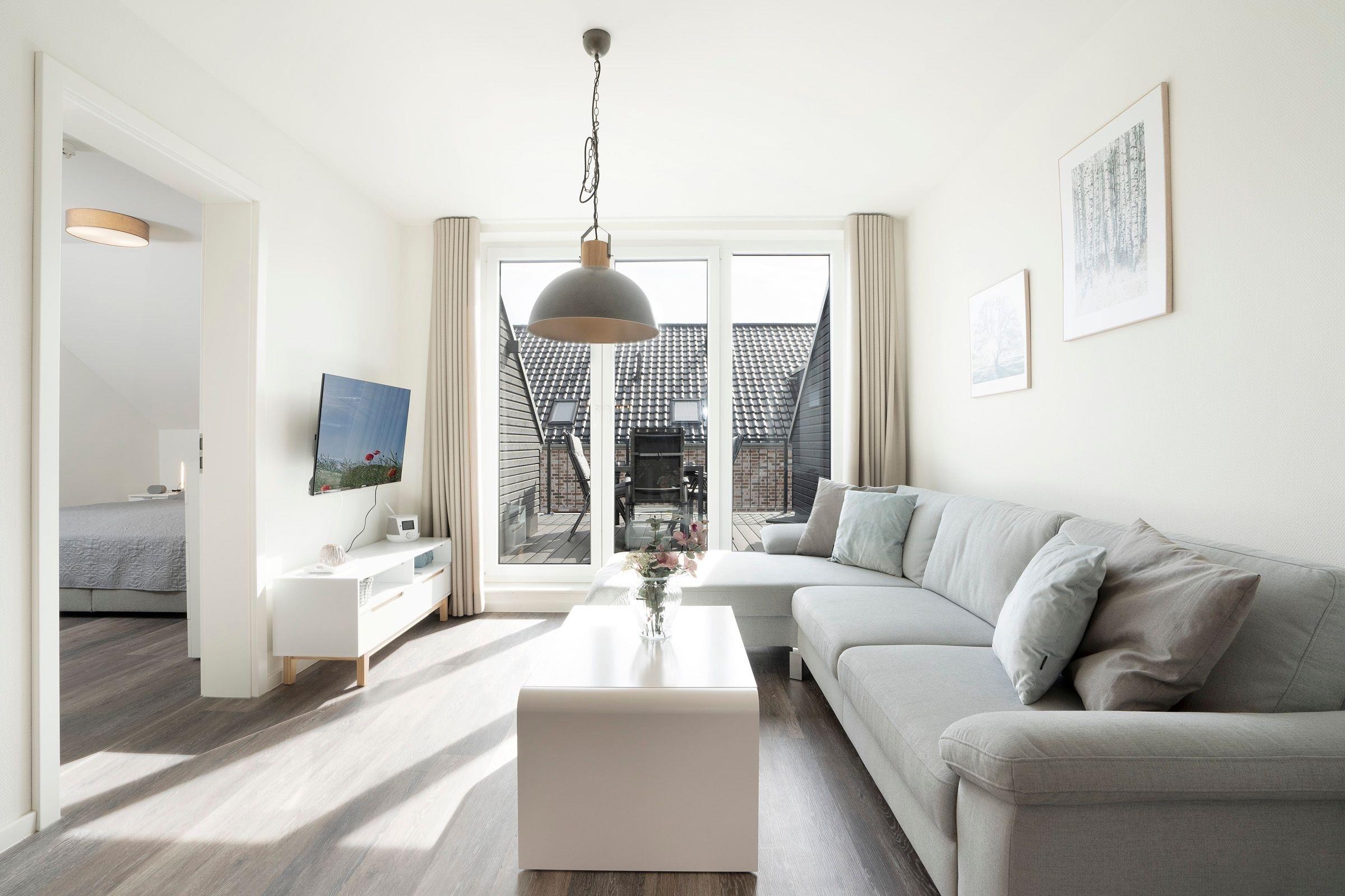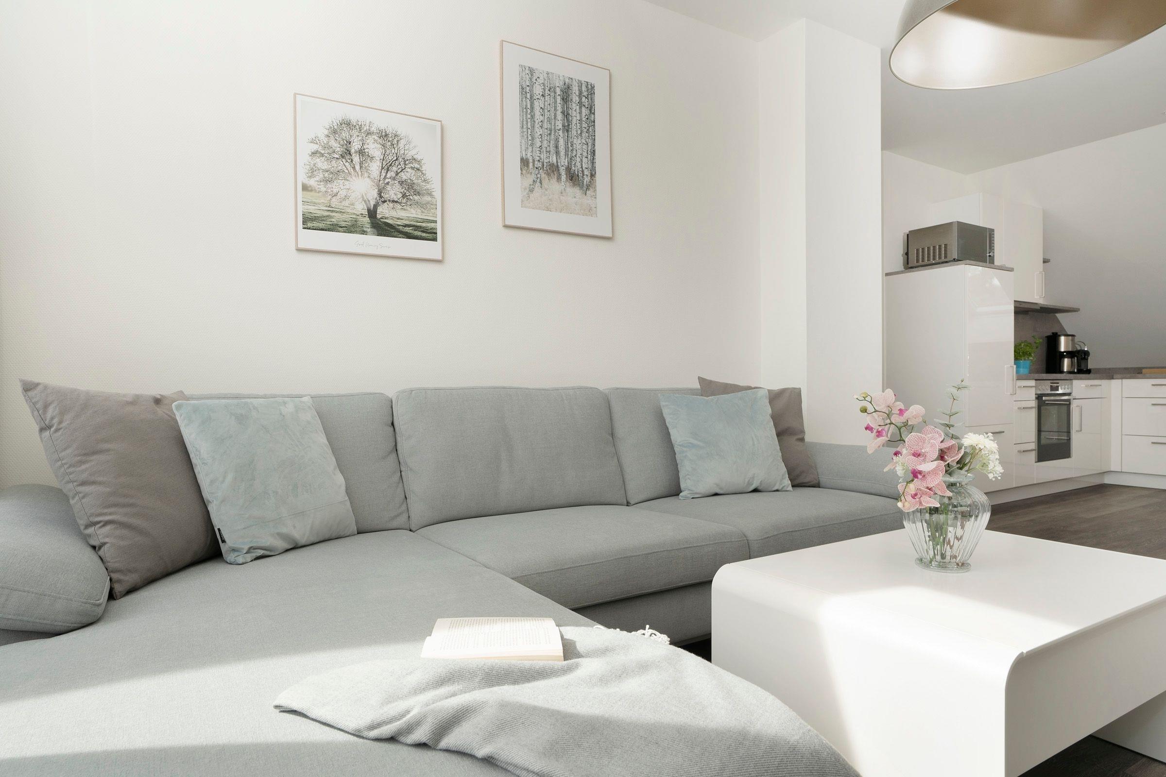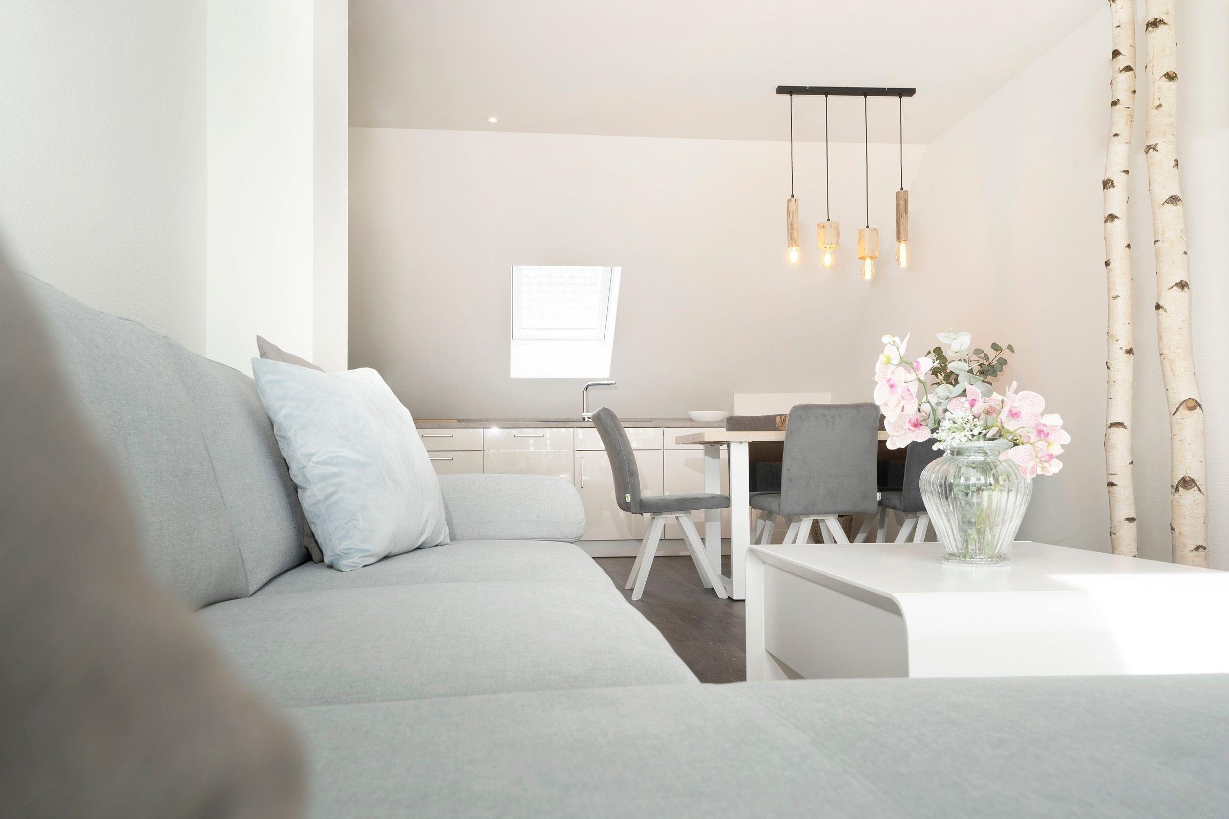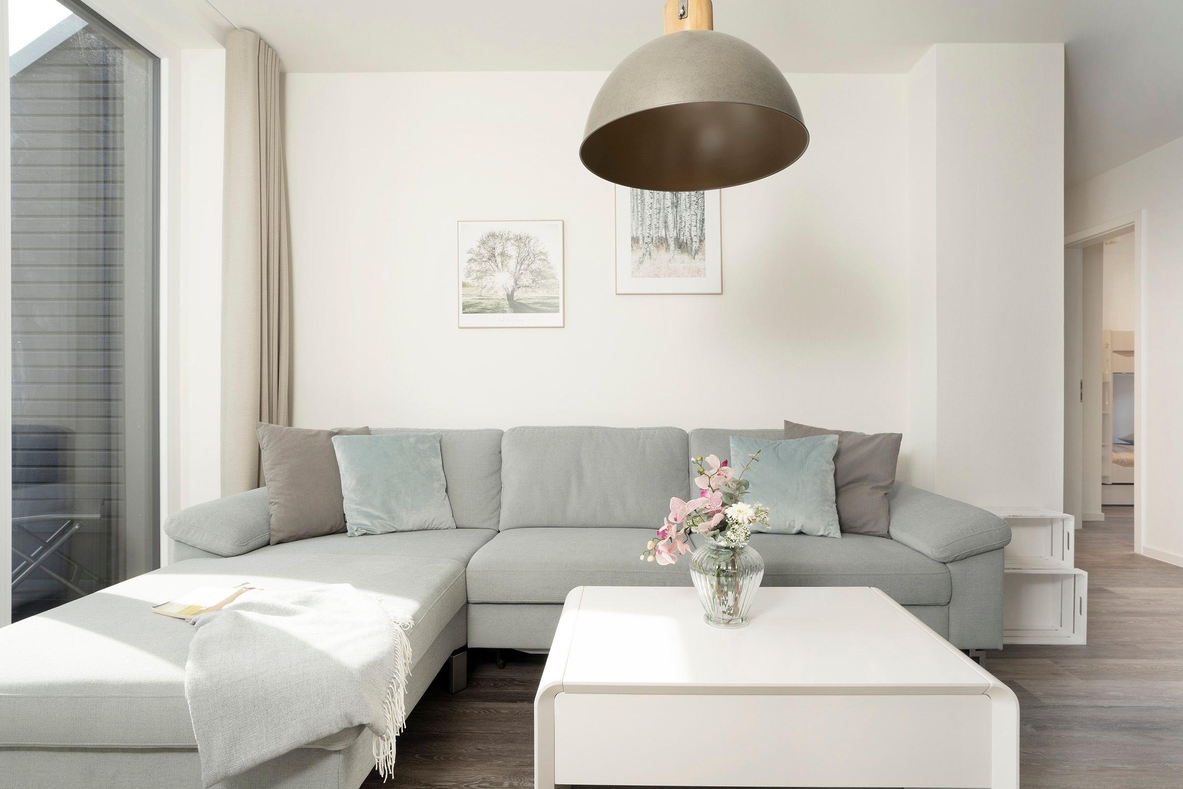 Ankommen und wohlfühlen - es empfängt Sie ein großzügiger Wohnbereich mit gemütlicher Couch, die sich bei Bedarf in einen weiteren Schlafplatz (2x 80x200cm) verwandeln lässt. Für ausreichend Unterhaltung ist mit einem Smart-TV, einem Bluetooth-Audiogerät sowie der WLAN-Verbindung bestens gesorgt.