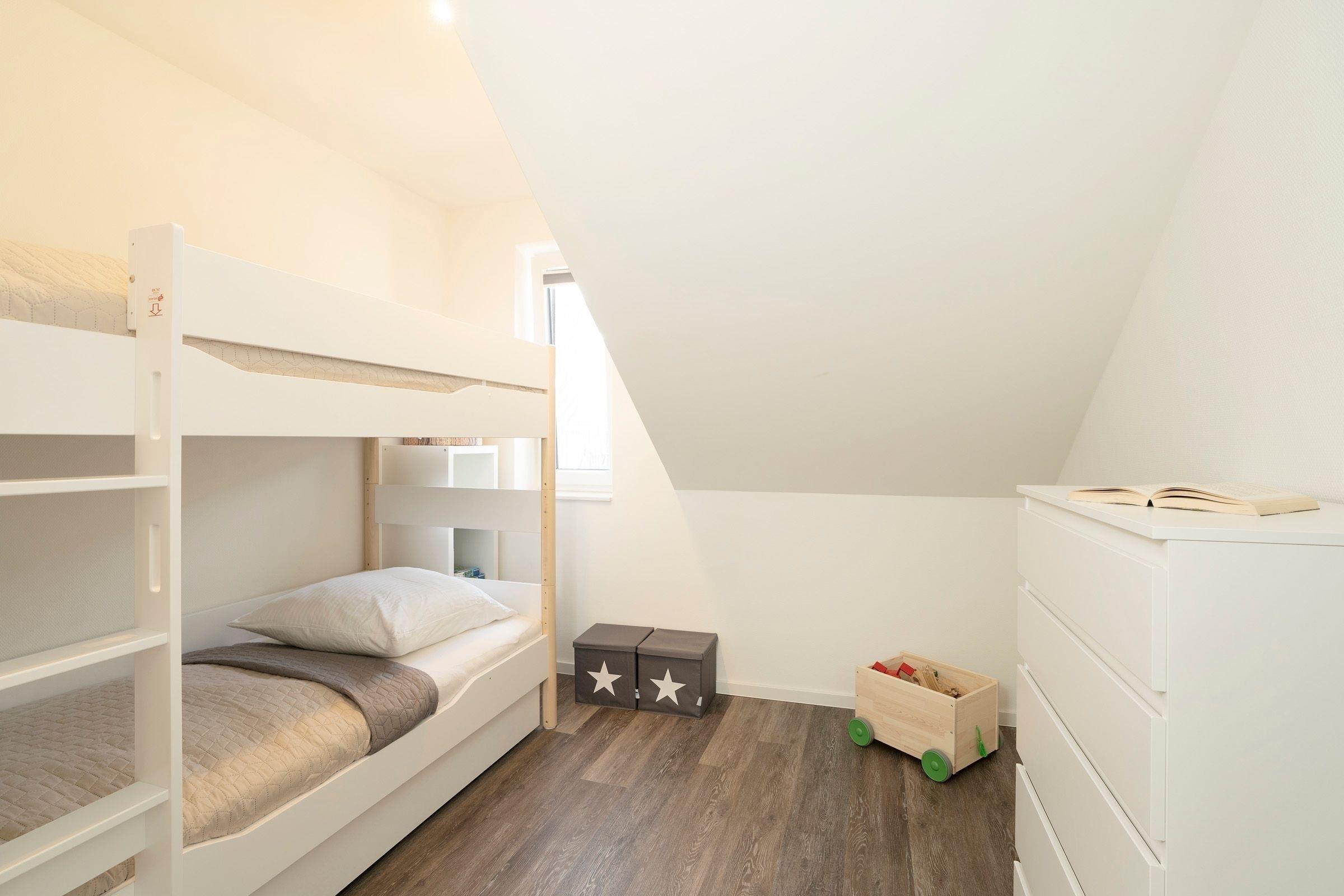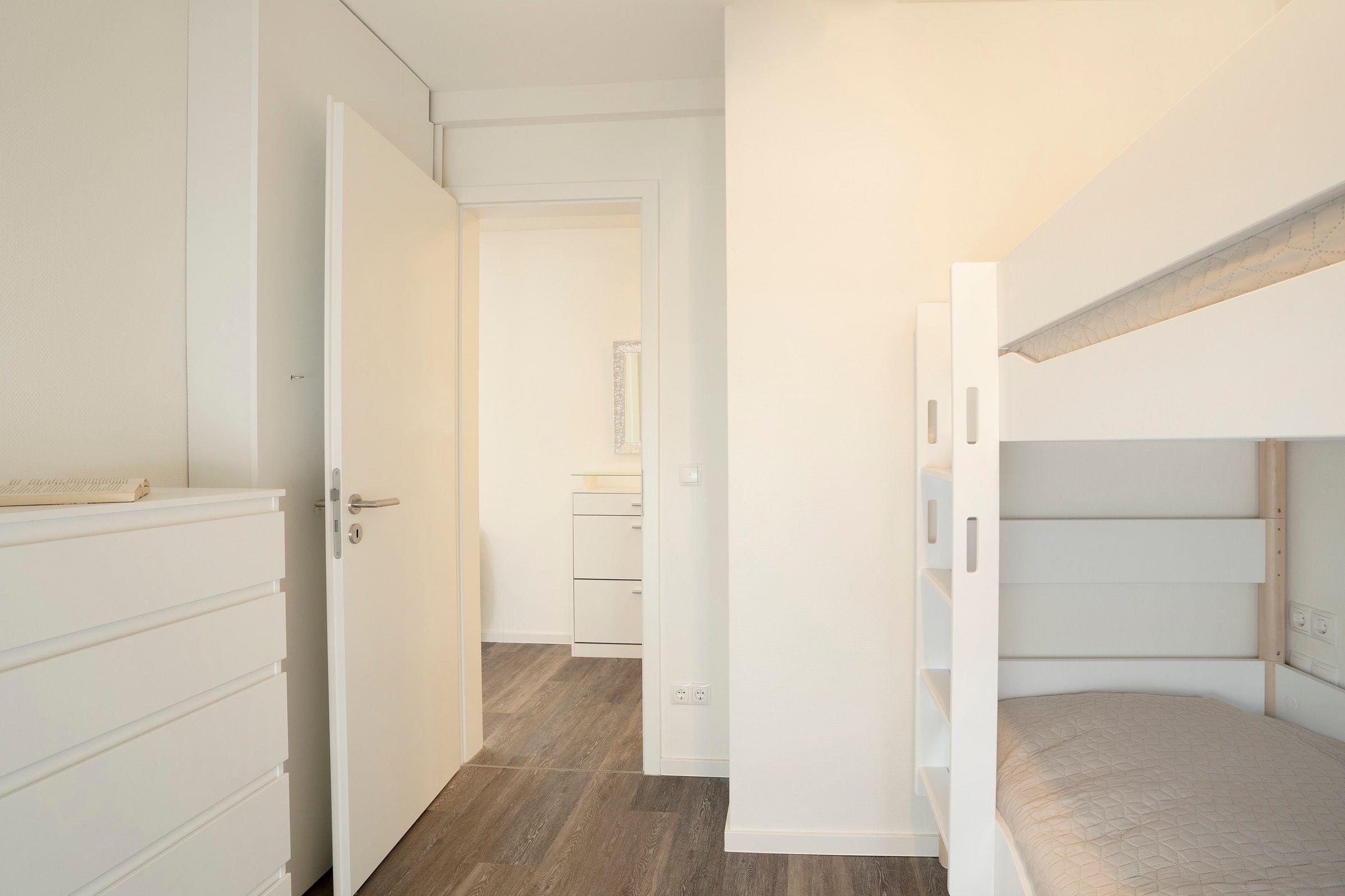 Eines der beiden separaten Schlafzimmer ist mit einem Boxspring-Doppelbett in Übergröße (2x 100x220 cm) und einem weiteren TV ausgestattet. Ihre Urlaubsgarderobe können Sie problemlos im Kleiderschrank verstauen. Im zweiten Schlafzimmer finden 2 Personen im Etagenbett Platz (je 90x200 cm). Das untere Bett kann mühelos durch eine ausziehbare Matratze um einen dritten Schlafplatz (90x200 cm) erweitert werden. Das voll ausgestattete Badezimmer bietet als Highlight eine eigene Sauna, in der es sich auch an kälteren Tagen herrlich entspannen lässt.