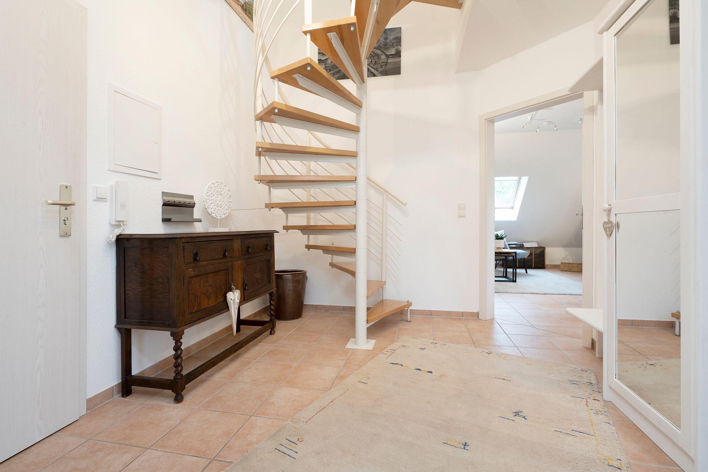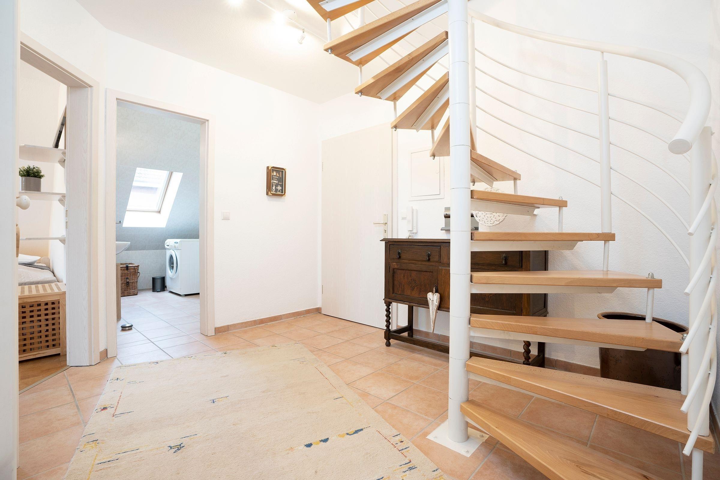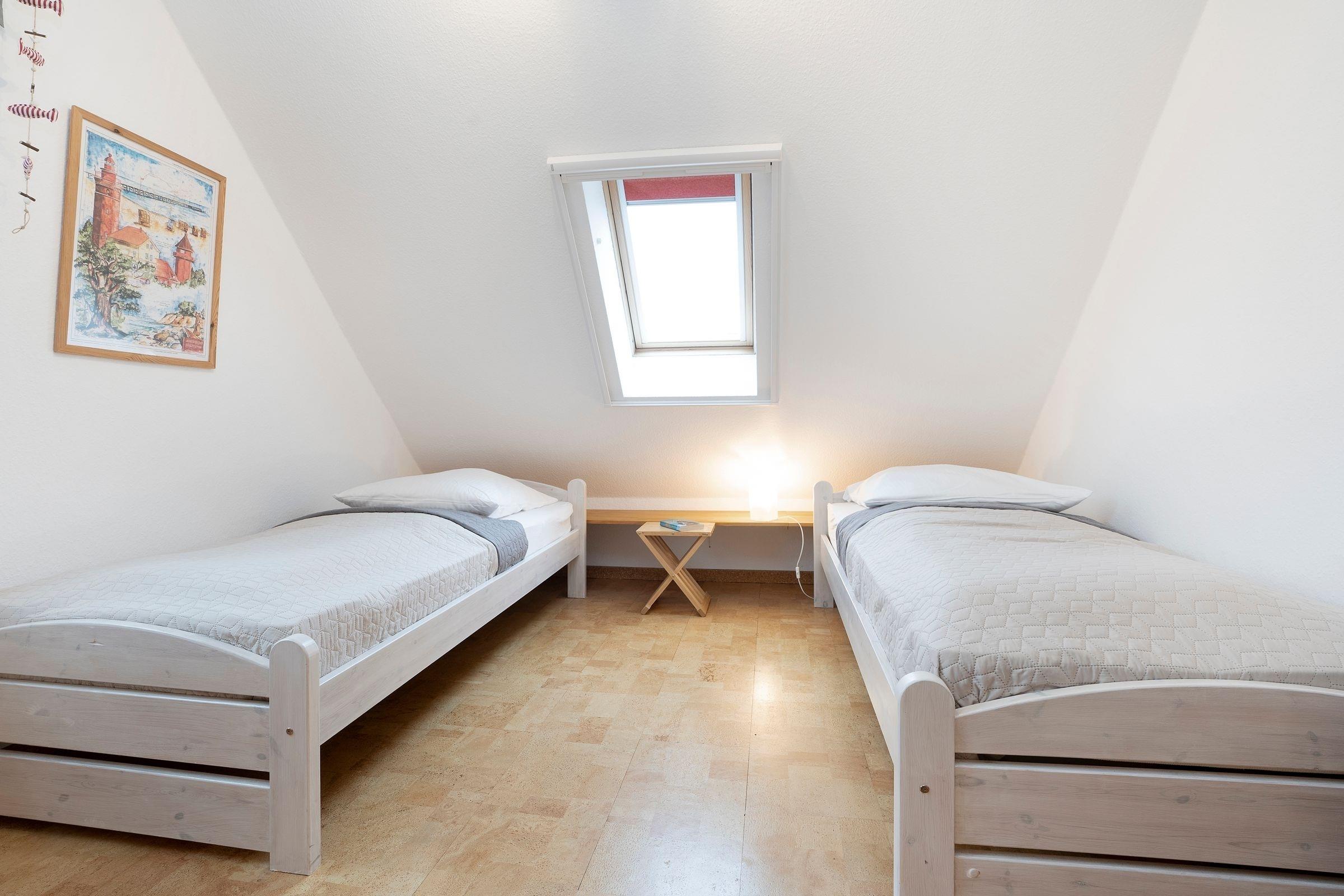 Im ersten Obergeschoss des Hauses empfängt Sie diese Ferienwohnung mit einem gemütlichem Wohnzimmer und voll ausgestatteter Küche, die keine Wünsche offen lässt. Auf dieser Etage befinden sich auch das erste Schlafzimmer mit gemütlichem Doppelbett (2x 80x200 cm), praktischem Kleiderschrank und Rollläden für die Nachtruhe, sowie das Vollbad für einen entspannten Start in den Tag. Folgen Sie der Wendeltreppe in das zweite Obergeschoss und entdecken Sie Schlafzimmer Nr. 2 mit einem Doppelbett (2x 90x200 cm), Kleiderschrank und genug Platz für ein Kinderreisebett. Auch diesen Raum können Sie für die nächtliche Erholung mittels Rollläden und Gardinen abdunkeln. Wer sich nach Tageslicht sehnt, wird auf dem möblierten Balkon mit Nord-Ost-Ausrichtung fündig.