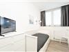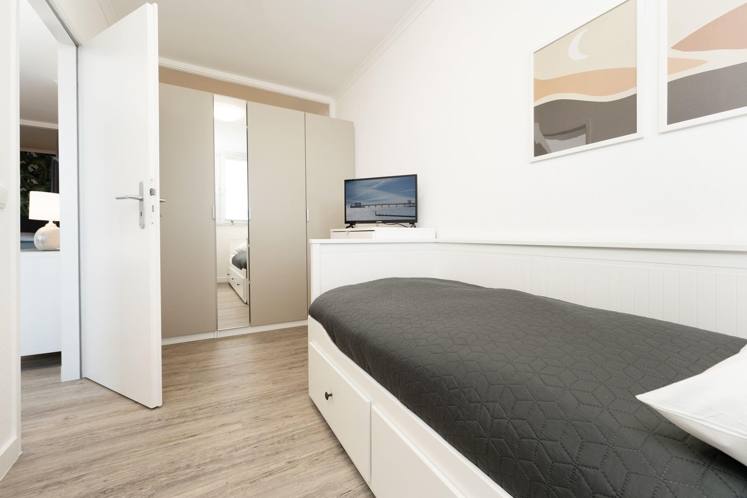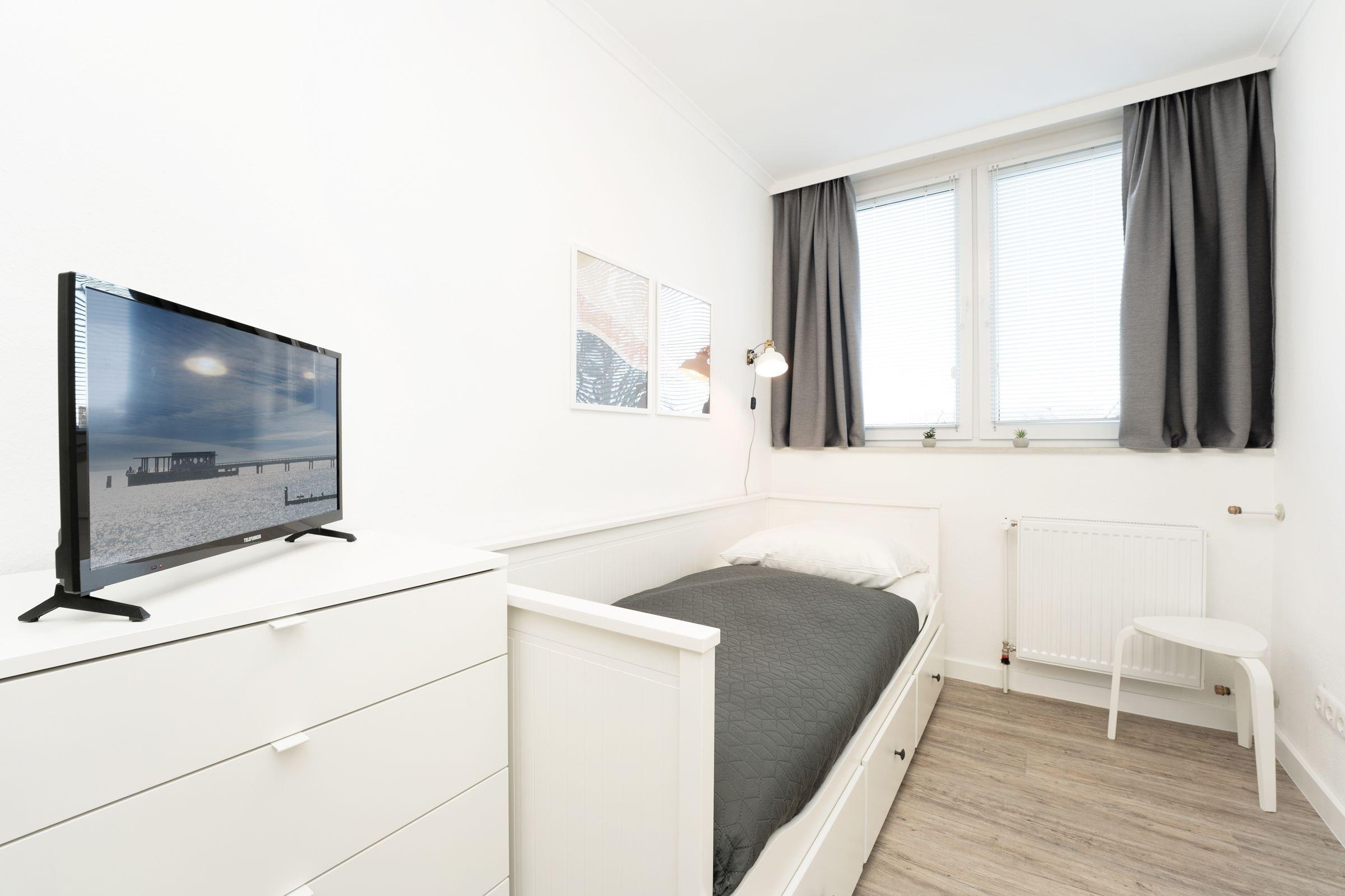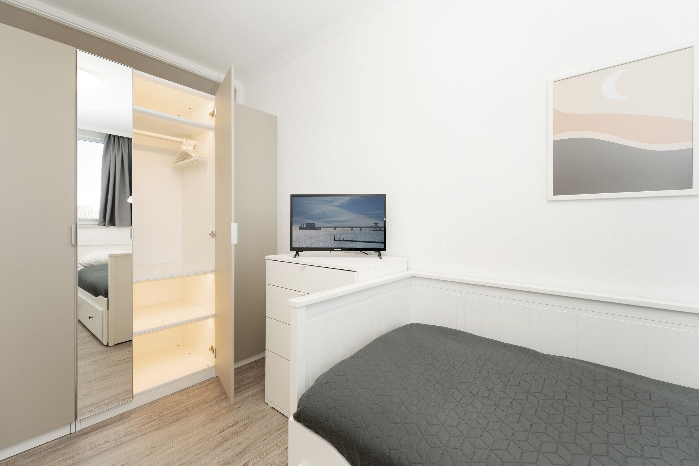 Schlafzimmer: 1 Kojenbett (2x 80x200 cm), Kleiderschrank, TV, Verdunkelung: Rollo + Vorhänge, kein Platz für Babybett