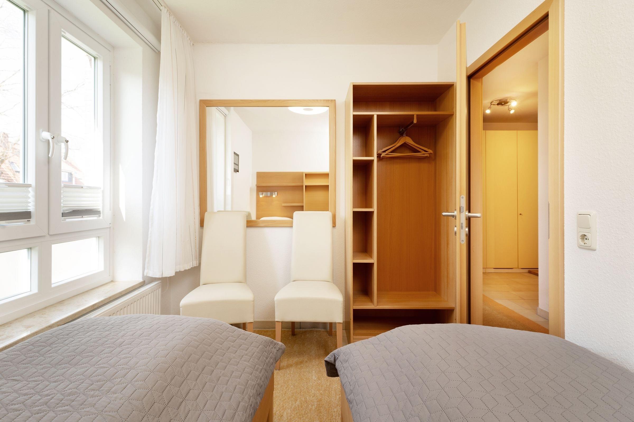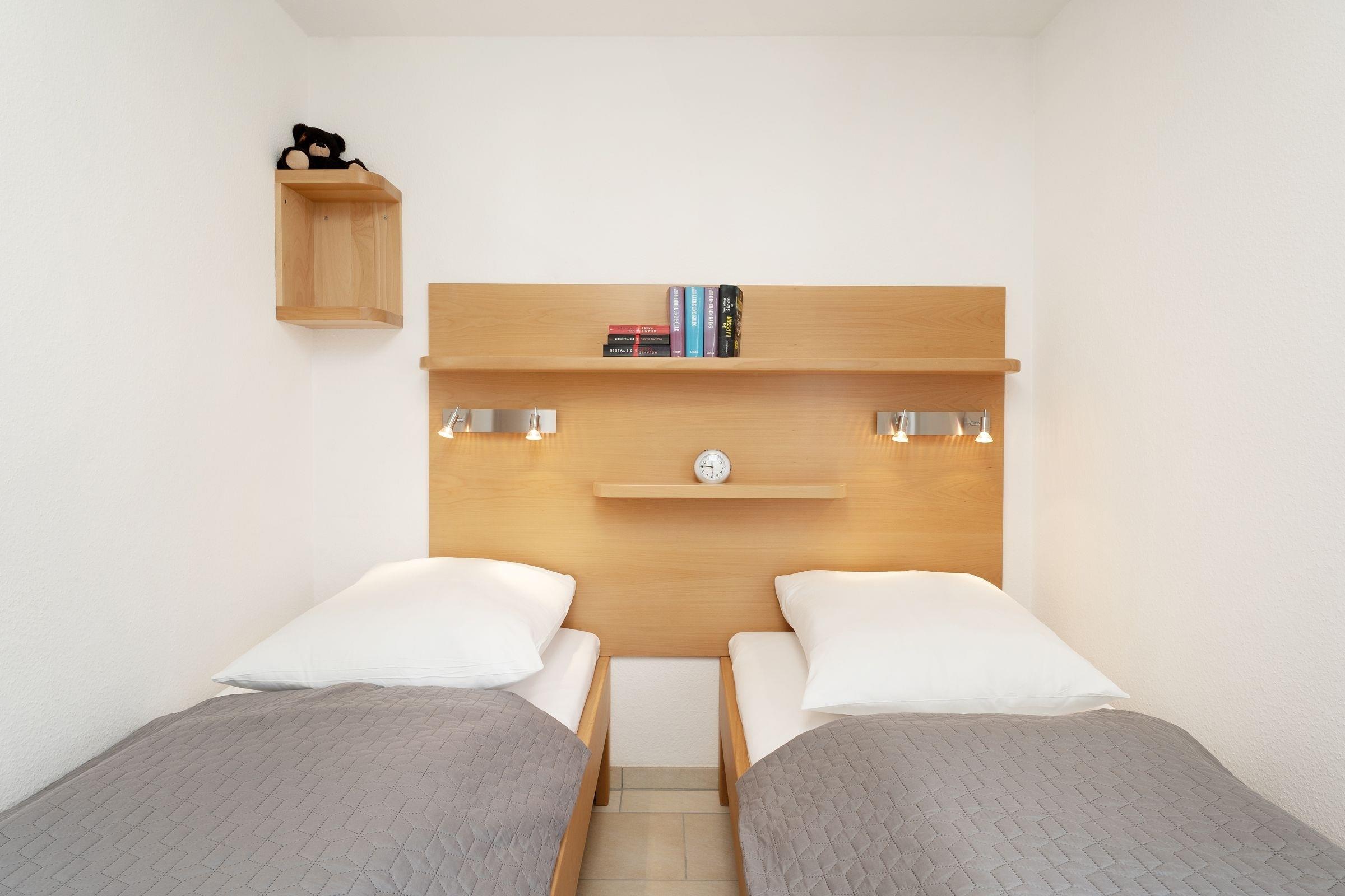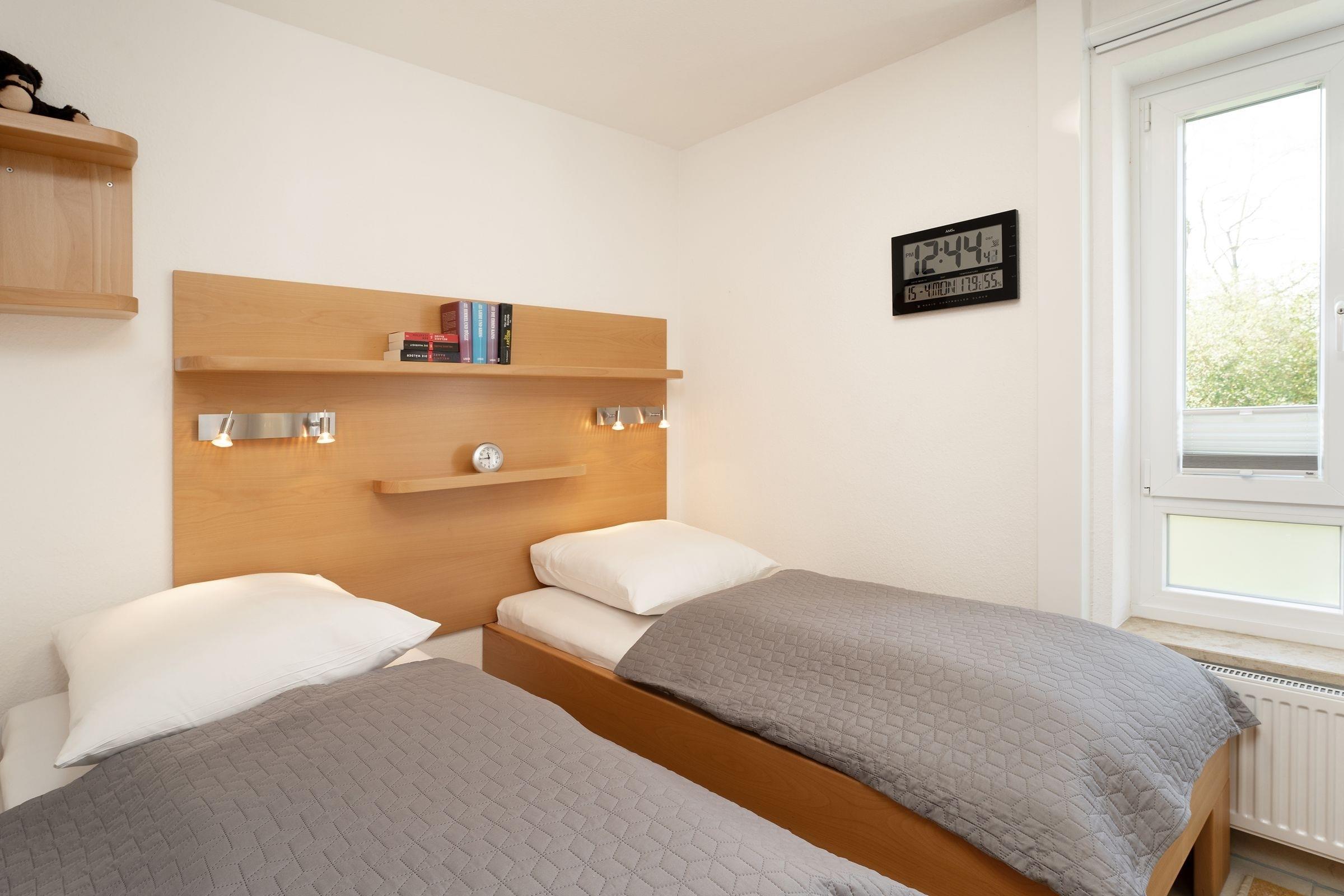 Schlafzimmer 1: 2 Einzelbetten (je 90x200cm), Verdunkelung: Rollo & Plissees, Platz für Babybett vorhanden