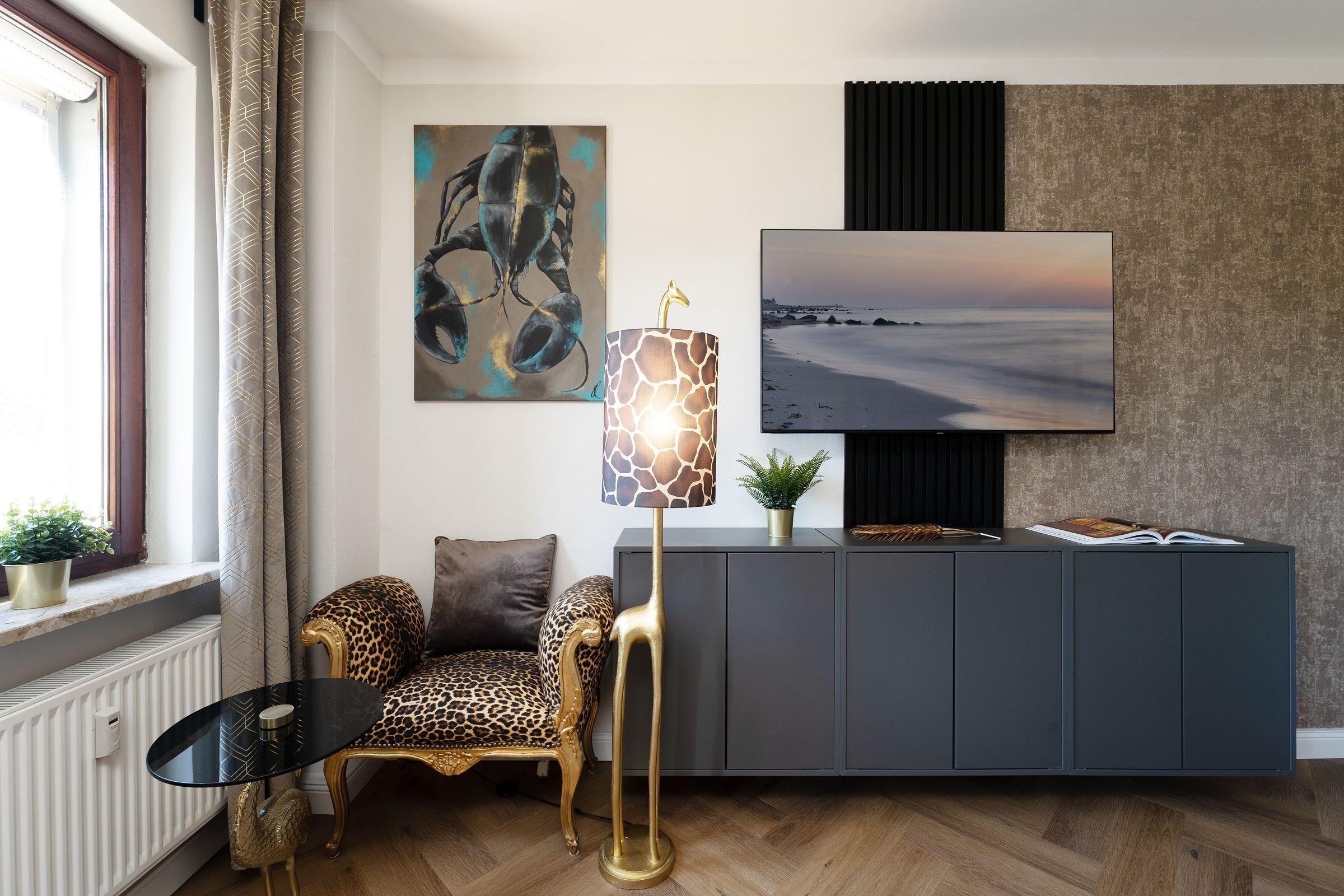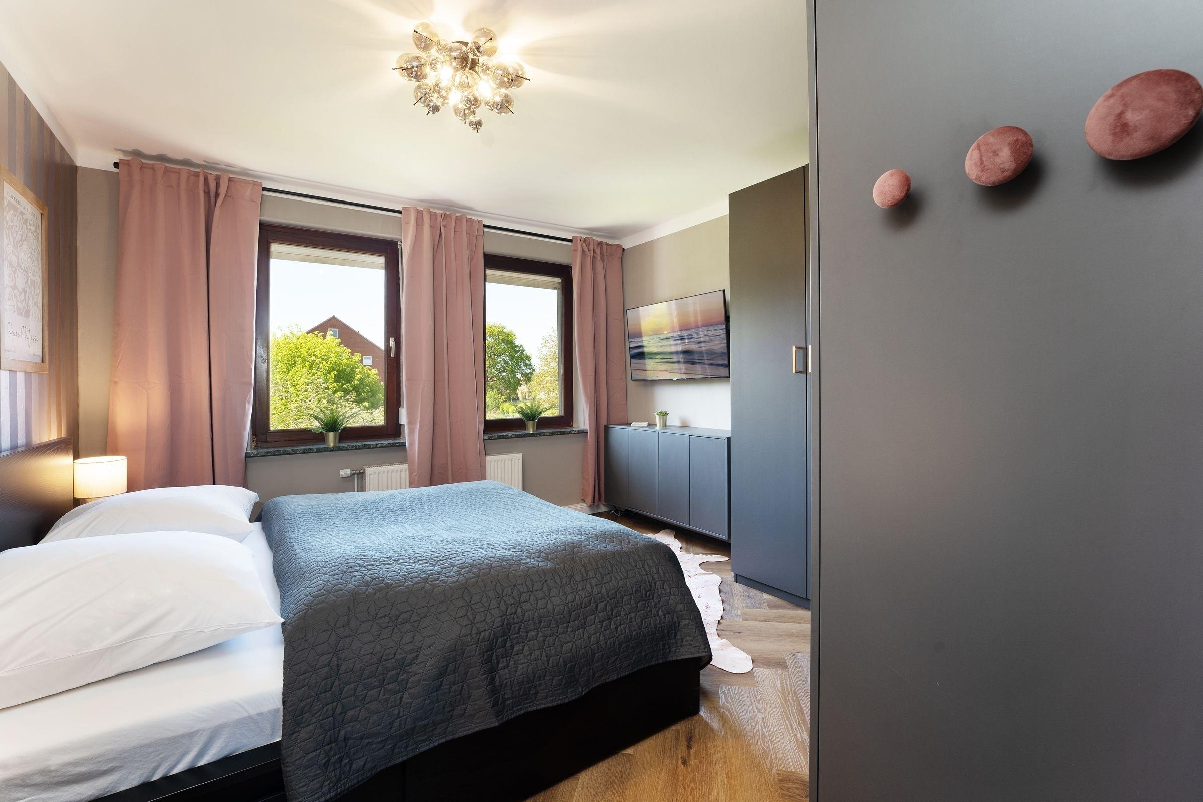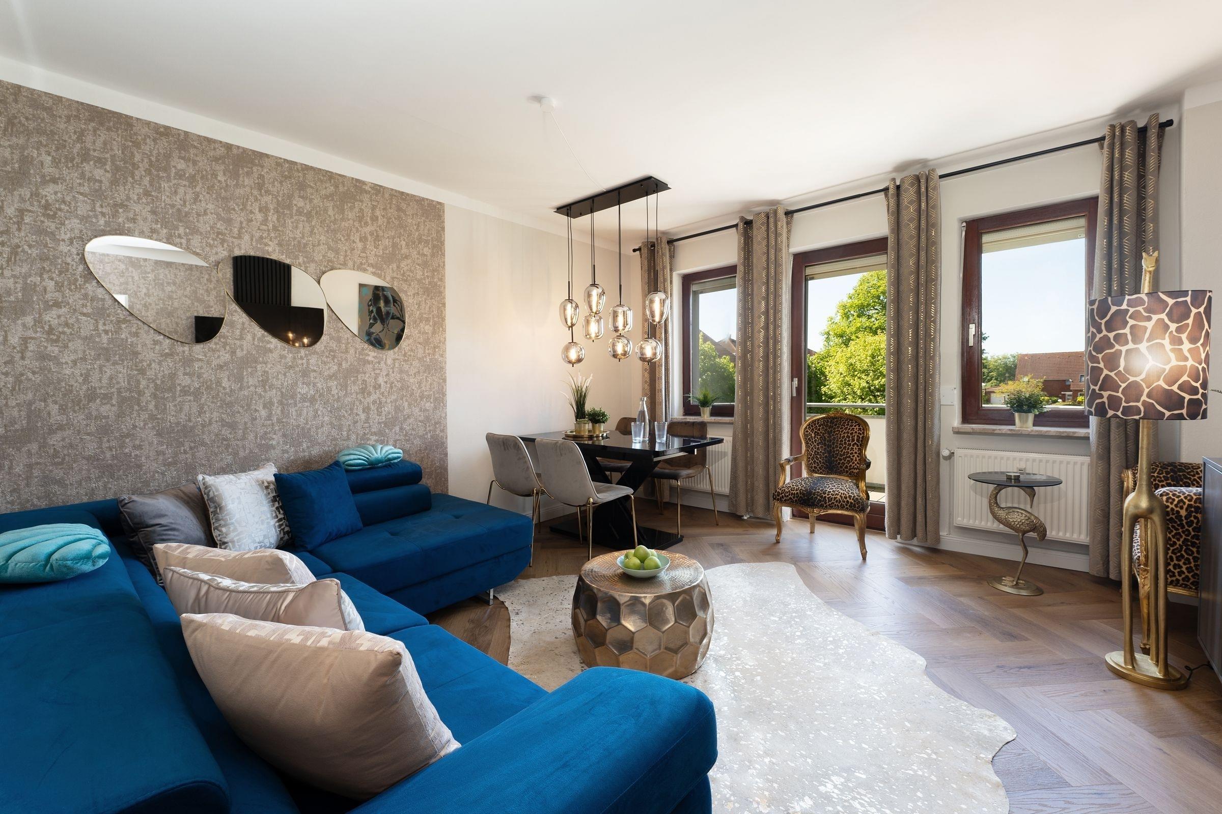 Wunderbar anders präsentiert sich diese individuelle Ferienwohnung Ihren Gästen. Im Wohn- und Essbereich findet jeder ein Plätzchen zum Entspannen und ein gemeinsames Dinner am gemütlichen Esstisch rundet einen aufregenden Urlaubstag ab. Reisen Sie mit 5 Personen, lässt sich das Sofa in einen komfortablen Schlafplatz verwandeln (ca. 125x200 cm). Vom Wohnbereich aus gelangen Sie auch auf den möblierten Balkon in Südlage, auf dem Sie das gute Wetter auskosten können. Für angenehme Nächte stehen Ihnen 2 separate Schlafzimmer mit je einem Doppelbett (ca. 180x200cm) und einem Kleiderschrank zur Verfügung. Lassen Sie sich vom Flair des Design-Duschbades bezaubern und starten Sie mit einer erfrischenden Dusche in den Tag.