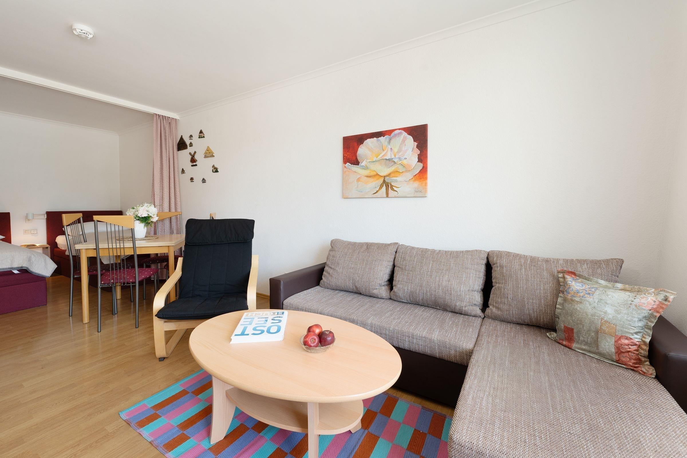 Nur rund 130 Meter vom Ostseestrand entfernt befindet sich die Wohnung Seestern in der schönen Ferienwohnanlage Strandappartements am Leuchtturmweg. Vom überdachten, möblierten Balkon aus können Sie die gute Seeluft genießen und die Möwen hören. Küstenurlaub pur! Im Wohn-/Schlafbereich befinden sich eine gemütliche TV-Ecke sowie für die Nacht ein bequemes Boxspringbett (2x 90x200 cm). Im separaten Schlafzimmer steht Ihnen zudem ein kleines Doppelbett (140x190 cm) zur Verfügung. Ein Kleiderschrank hier hat Platz für Ihre Urlaubgarderobe. Für die Selbstverpflegung gibt es eine Kochnische, die funktional ausgestattet ist und u.a. über ein Mikrowellen-Back-Kombigerät verfügt. Das innenliegende Duschbad mit Föhn und Kosmetikspiegel bringt Sie entspannt in den neuen Tag.