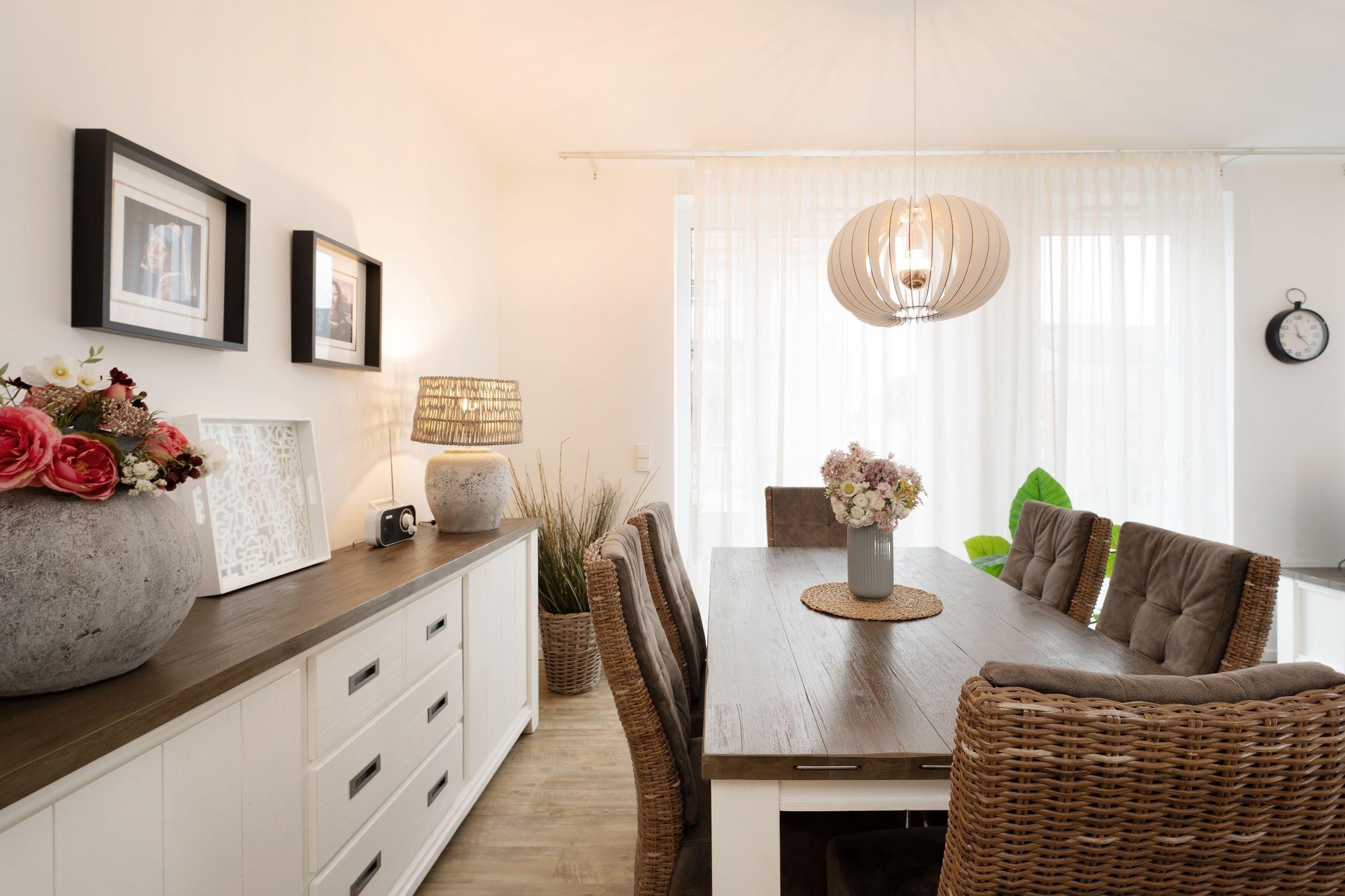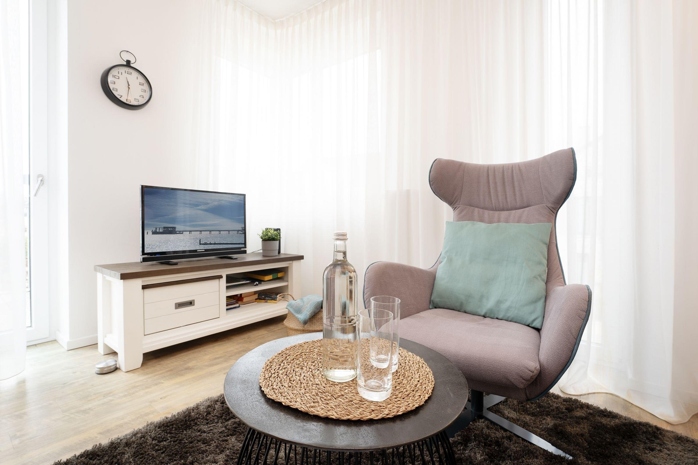 Nur wenige Schritte vom feinsandigen Strand entfernt, erwartet Sie diese liebevoll eingerichtete Ferienwohnung. Der lichtdurchflutete Wohnbereich bietet ideale Bedingungen für Entspannung nach einem Tag am Meer mit einem gemütlichen Sofa, Sessel und Flachbildfernseher. Die offene Küche ist voll ausgestattet, inklusive Elektroherd, Spülmaschine und Kaffeemaschine, sodass Sie Ihre Lieblingsgerichte bequem zubereiten oder sich an neu entdeckten regionalen Spezialitäten versuchen können. Der Essbereich lädt zu gemeinsamen Mahlzeiten ein.