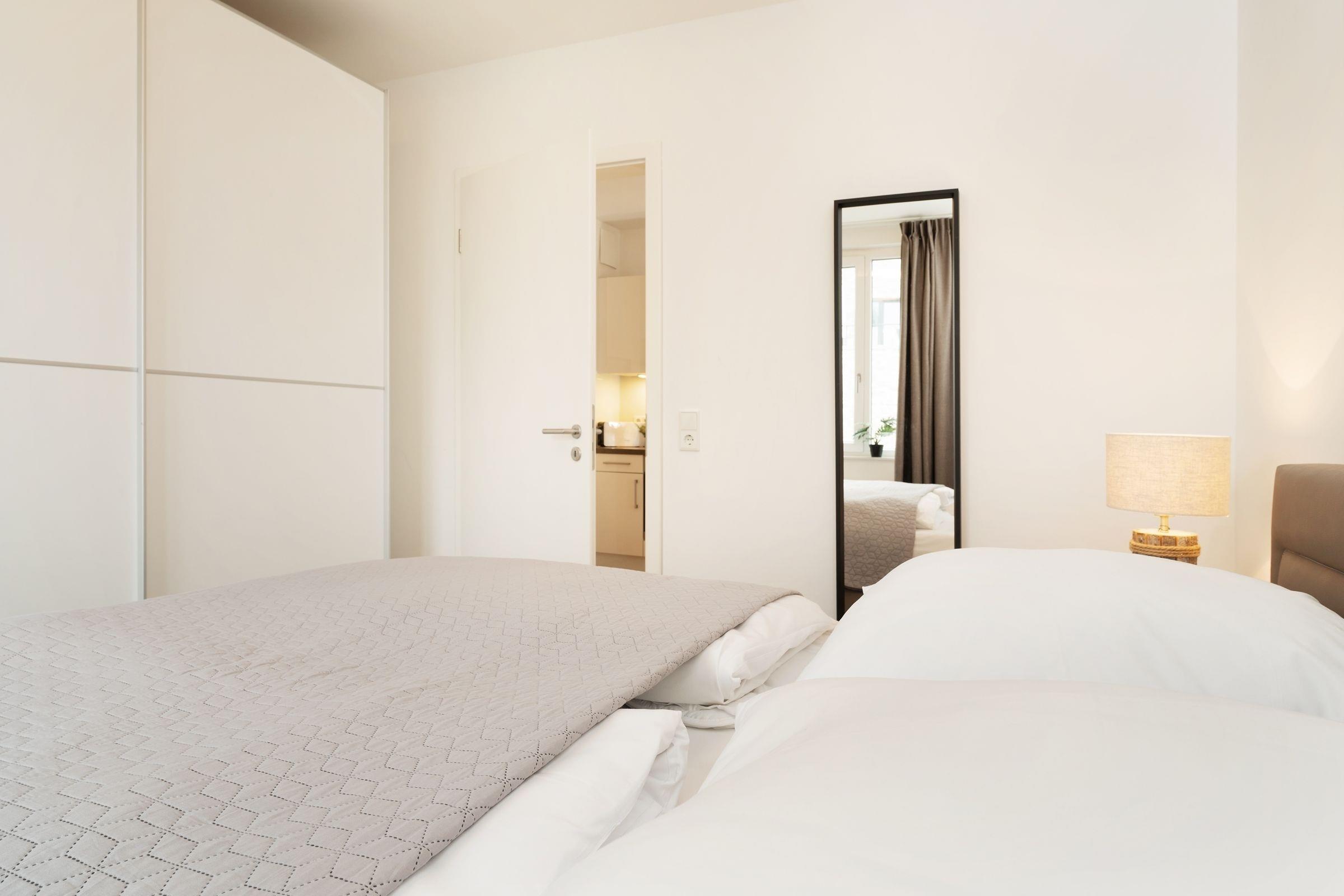 Schlafzimmer 1: 1 Boxspring-Doppelbett (180x200cm), TV, Kleiderschrank, Verdunkelungsgardinen, Platz für Babybett