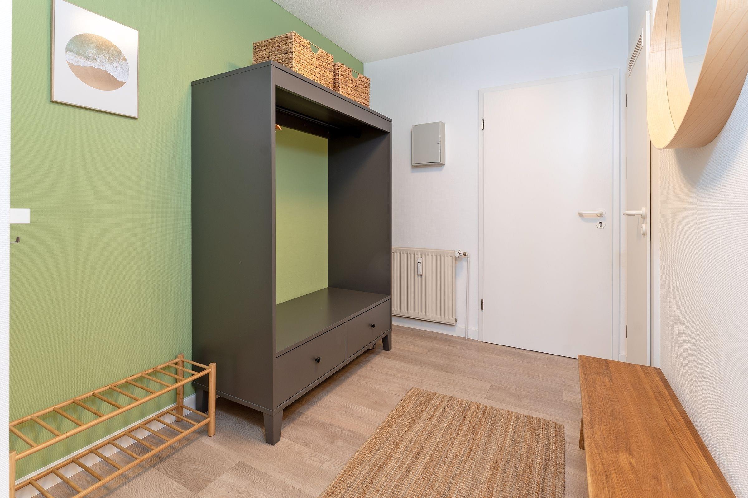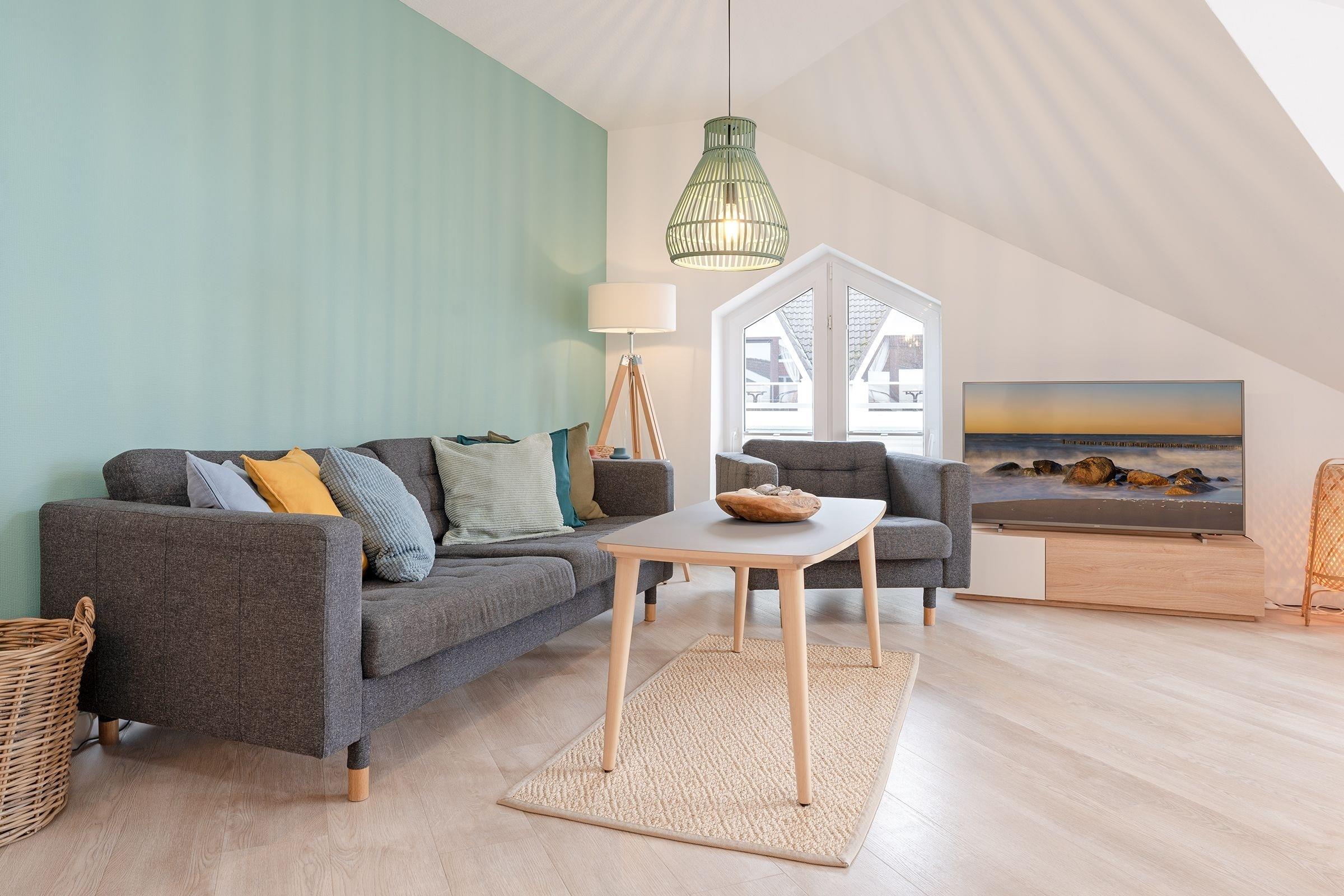 Diese einladende Ferienwohnung liegt nur ca. 240 Meter vom Strand von Kellenhusen entfernt und bietet den perfekten Ausgangspunkt für einen erholsamen Urlaub an der Ostsee. Der geräumige Wohn- und Essbereich lädt zum Verweilen ein und ist mit einem TV sowie einem großzügigen Esstisch ausgestattet. Vom Wohnzimmer aus betreten Sie den südwestlich ausgerichteten Balkon, auf dem gemütliche Gartenmöbel bereitstehen – ideal für entspannte Stunden in der Sonne. Die Küche ist gut ausgestattet und verfügt u. a. über einen Kühlschrank mit Gefrierfach, Spülmaschine, Kaffeemaschine und einem Kombigerät Mikrowelle-Backofen.