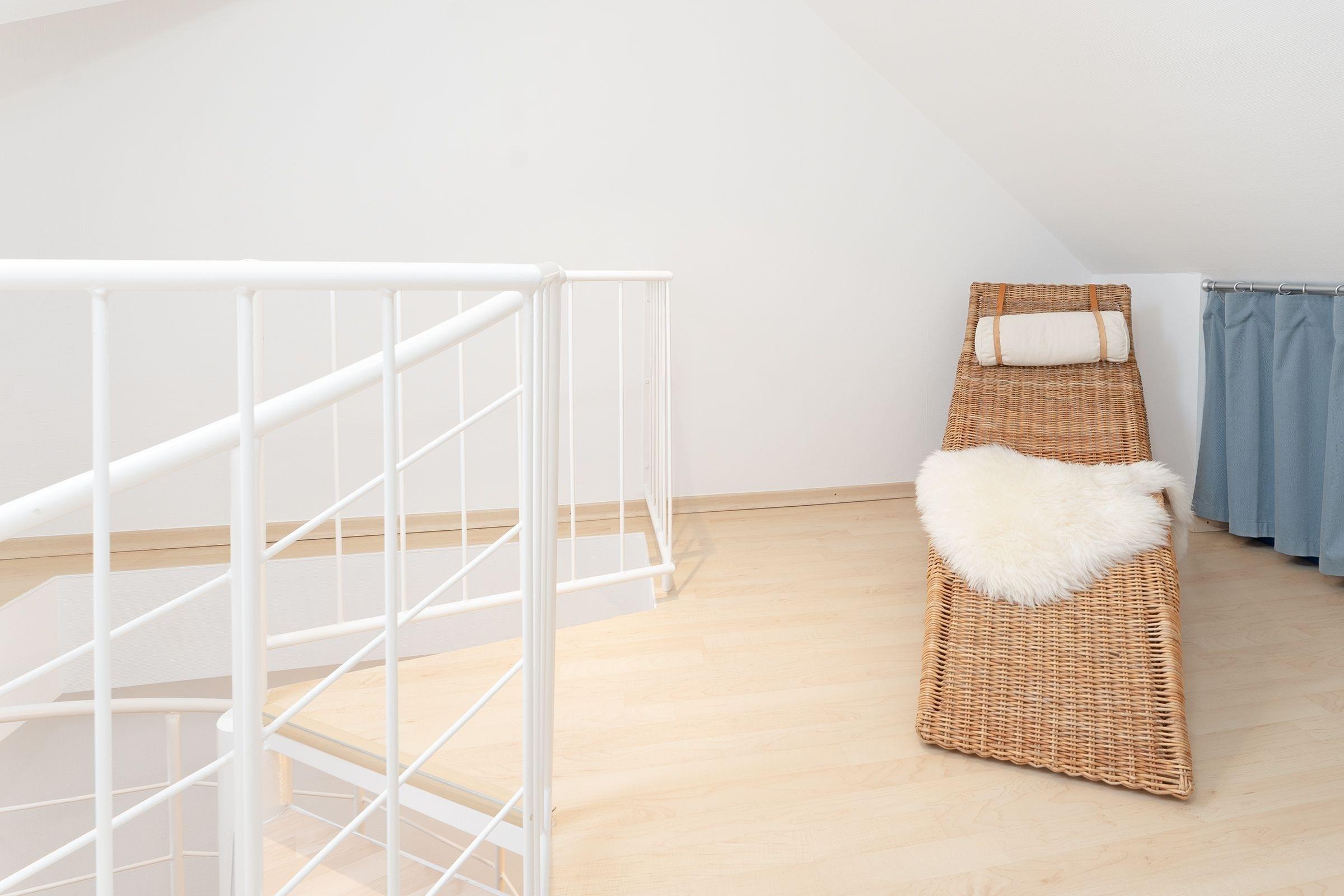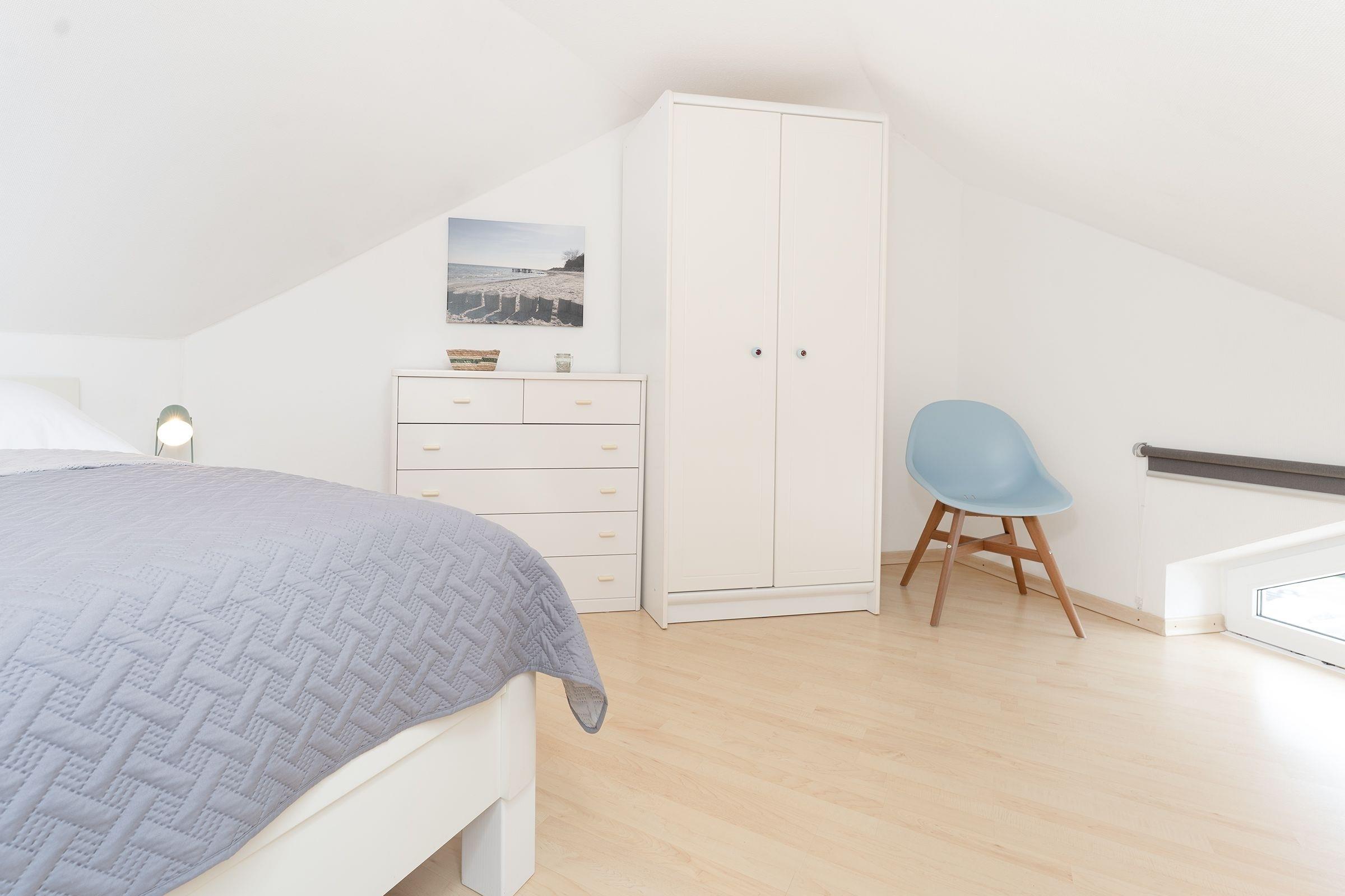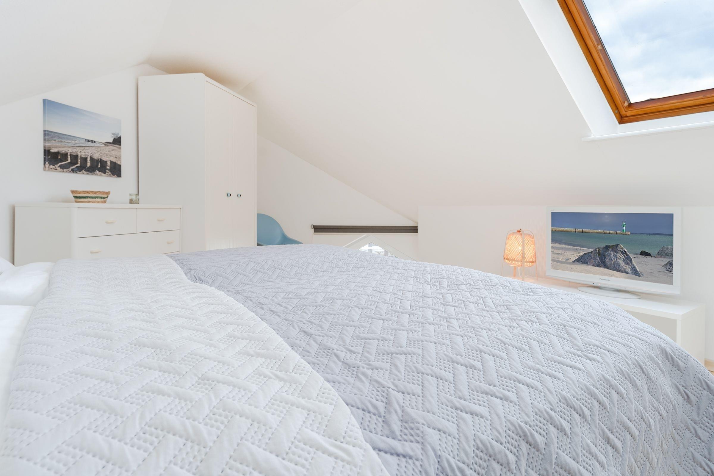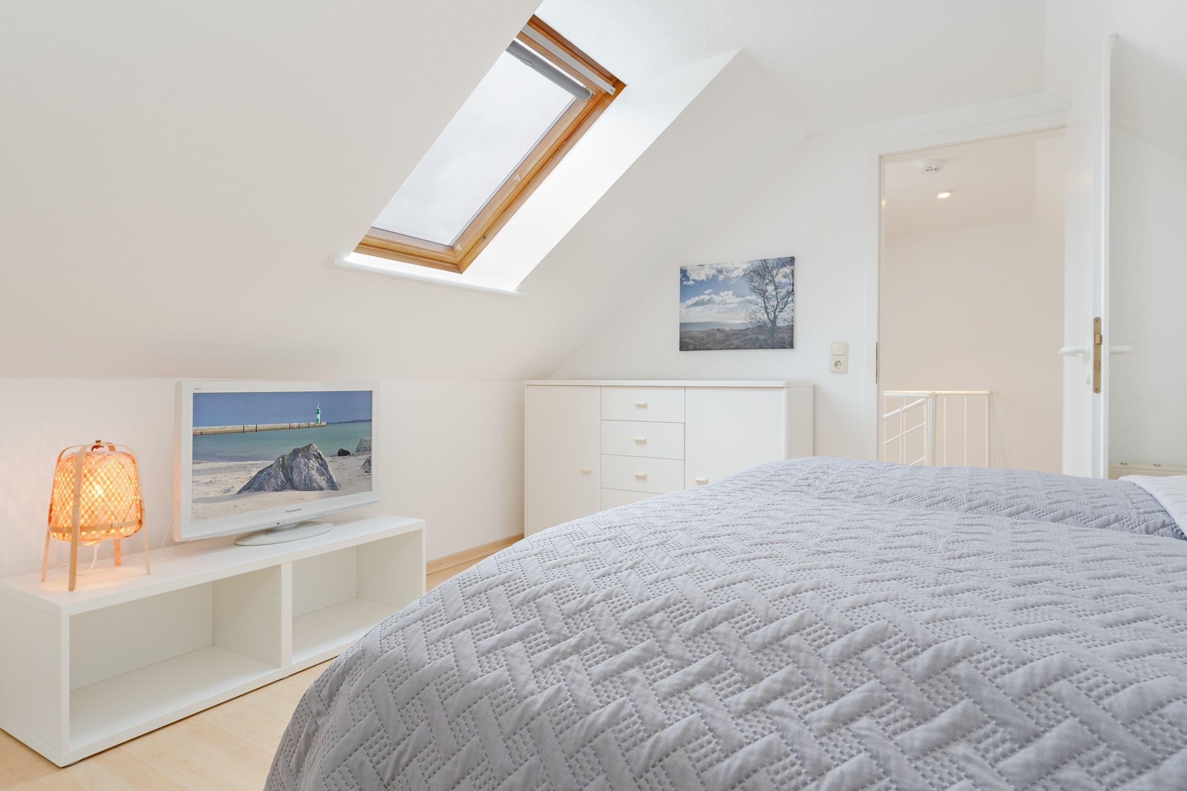 Das separate Schlafzimmer mit zwei Einzelbetten (je 80x200 cm) grenzt an das Wohnzimmer. Das Hauptschlafzimmer mit Doppelbett (2x 90x200 cm) und Fernseher erreichen Sie über eine charmante Wendeltreppe. Beide Schlafzimmer sorgen für erholsamen Schlaf und bieten Stauraum für Ihre Urlaubsgarderobe. Das Badezimmer mit Dusche bietet zusätzlichen Komfort durch eine Fußbodenheizung und einen beheizbaren Handtuchhalter.