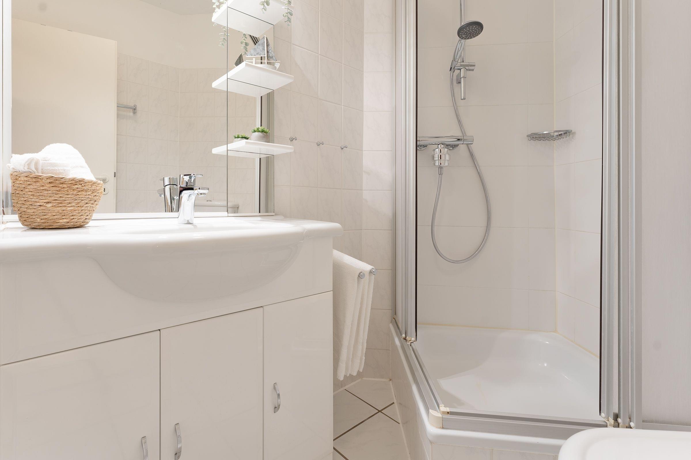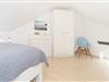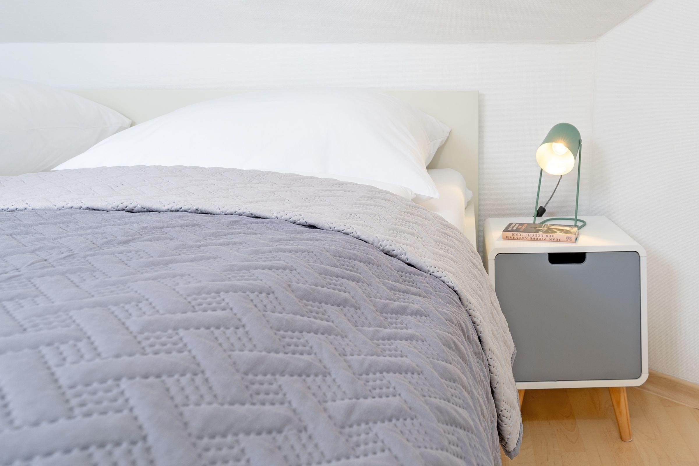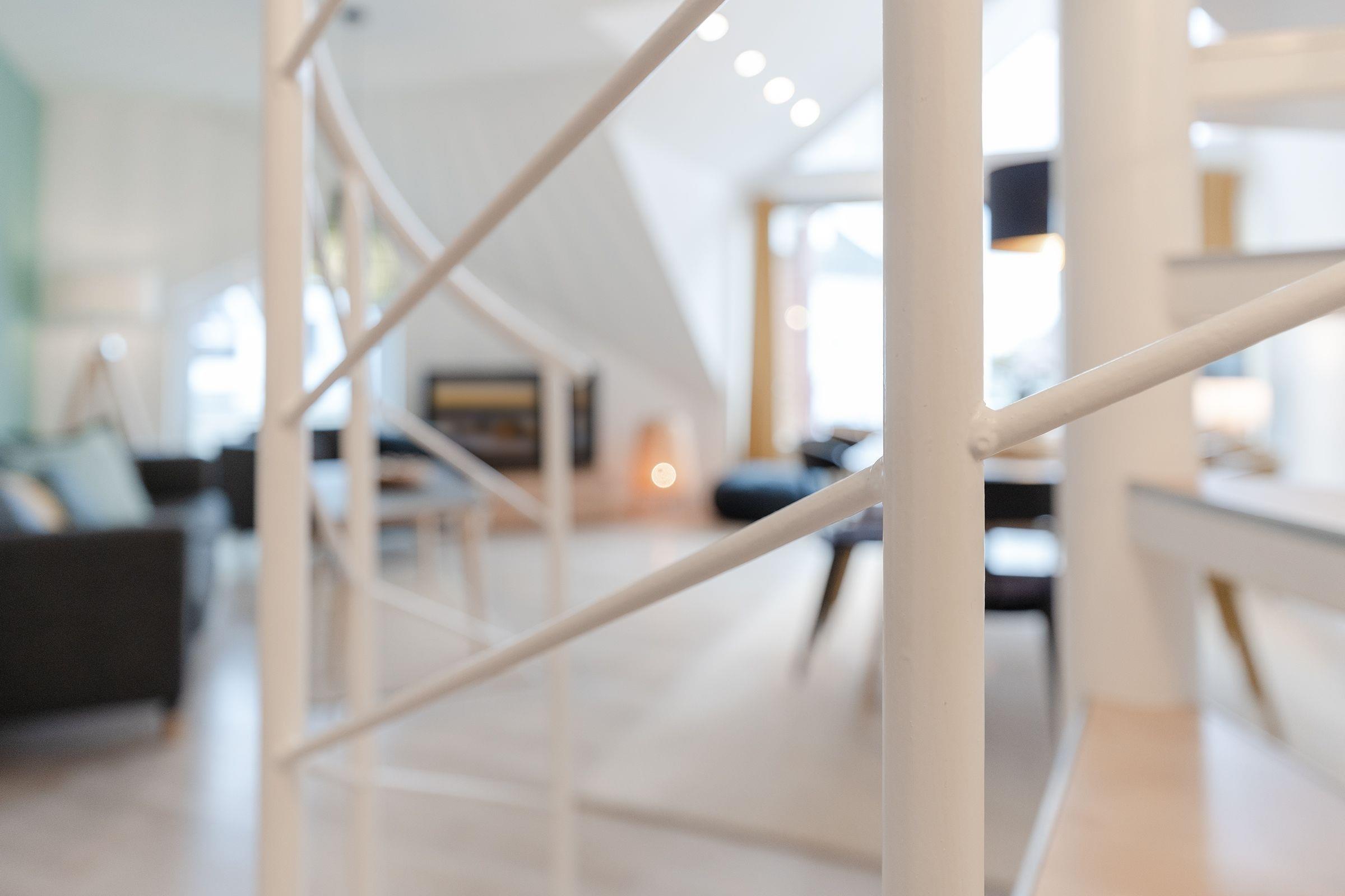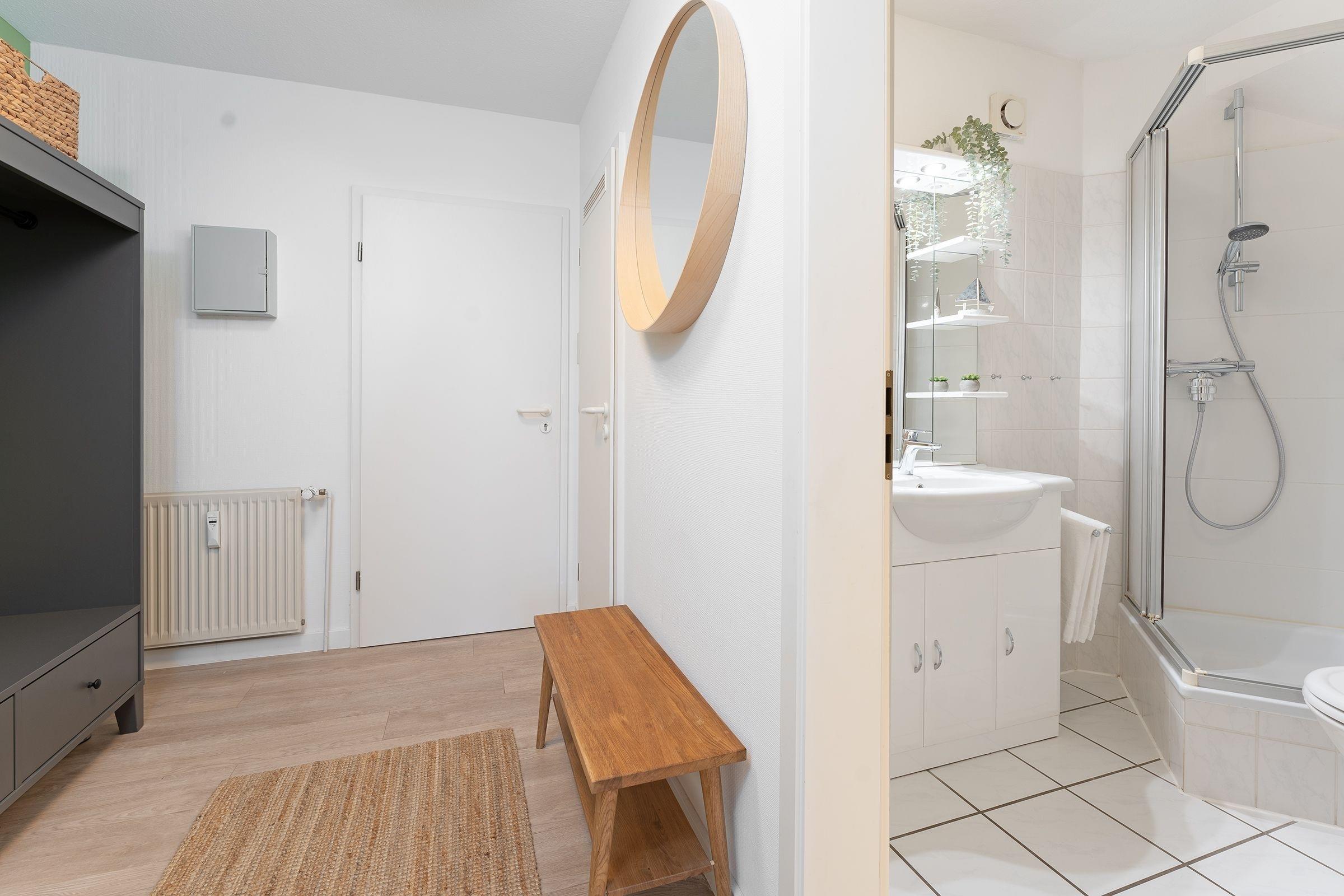 Das separate Schlafzimmer mit zwei Einzelbetten (je 80x200 cm) grenzt an das Wohnzimmer. Das Hauptschlafzimmer mit Doppelbett (2x 90x200 cm) und Fernseher erreichen Sie über eine charmante Wendeltreppe. Beide Schlafzimmer sorgen für erholsamen Schlaf und bieten Stauraum für Ihre Urlaubsgarderobe. Das Badezimmer mit Dusche bietet zusätzlichen Komfort durch eine Fußbodenheizung und einen beheizbaren Handtuchhalter.