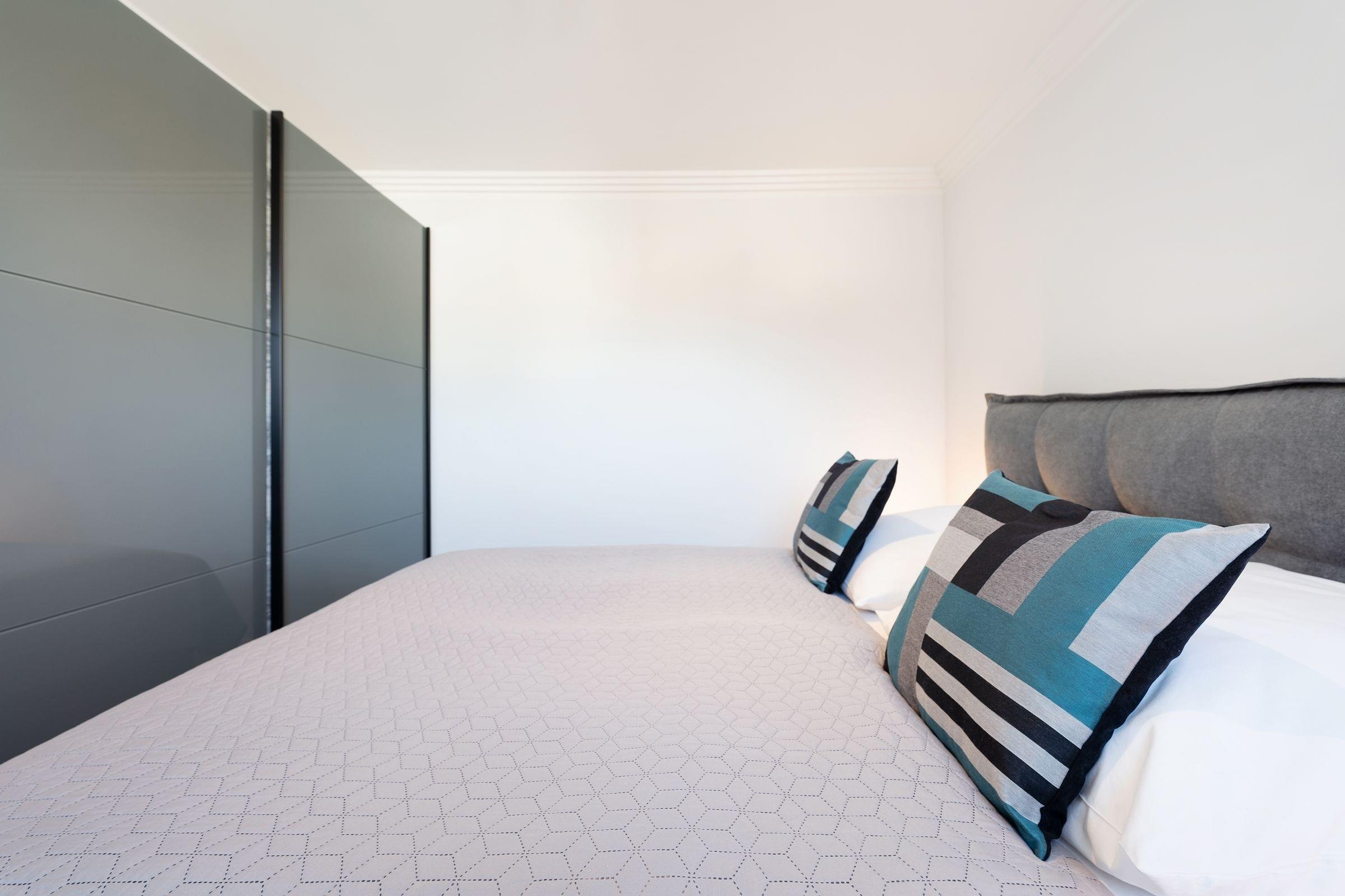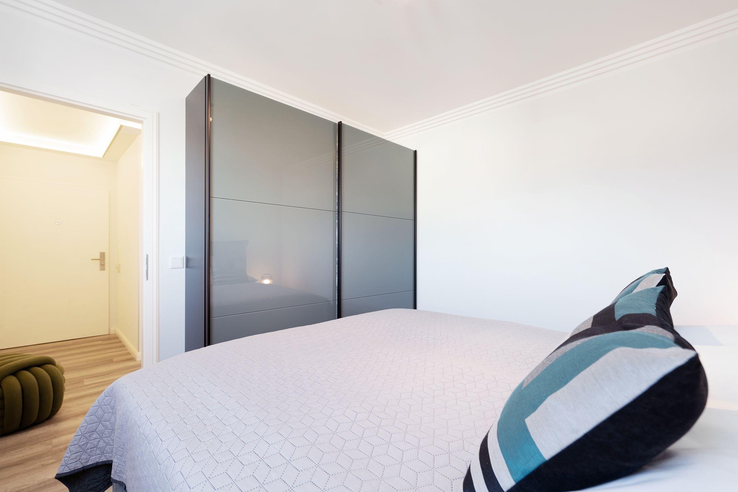 Schlafzimmer: 1 Doppelboxspringbett (180x200 cm), Kleiderschrank, Verdunkelung: Plissee, kein Platz für ein Babybett vorhanden