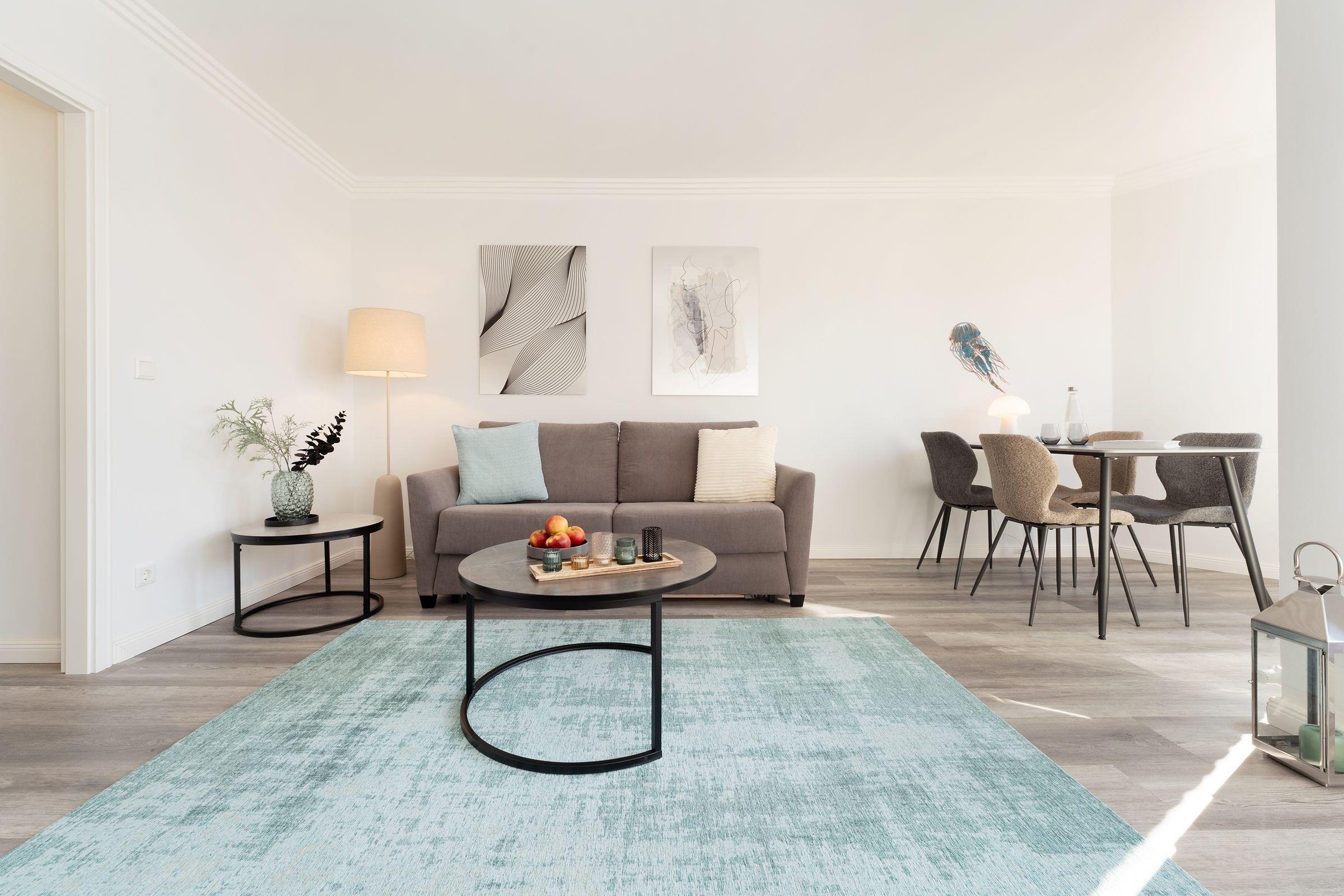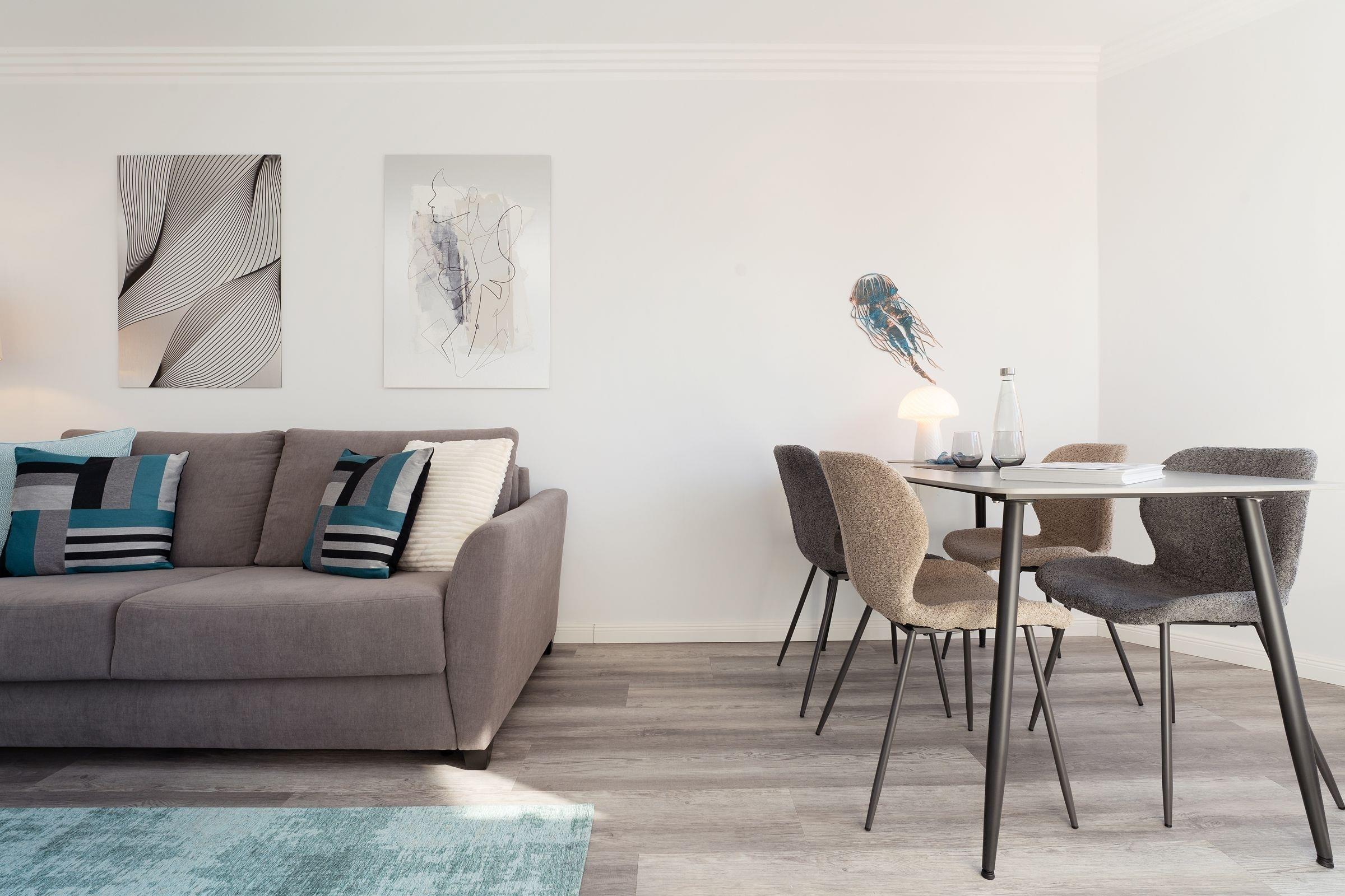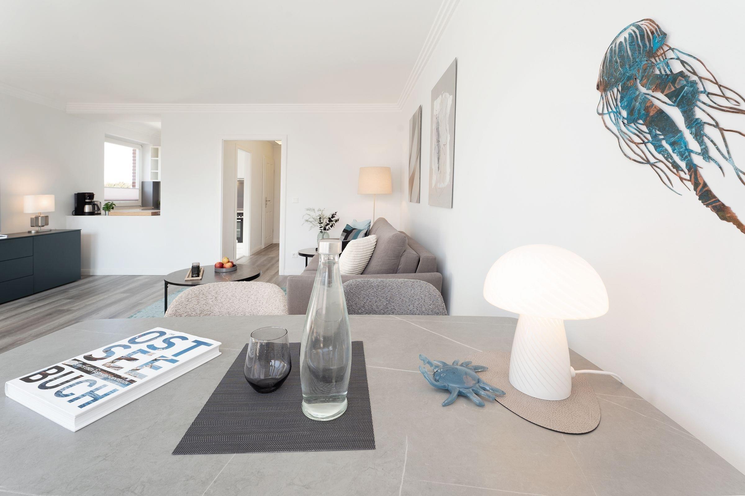 Hier trifft Moderne auf guten Geschmack. Die traumhafte Ferienwohnung Jellyfish bietet die perfekte Unterkunft für einen erholsamen Ostseeurlaub. Nur 240 m vom Strand entfernt, genießen Sie hier eine moderne und komfortable Ausstattung Das helle Wohnzimmer lädt mit einem bequemen Sofa, einem Sessel und einem TV zum Entspannen ein. Auch steht hier ein stylischer Essplatz für Sie bereit. Große Fenster lassen viel Licht in den Raum und sorgen für eine freundliche Atmosphäre. Vom Wohnbereich aus gelangen Sie auf den möblierten Balkon mit Südausrichtung für angenehme Stunden im Freien. Die halb-offene Küche ist gut ausgestattet mit einem Cerankochfeld, Backofen, Kühlschrank mit Gefrierfach, Kaffeemaschine, Toaster und Spülmaschine. Das separate Schlafzimmer ist mit einem komfortablen Doppelboxspringbett (2000x200 cm) und ausreichend Stauraum eingerichtet. Das Sofa im Wohnbereich bietet bei Bedarf einen Schlafplatz (140x200 cm) für zwei weitere Gäste. Das Badezimmer verfügt über eine Dusche, Waschbecken, WC und einen Haartrockner.