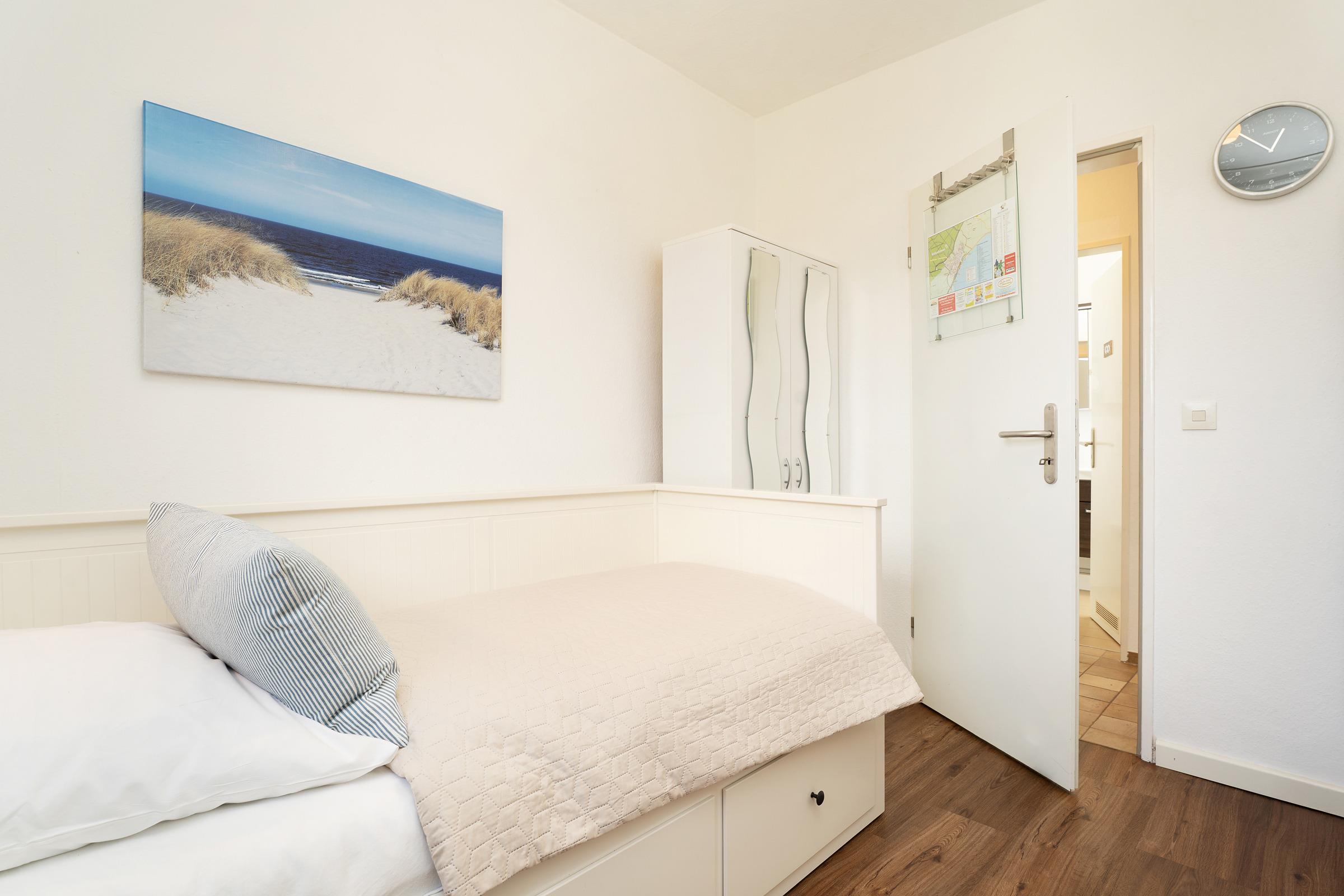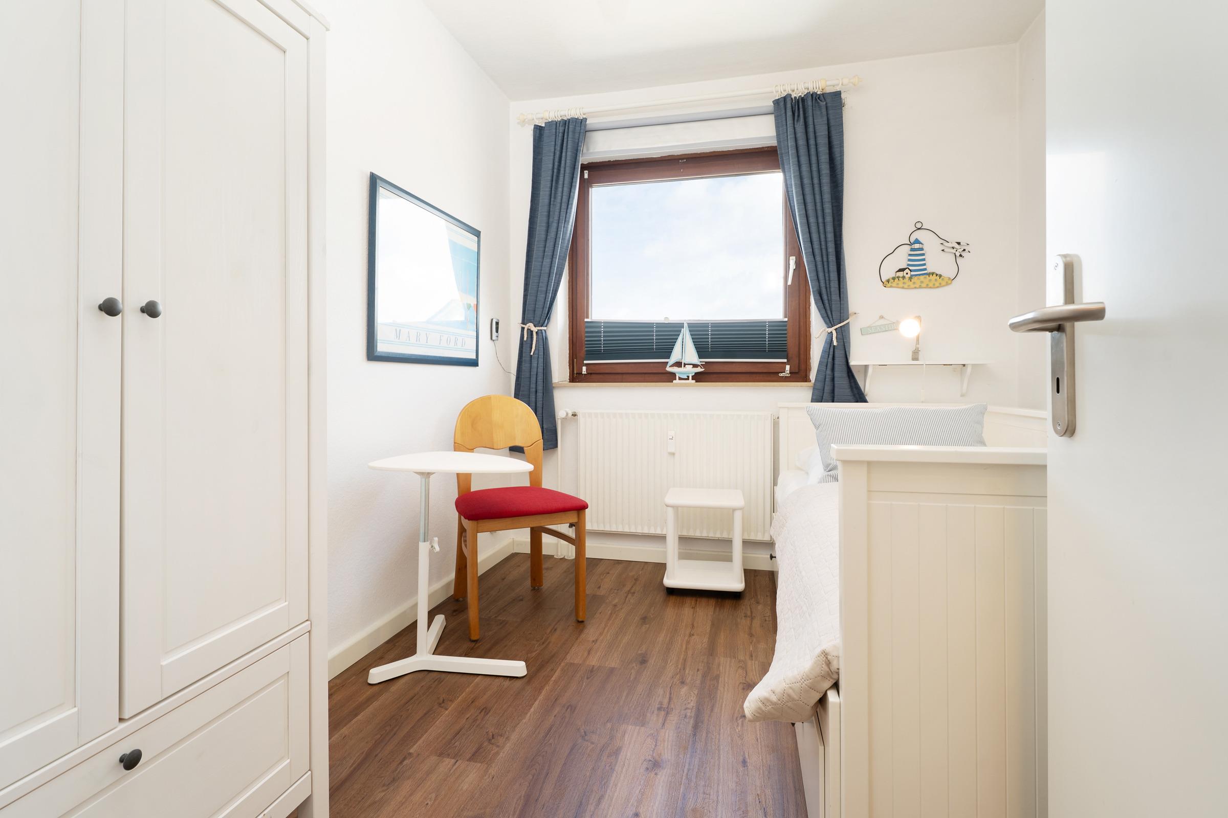 Schlafzimmer 2: 1 ausziehbares Kojenbett (2x 80x200 cm), Kleiderschrank, Verdunkelung: Plissee, Rollo & Gardinen, kein Platz für ein Babybett vorhanden