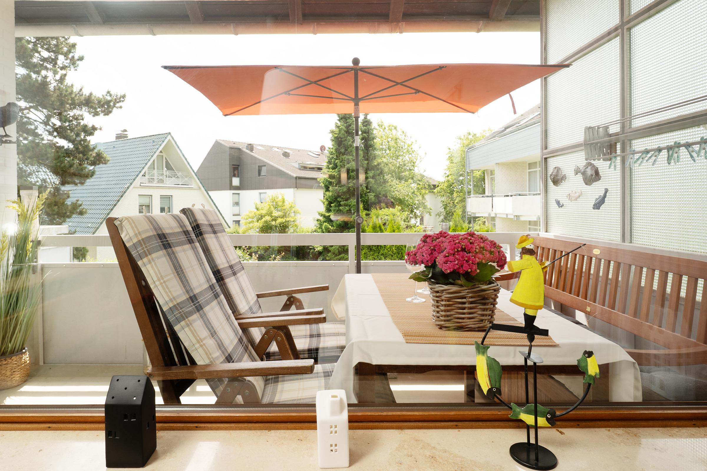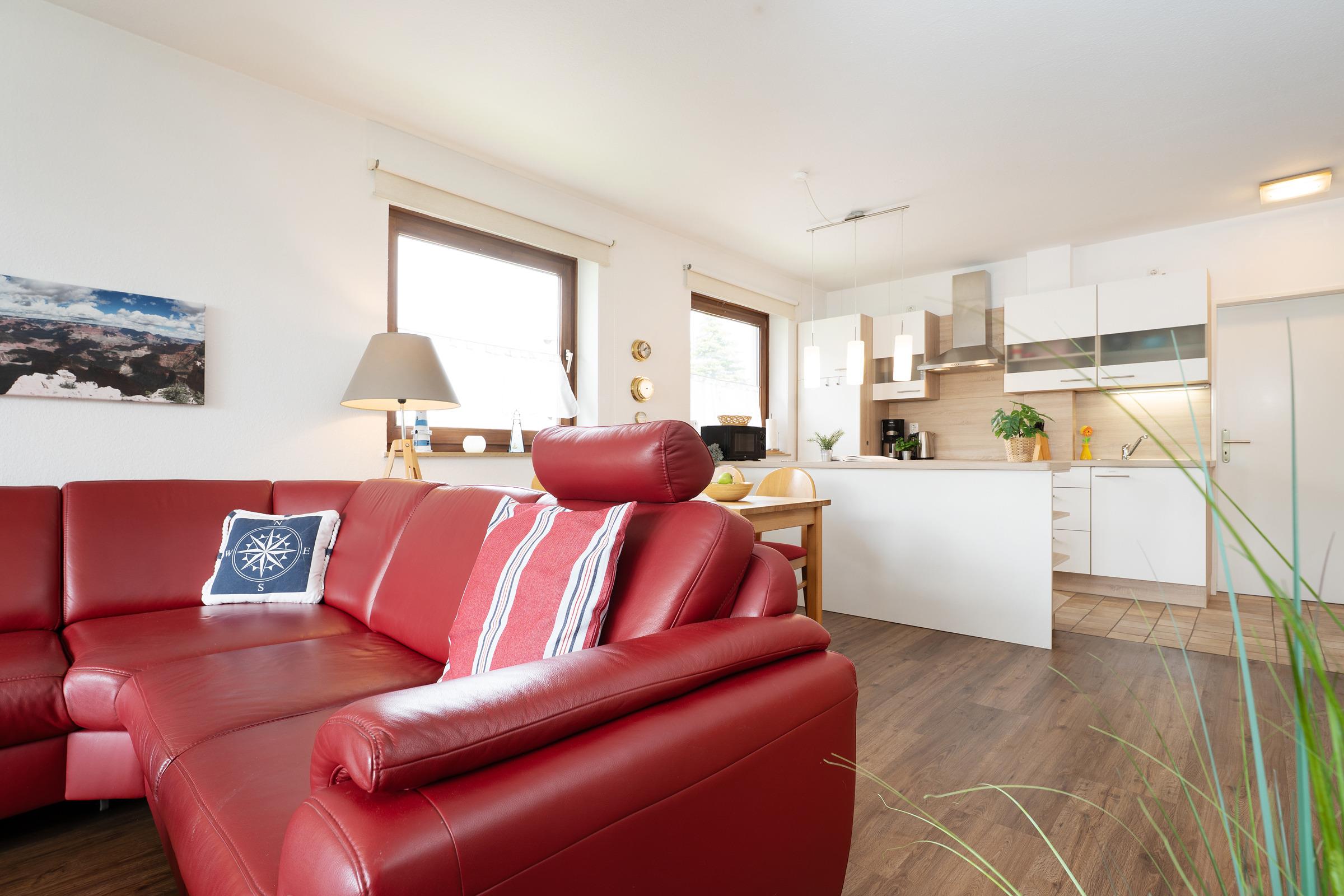 Der stilvolle Wohnbereich mit offener Küchenzeile und gemütlichem Essplatz lädt zum gemeinsamen Kochen, Genießen und Entspannen ein. Durch große Fenster fällt viel Licht und schafft eine warme, einladende Atmosphäre. Auf dem sonnigen Südbalkon lässt es sich herrlich frühstücken oder den Tag bei einem Glas Wein ausklingen – ein perfekter Rückzugsort für laue Abende.
