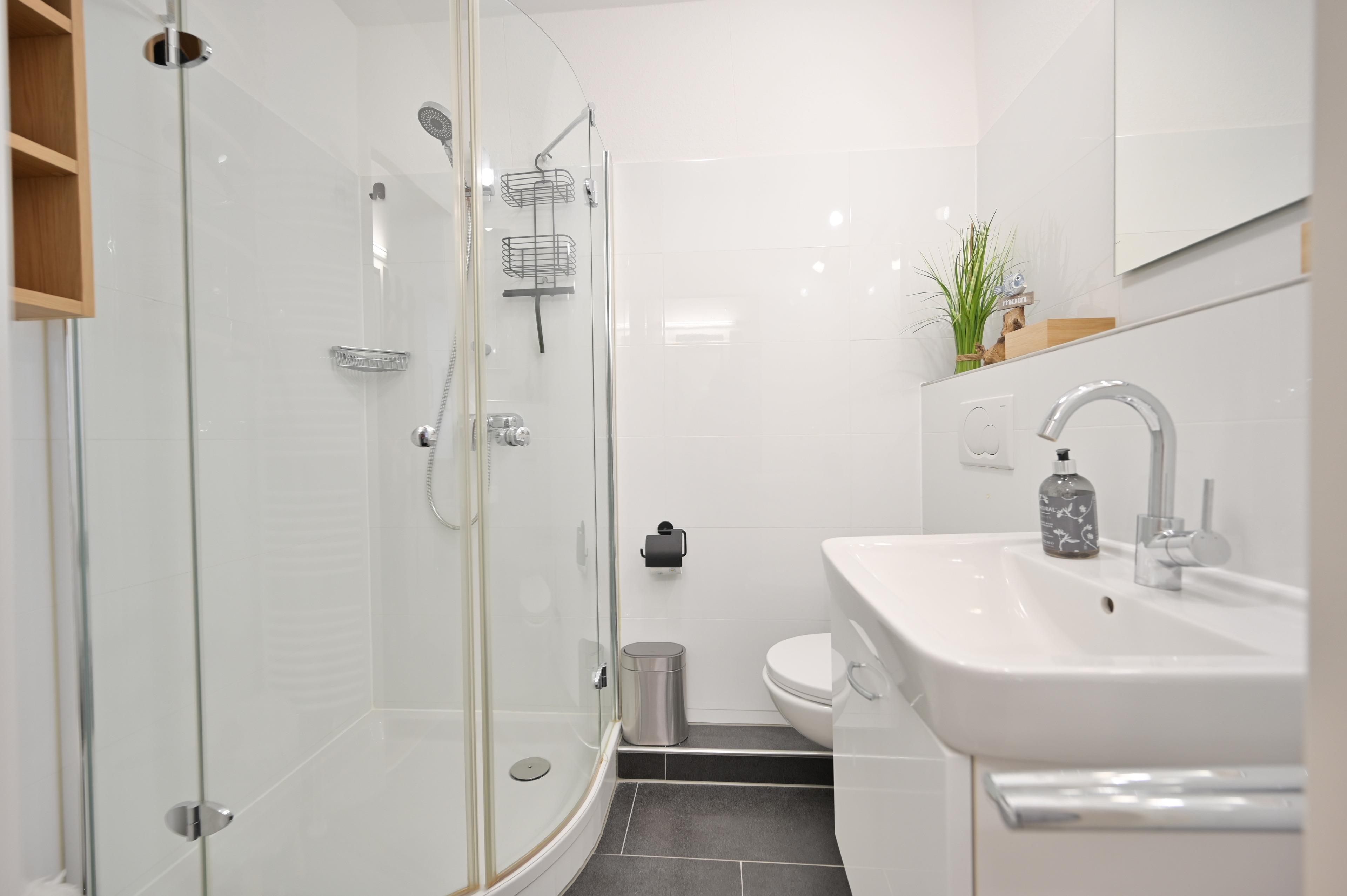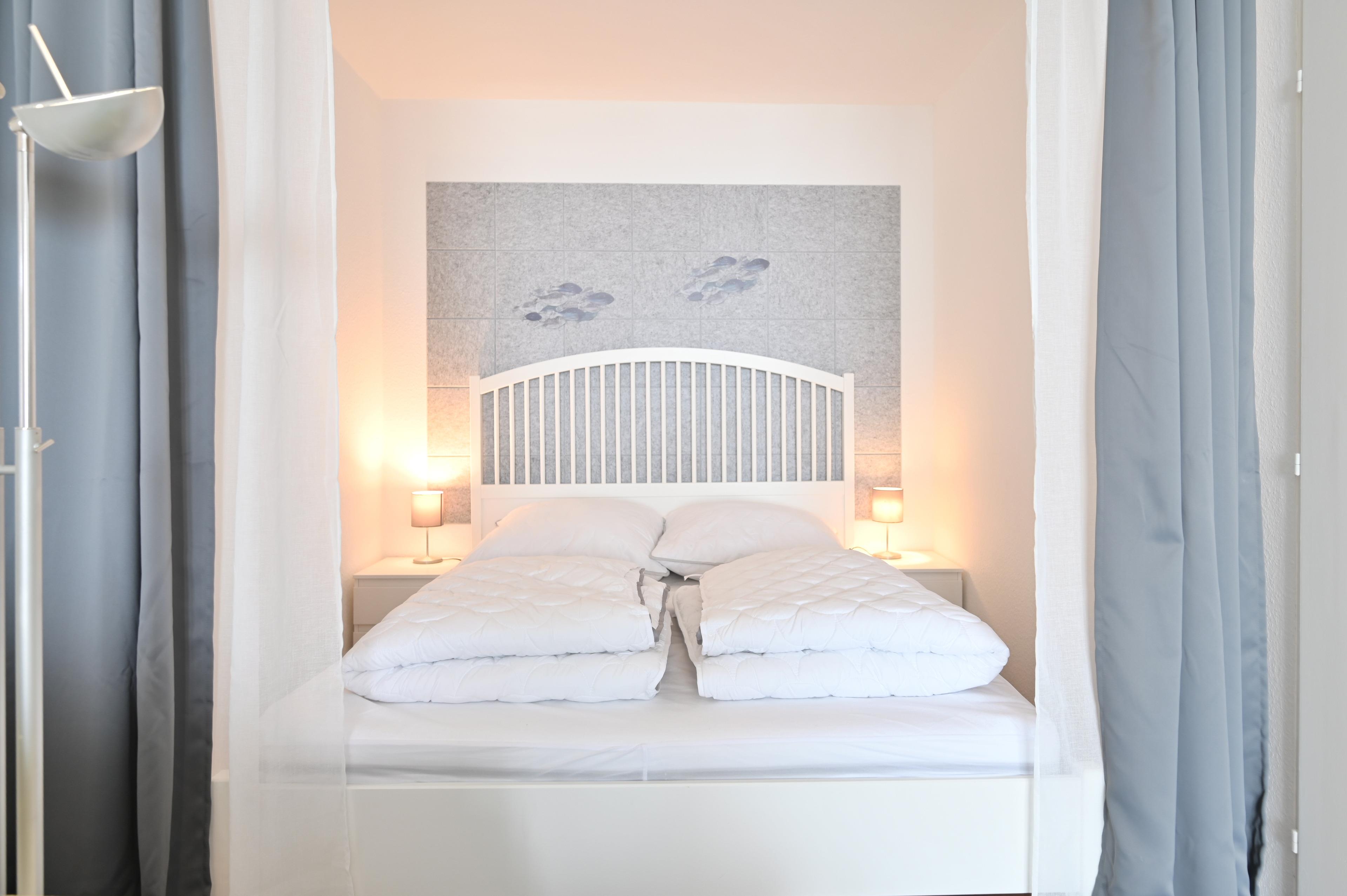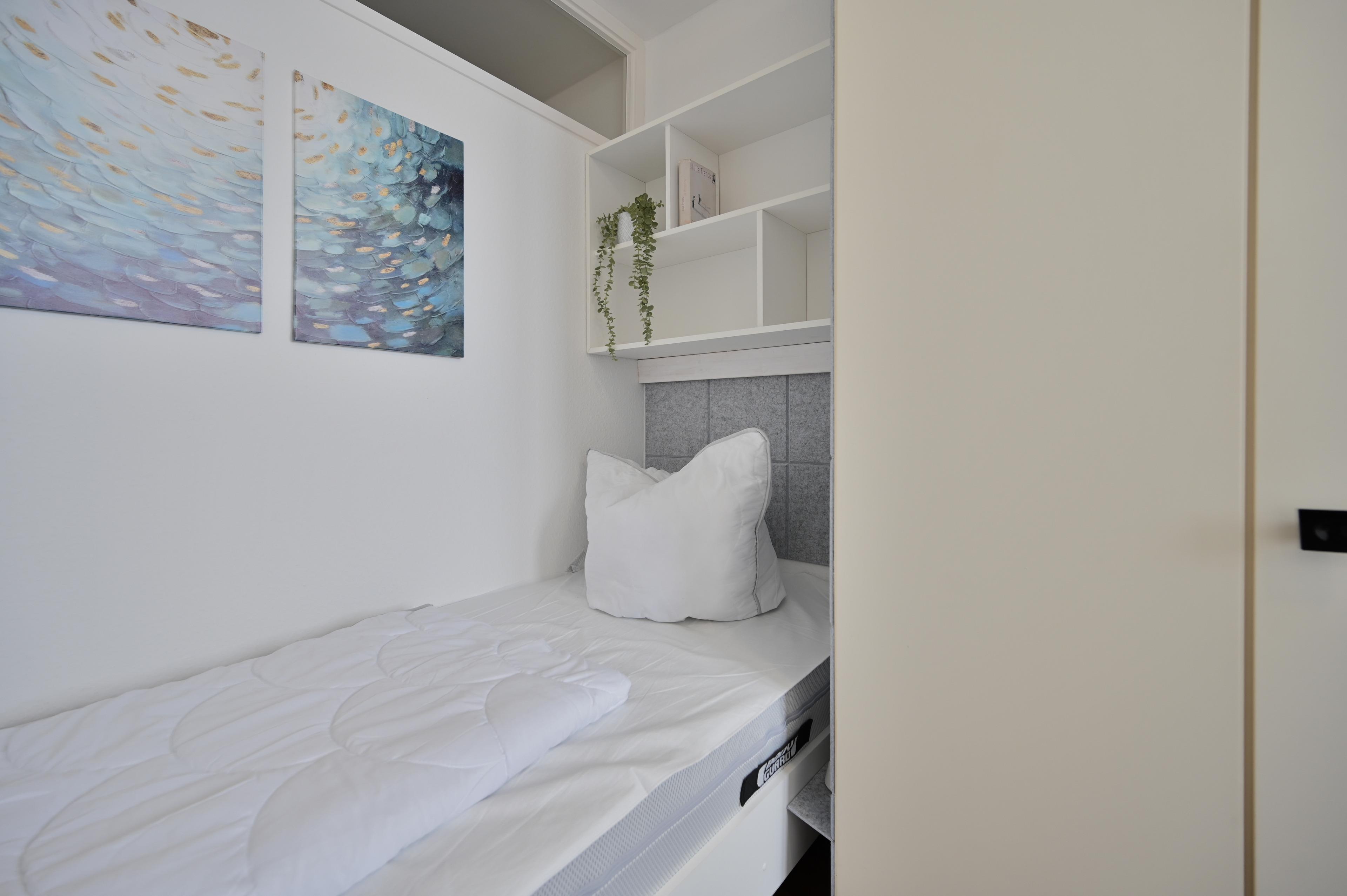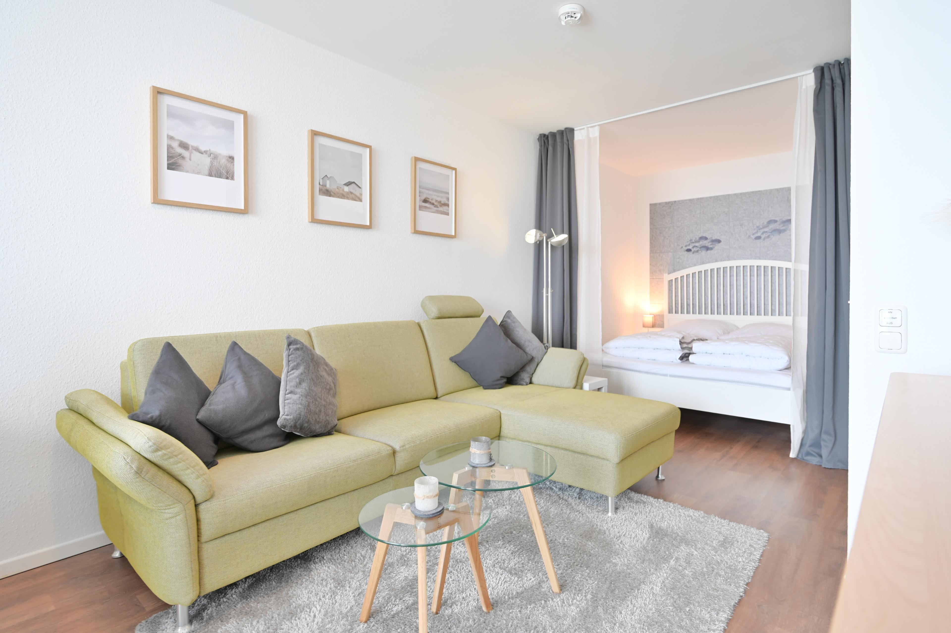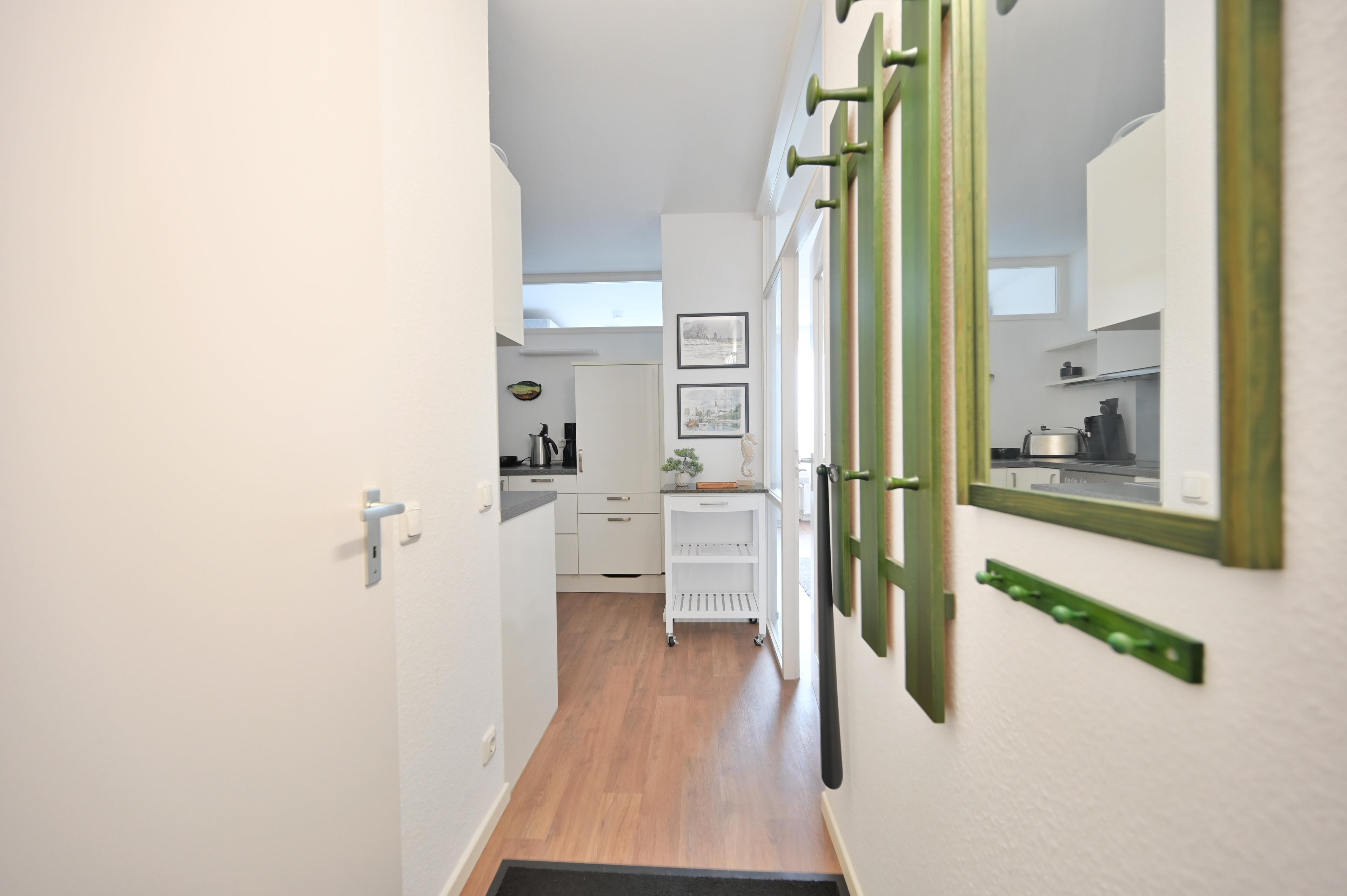Die Wohnung ist liebevoll und modern eingerichtet und bietet jeden nötigen Komfort, den man sich für seinen Urlaub wünscht. Auf 43 qm erstrecken sich ein kleiner Flur, ein helles Duschbad, eine gut ausgestattete Küche, sowie ein Wohnraum mit Schlafnische und ein separates Schlafzimmer. Letzteres verfügt über zwei gemütliche Betten (90 x 200 cm) und einen großen Kleiderschrank. Im Wohnraum lädt ein großes Sofa zum Chillen oder Fernsehen ein. Am Fenster befindet sich ein Esstisch mit 4 Stühlen (einer davon dient meist als Ablage im Schlafzimmer). Die Schlafnische ist sehr gemütlich und kann durch einen Vorhang vom restlichen Zimmer getrennt werden (Bett 160 cm breit)