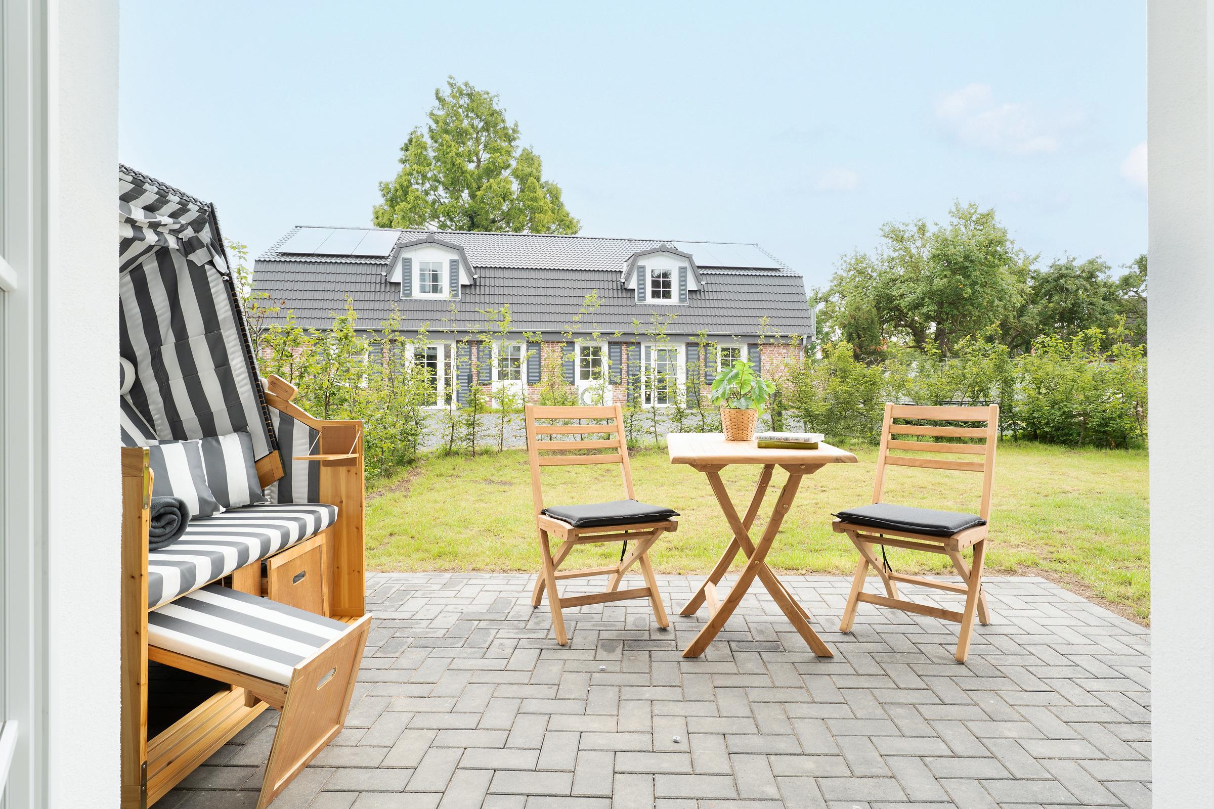 Moderne Ferienwohnung mit Terrasse nahe Strand und Apfelgarten in Kellenhusen, ideal für entspannte Urlaubstage an der Ostsee.