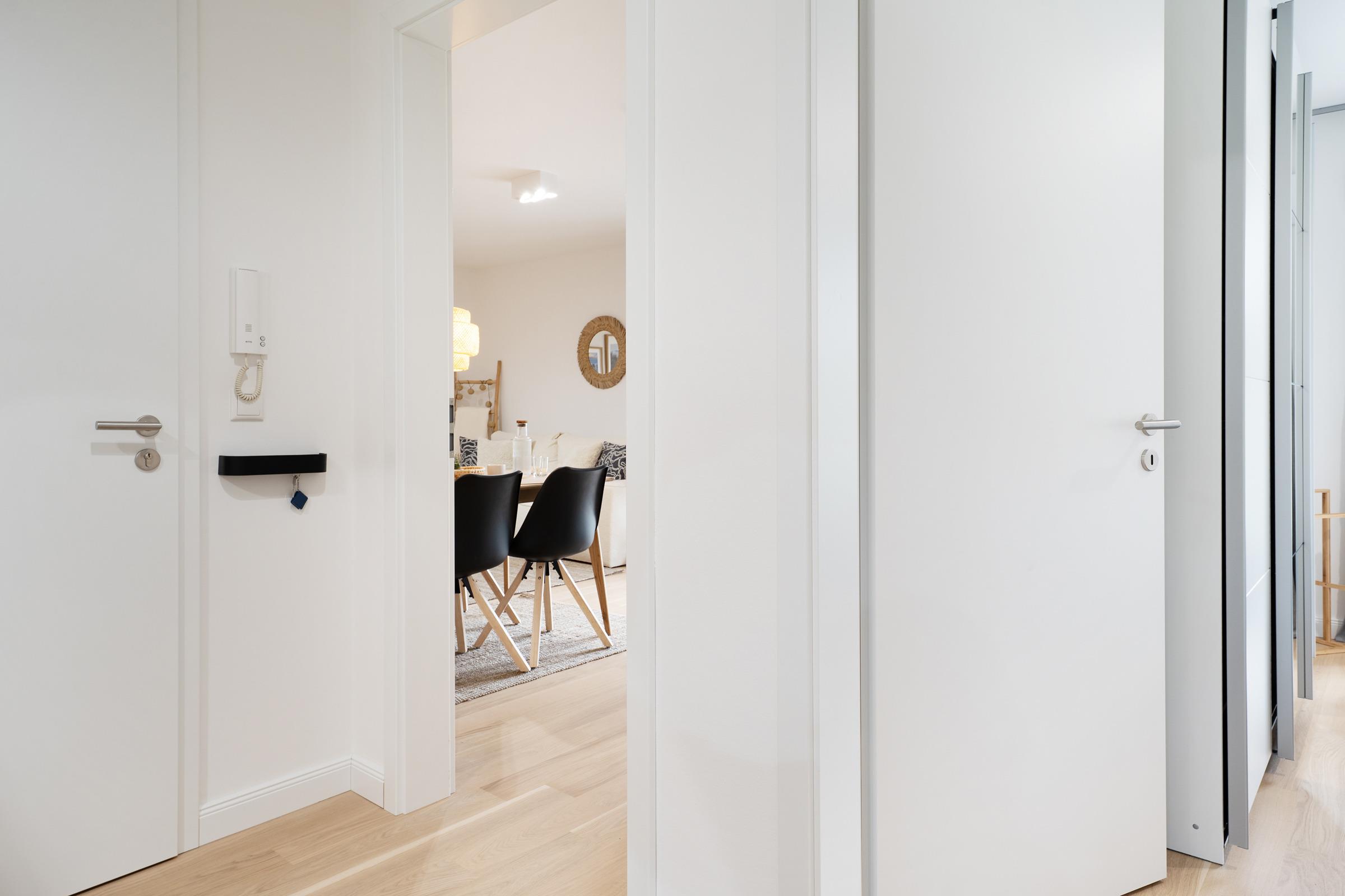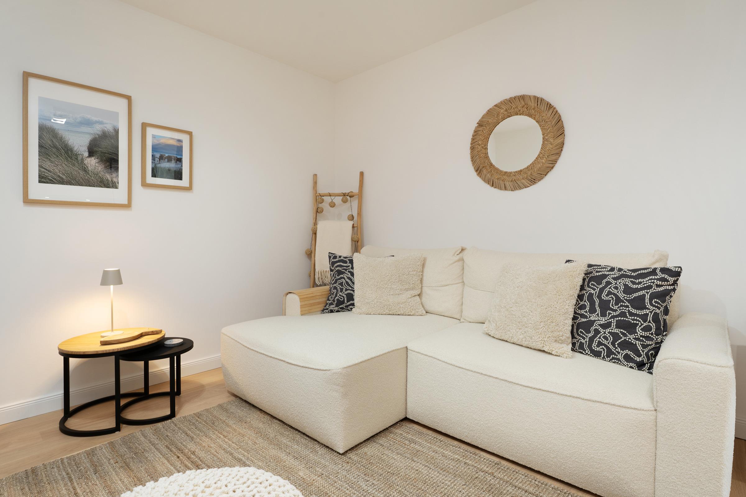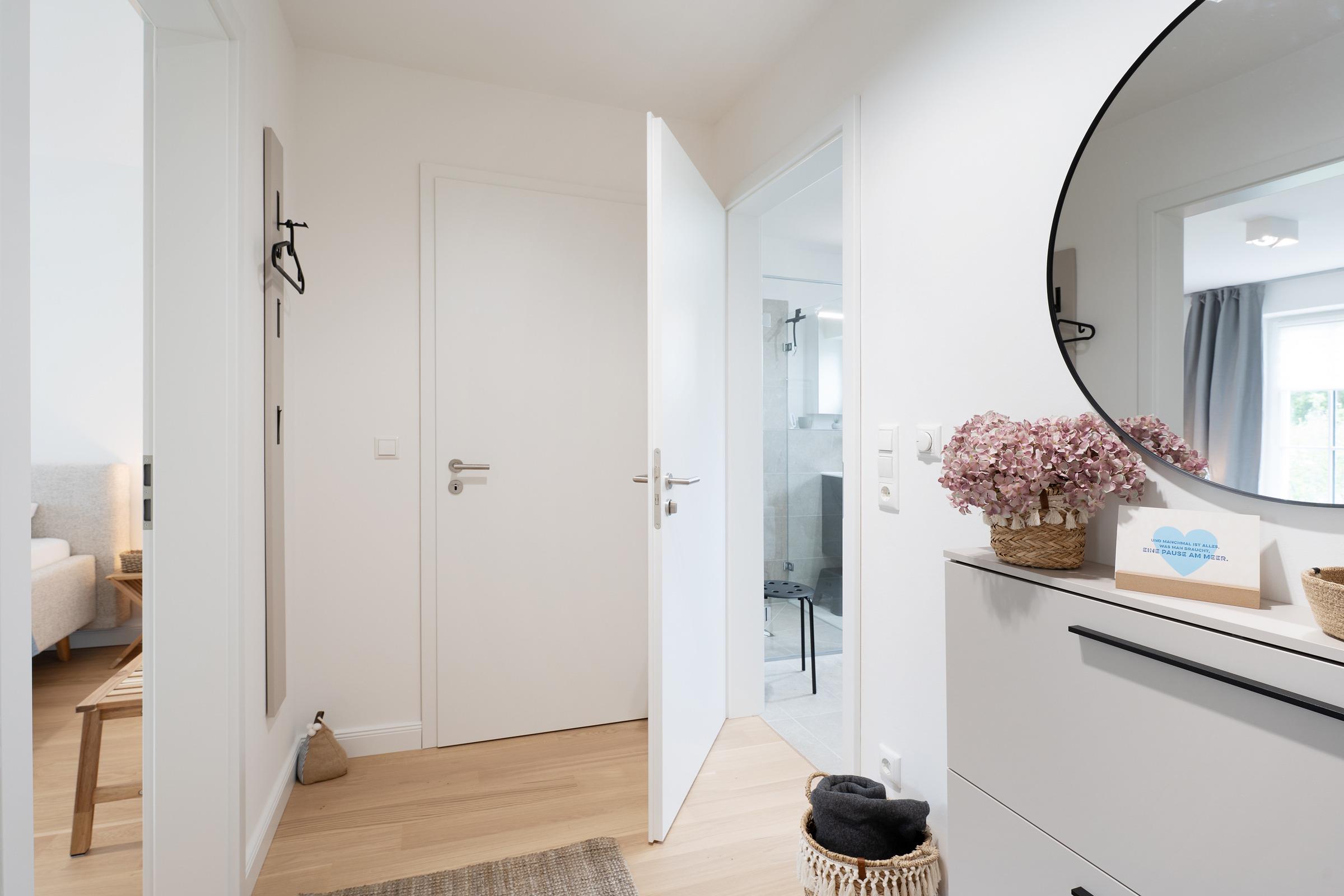 Diese helle und stilvoll eingerichtete Ferienwohnung im Erdgeschoss erwartet Sie mit modernster Ausstattung in traumhafter Lage neben einem Apfelgarten. Der kombinierte Wohn- und Essbereich bietet einen komfortablen Rückzugsort mit Fernseher und direktem Zugang zur möblierten Terrasse – hier können Sie bei frischer Ostseeluft entspannen oder gemütliche Grillabende verbringen.