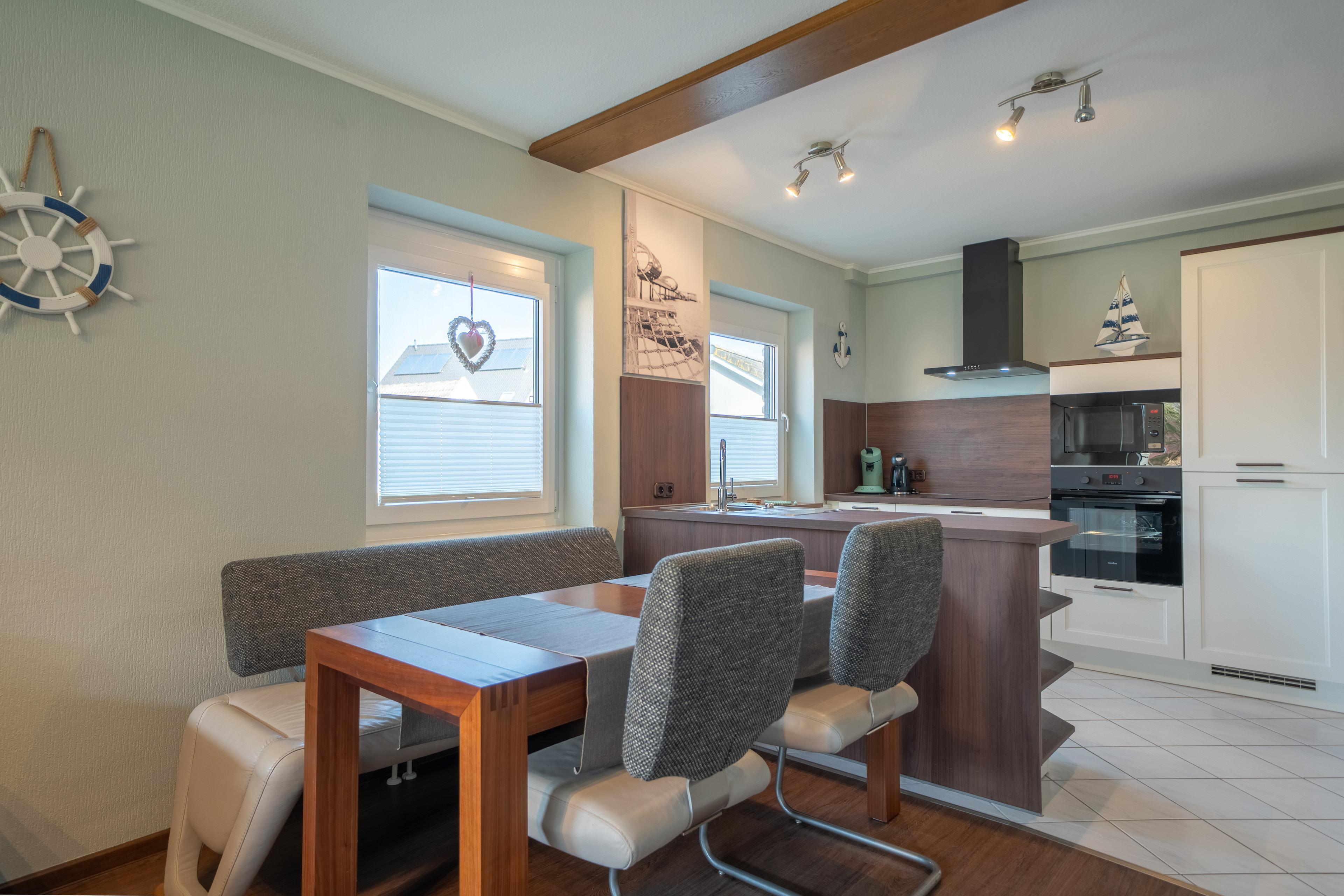 Cerankochfeld, Geschirrspüler, Backofen, Mikrowelle und einem Kühlschrank sowie Gefrierschrank ausgestattet.