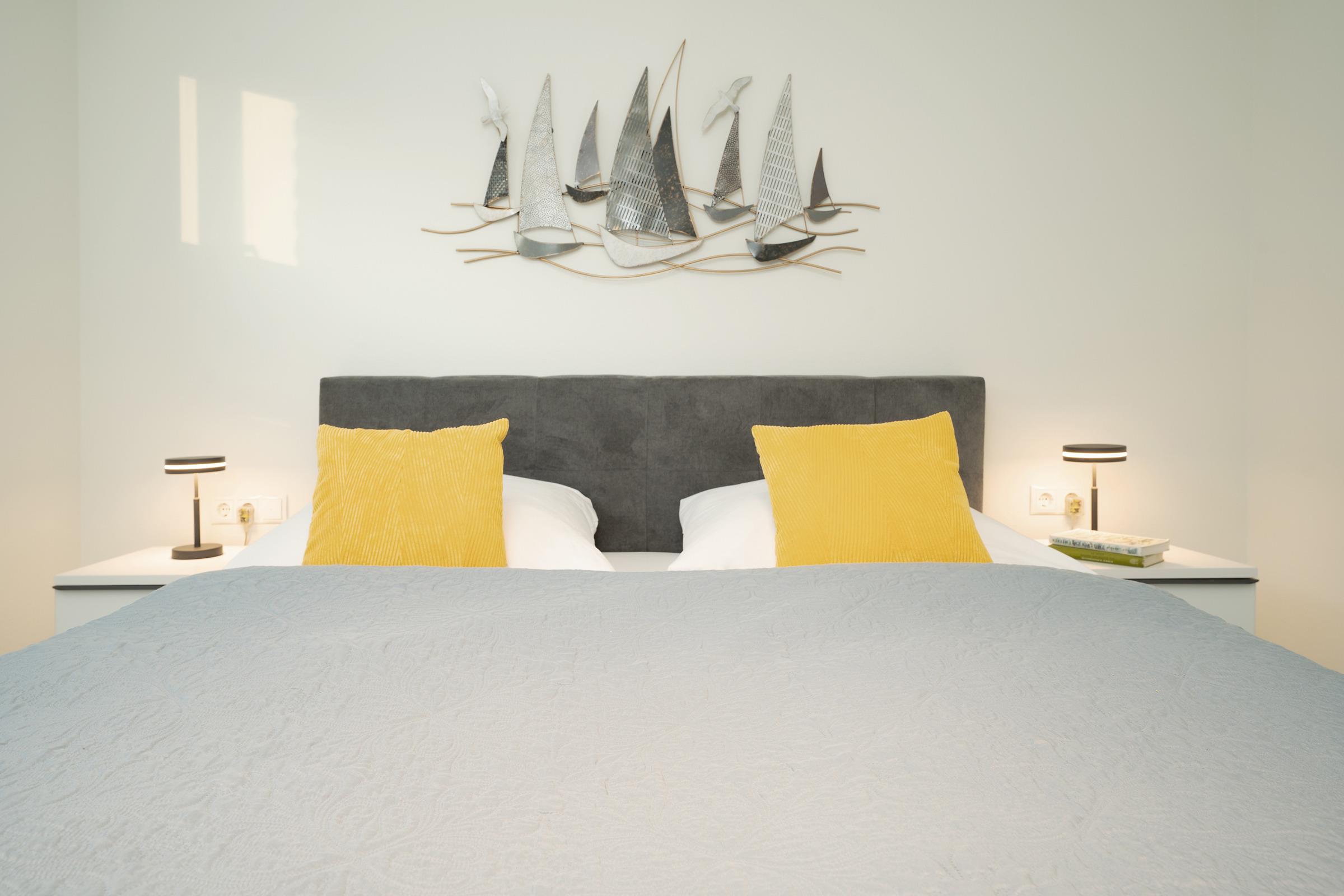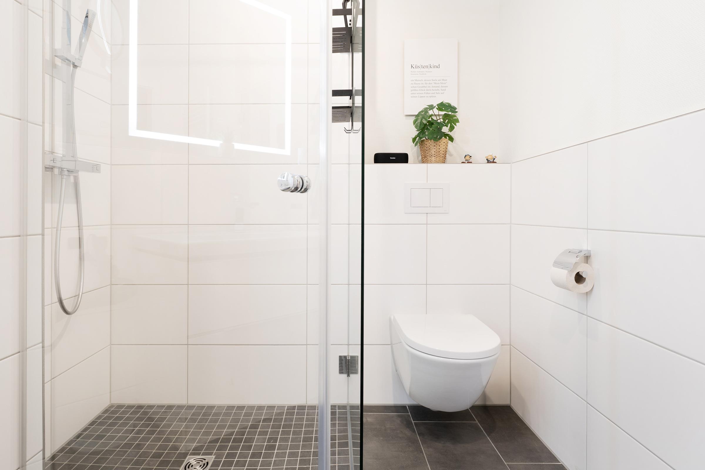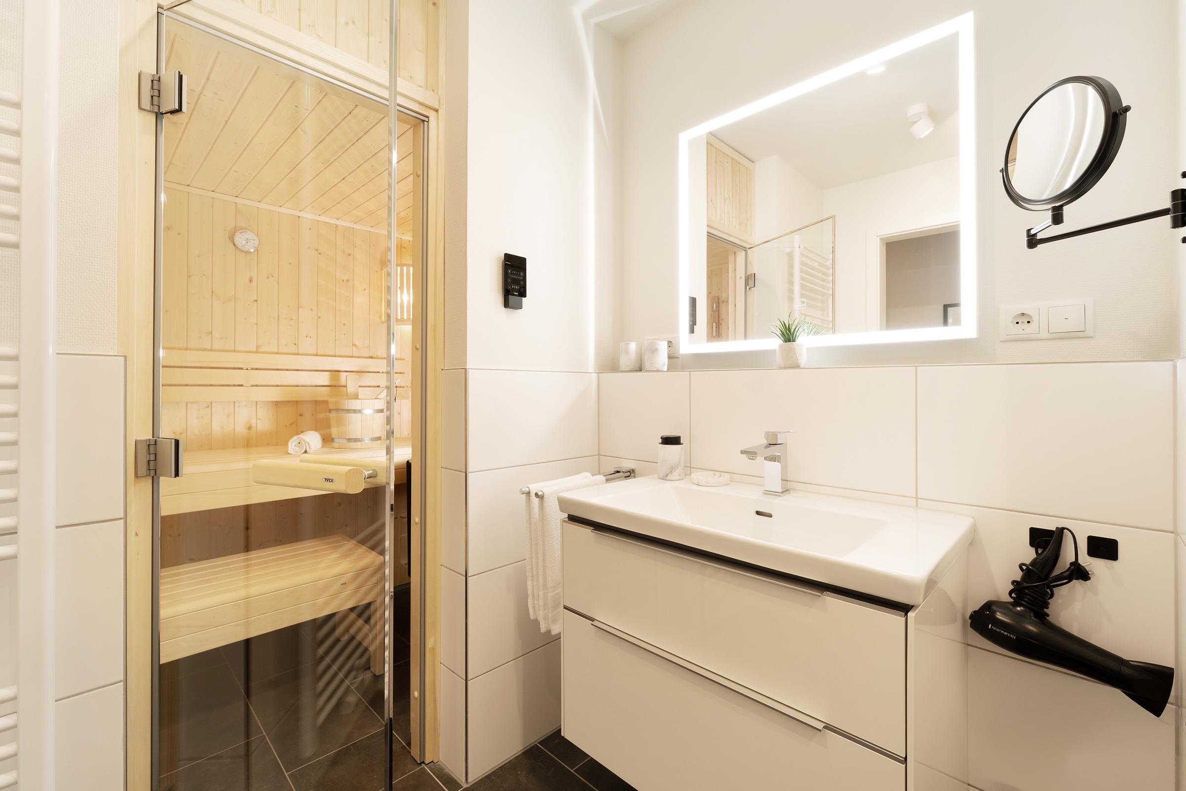 Diese moderne Ferienwohnung im 1. Obergeschoss besticht durch ihre helle und freundliche Einrichtung sowie die komfortable Ausstattung. Der offene Wohnbereich lädt mit einer gemütlichen Sofaecke, Flachbild-TV und Zugang zum sonnigen Balkon ein. Hier genießen Sie den Blick nach Süden und können wunderbar entspannen. Für besonders heiße Tage ist eine Markise vorhanden. Die angrenzende Küche ist voll ausgestattet und verfügt über Backofen, Induktionskochfeld, Geschirrspülmaschine, Kühlschrank mit Gefrierfach, Kaffeemaschine und Wasserkocher – ideal, um Ihre Lieblingsgerichte auch im Urlaub zuzubereiten. Der Essbereich bietet ausreichend Platz für gemeinsame Mahlzeiten. Im Schlafzimmer sorgt ein komfortables Doppelbett für erholsame Nächte. Das moderne Badezimmer ist mit Dusche, WC und Handtuchheizkörper ausgestattet. Als besonderes Highlight steht Ihnen hier zudem eine Sauna zur Eigennutzung zur Verfügung.