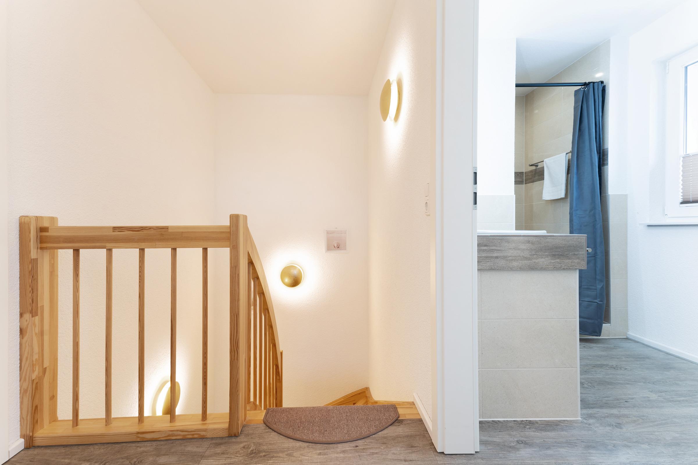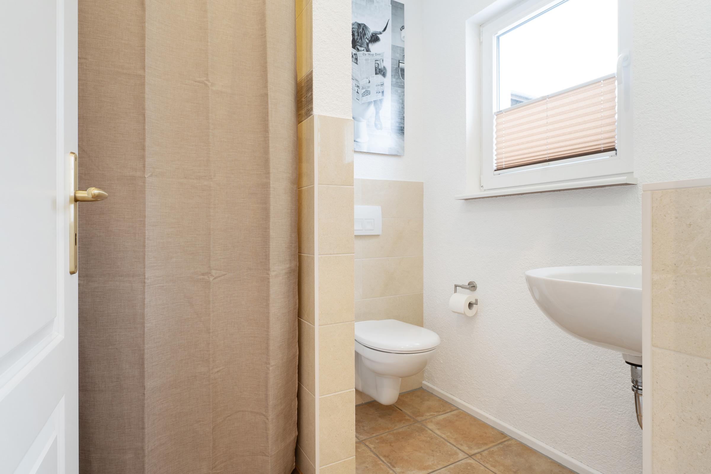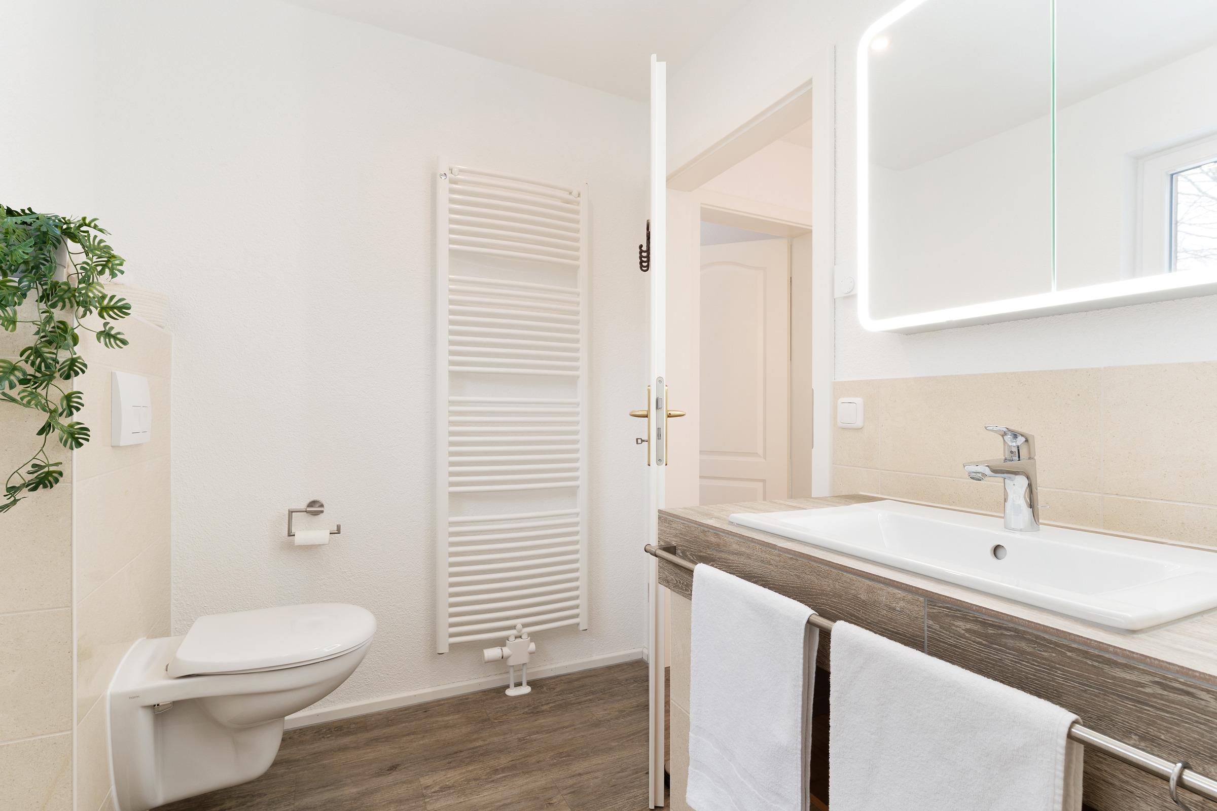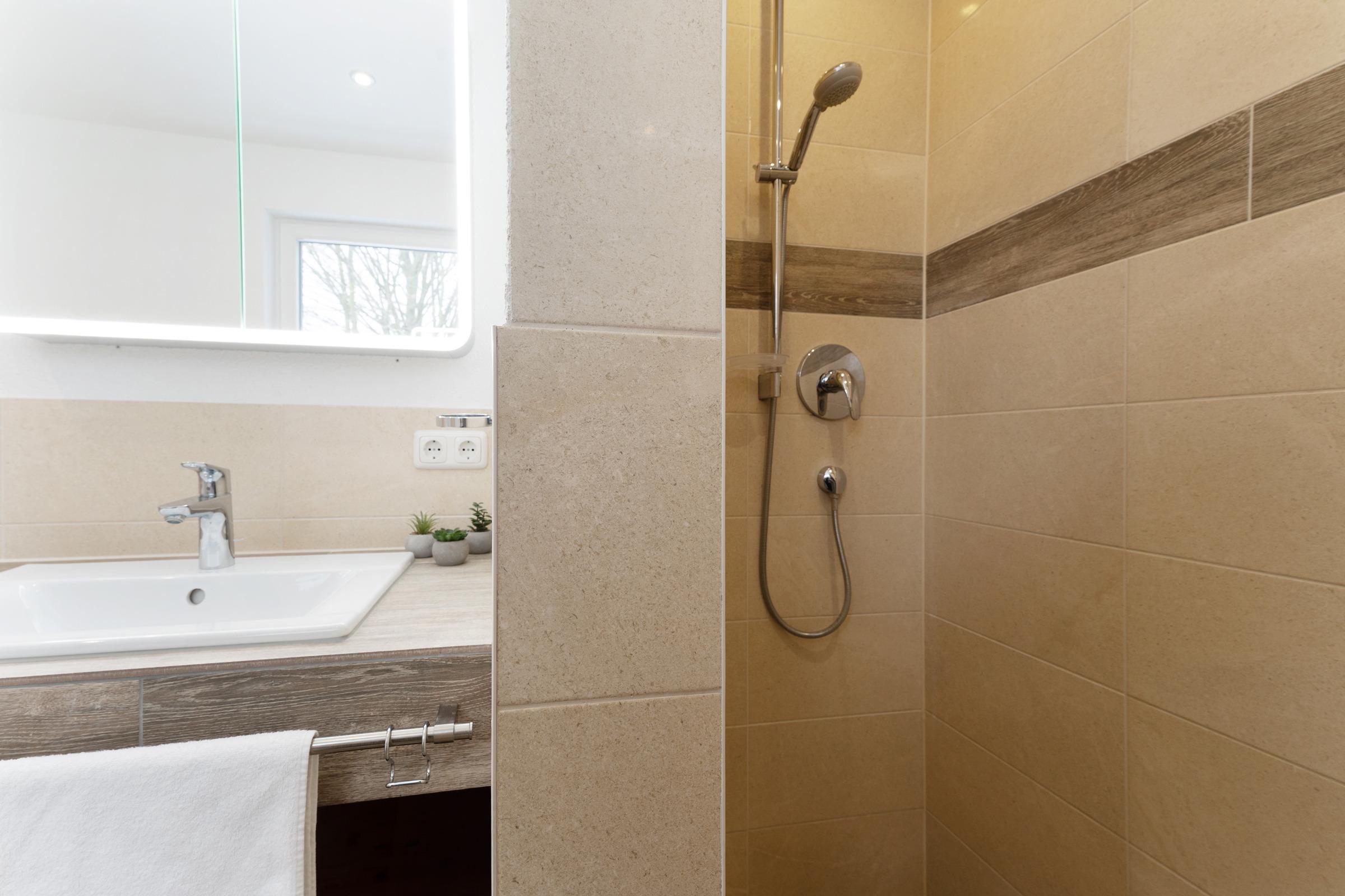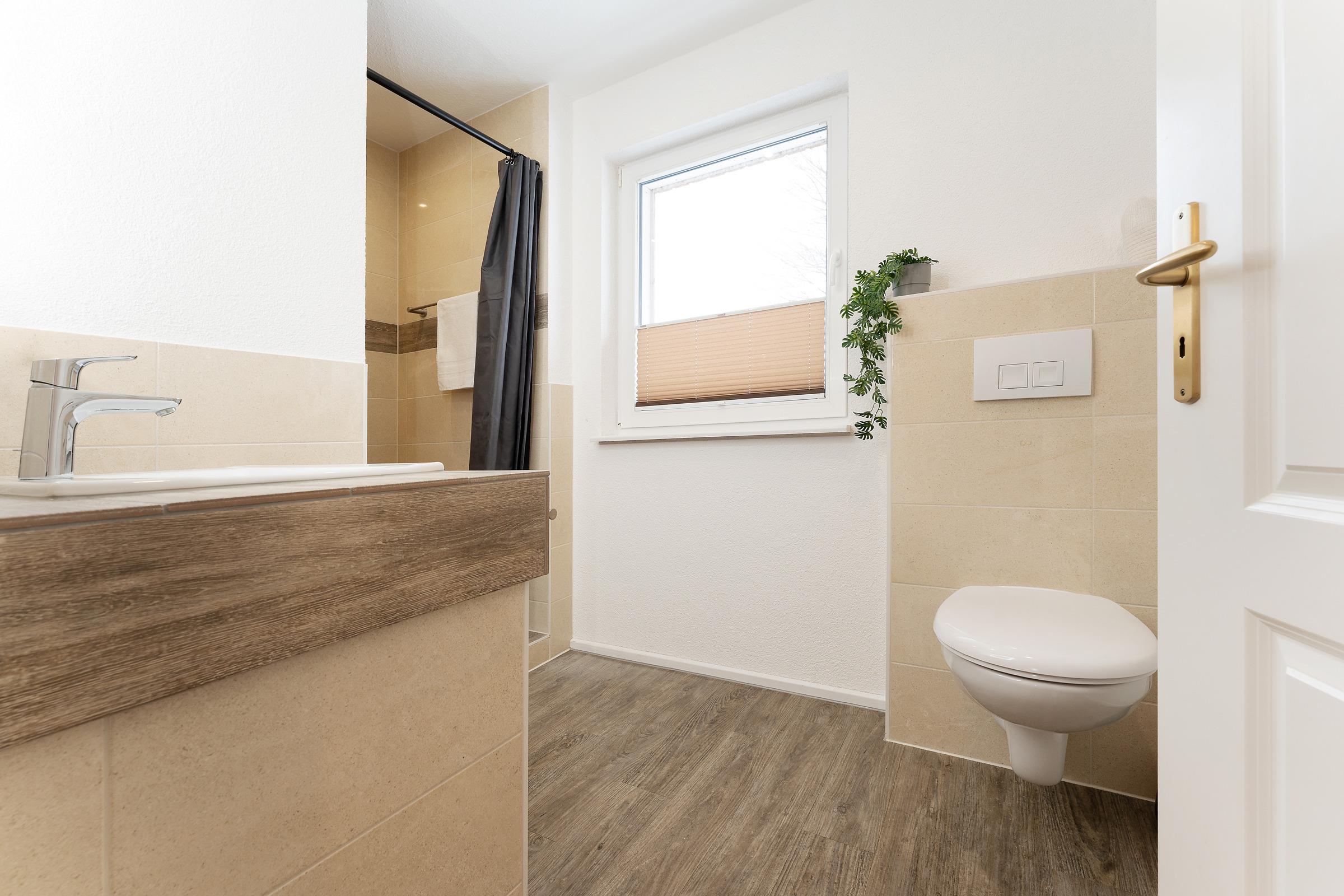 Das moderne Badezimmer verfügt über eine bodengleiche Dusche, WC, Waschbecken, Handtuchheizkörper, Fußbodenheizung und Föhn. Ergänzend stehen ein Gäste-WC im Erdgeschoss, WLAN, Fußbodenheizung im gesamten Haus, Waschmaschine, Fahrradabstellplatz sowie ein reservierter PKW-Außenstellplatz zur Verfügung.