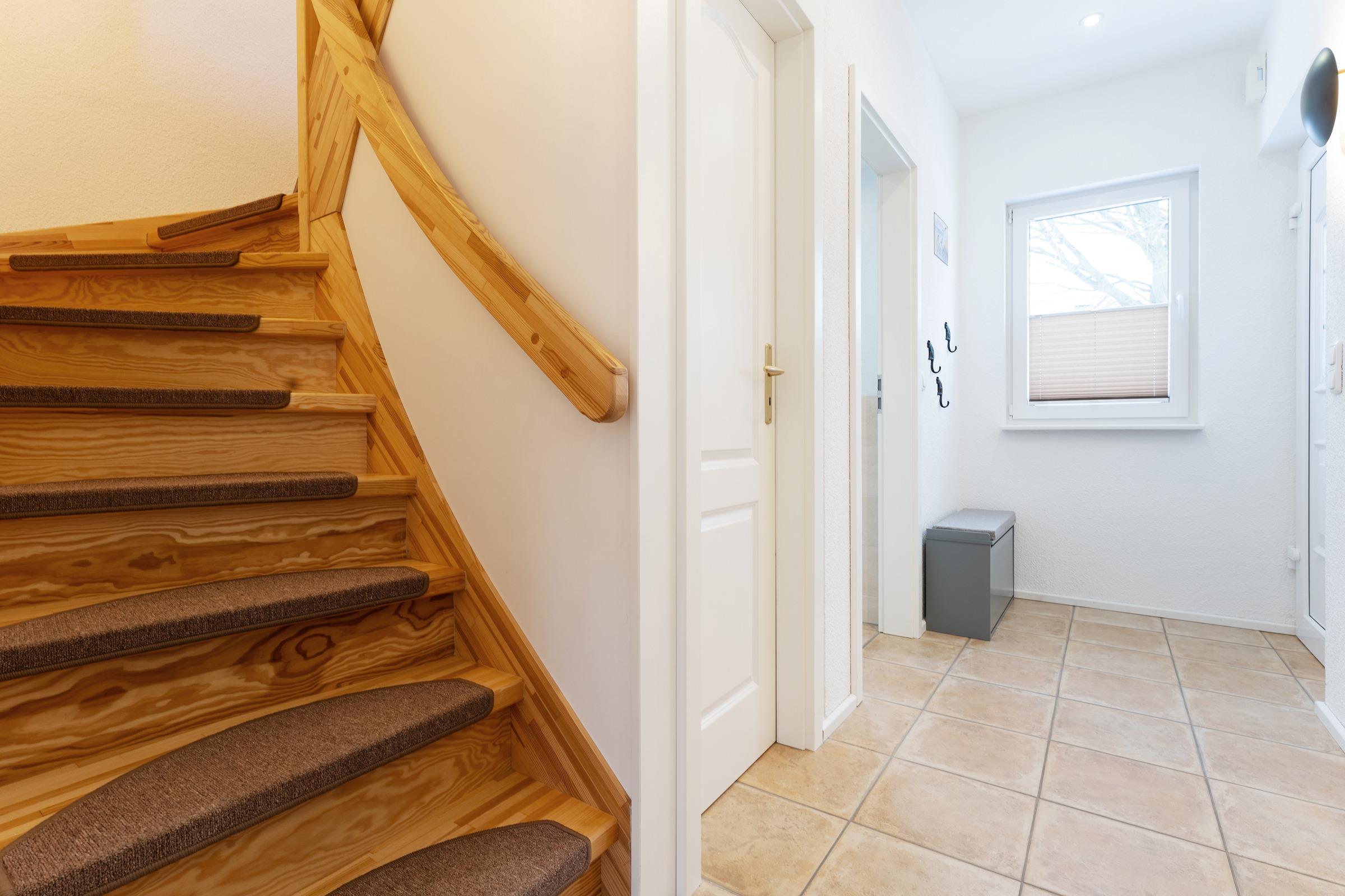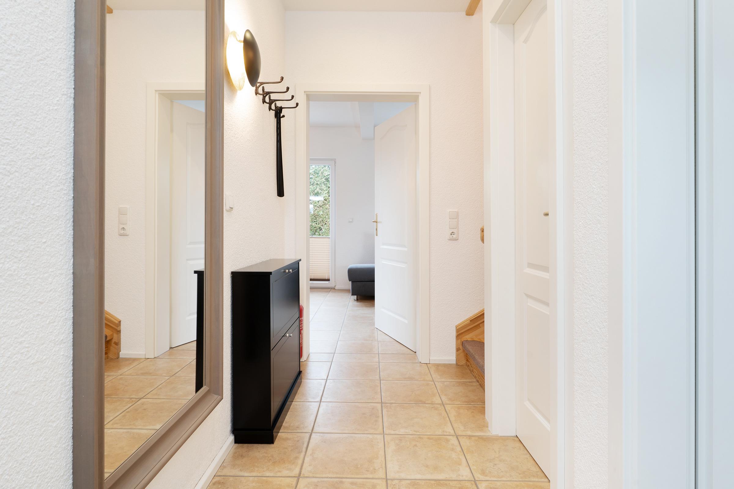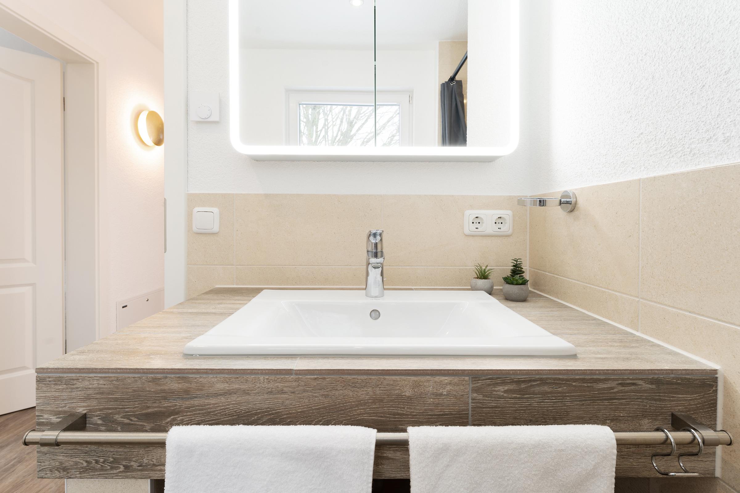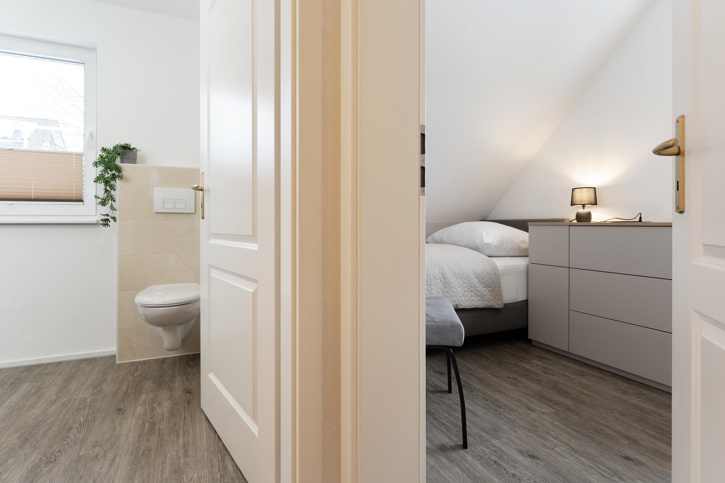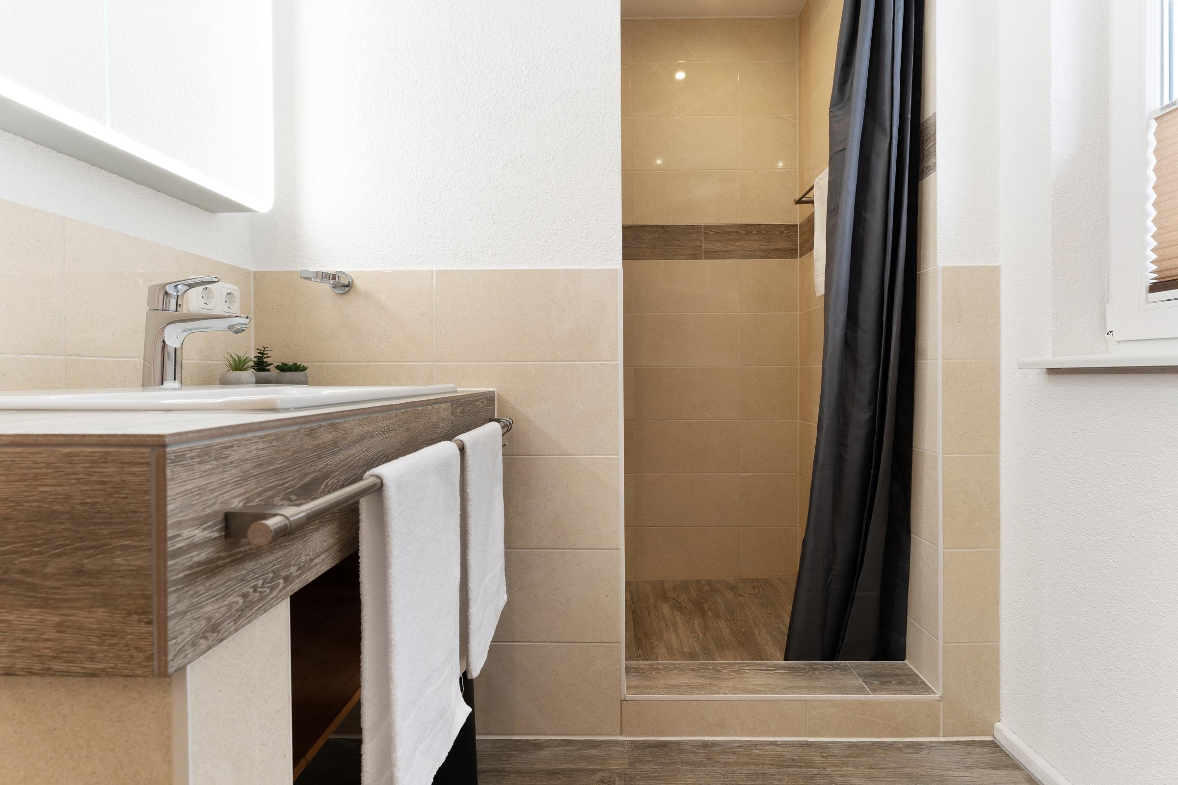 Das moderne Badezimmer verfügt über eine bodengleiche Dusche, WC, Waschbecken, Handtuchheizkörper, Fußbodenheizung und Föhn. Ergänzend stehen ein Gäste-WC im Erdgeschoss, WLAN, Fußbodenheizung im gesamten Haus, Waschmaschine, Fahrradabstellplatz sowie ein reservierter PKW-Außenstellplatz zur Verfügung.
