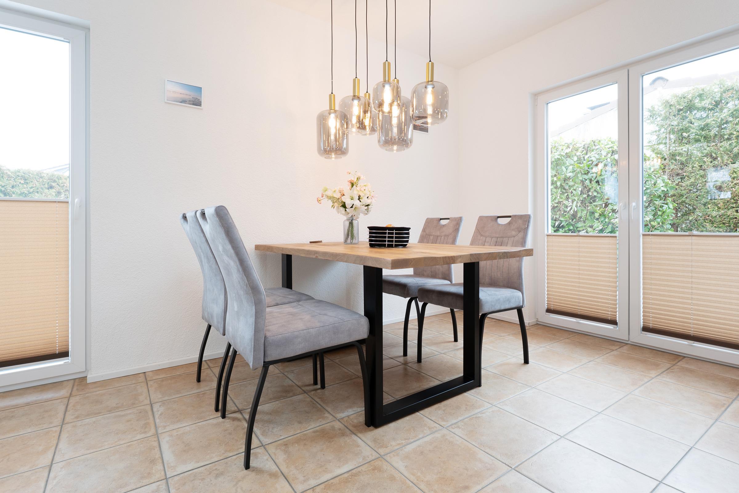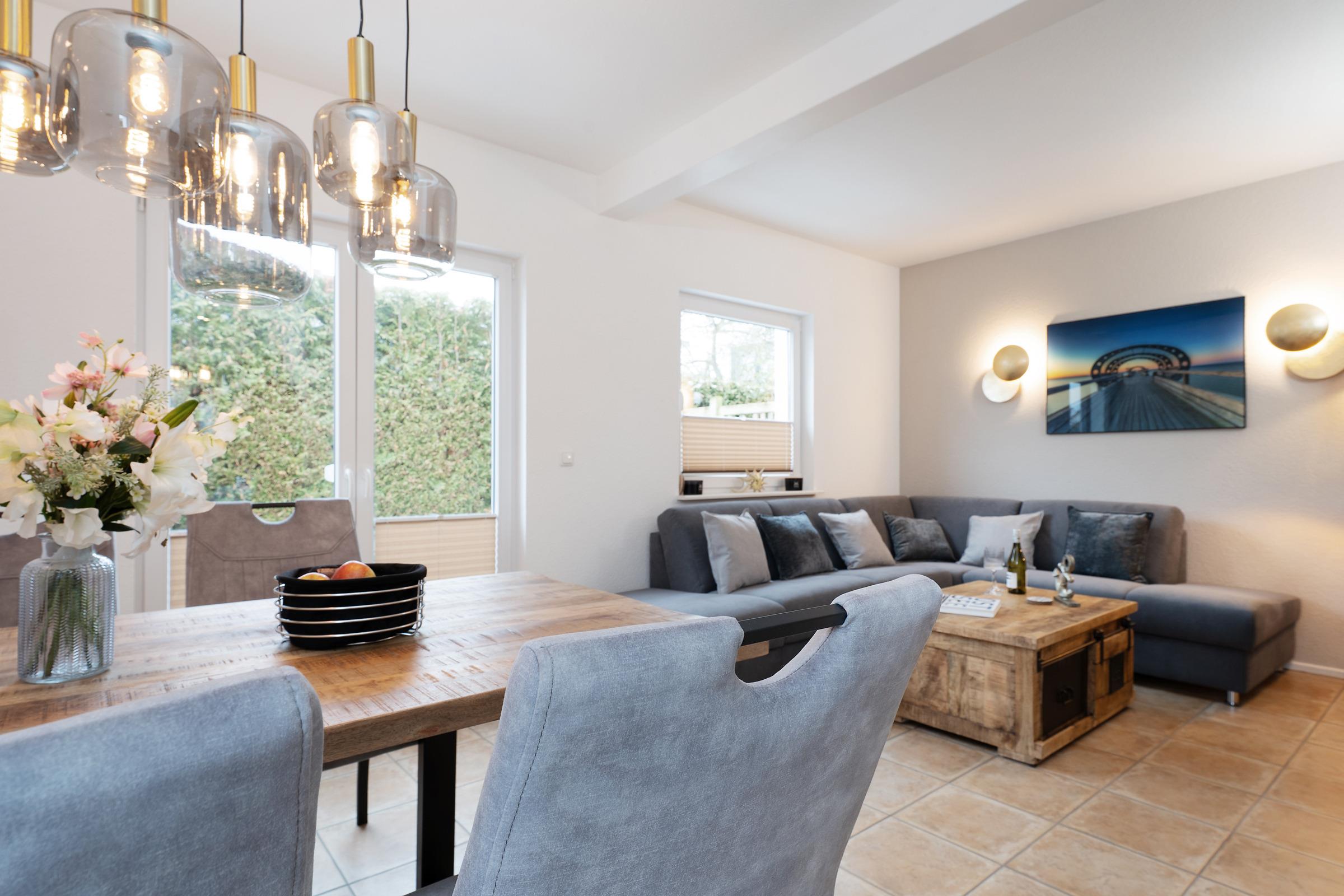 Der helle Wohnbereich mit gemütlicher Sofaecke, TV und einladendem Essplatz bildet das Herzstück des Hauses. Von hier aus gelangen Sie auf die beiden großzügigen Terrassen mit insgesamt ca. 38 m², ausgestattet mit hochwertigen Gartenmöbeln. Ob Frühstück in der Morgensonne, entspanntes Lesen oder ein geselliger Grillabend – hier finden Sie Ihren persönlichen Lieblingsplatz im Freien.